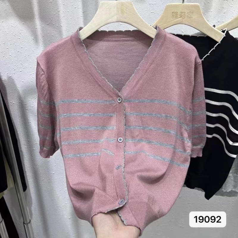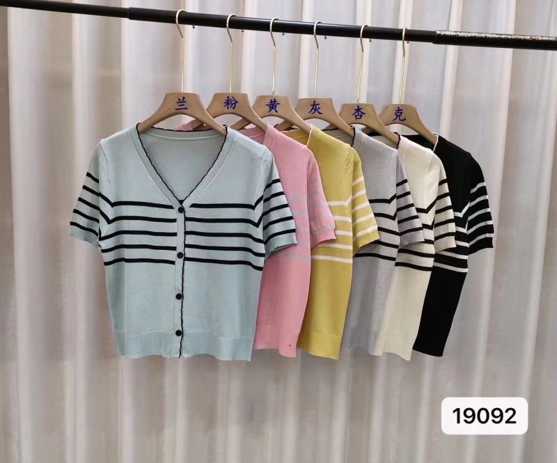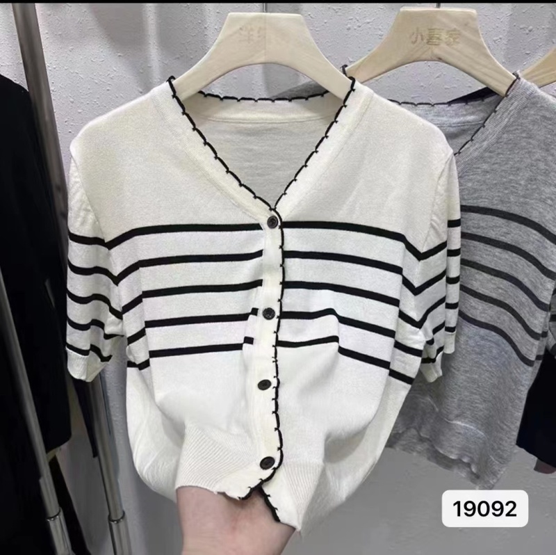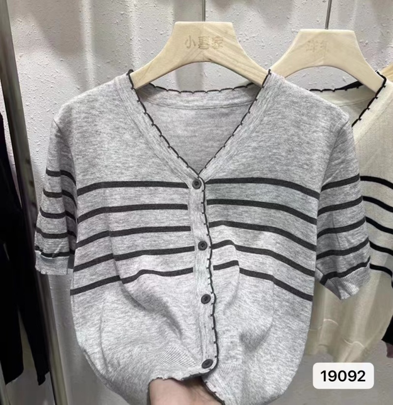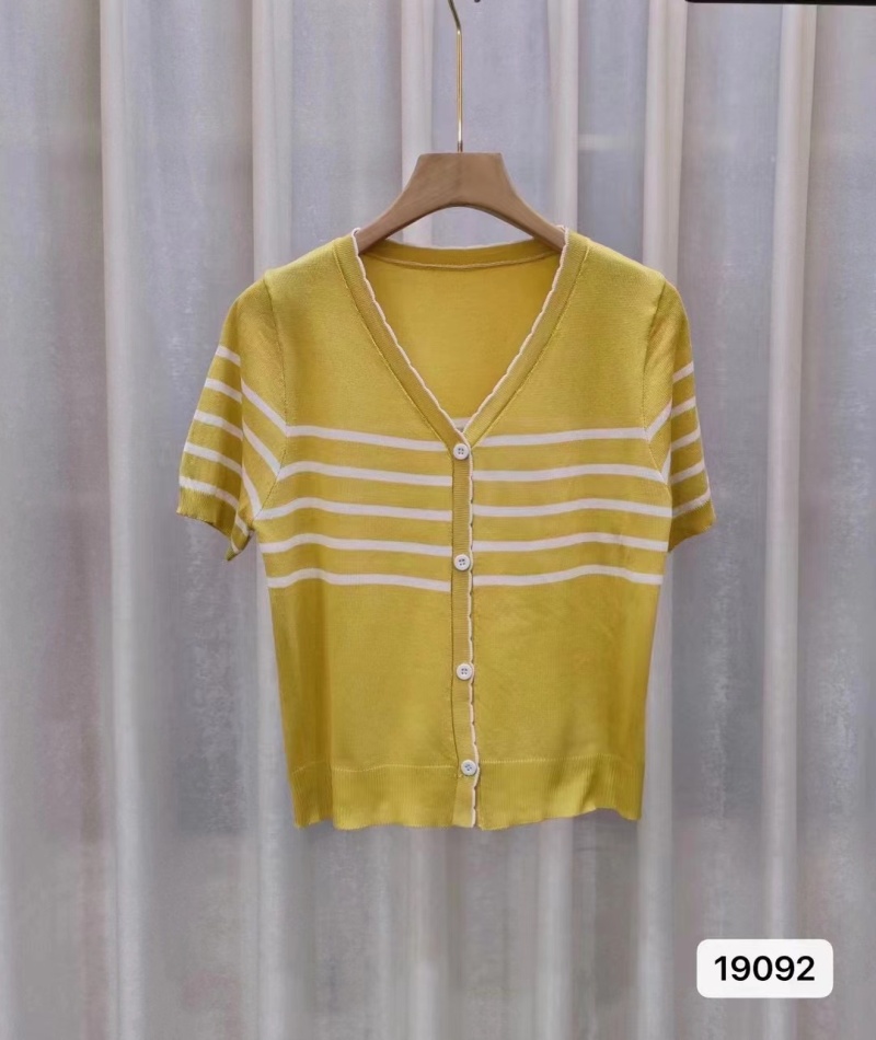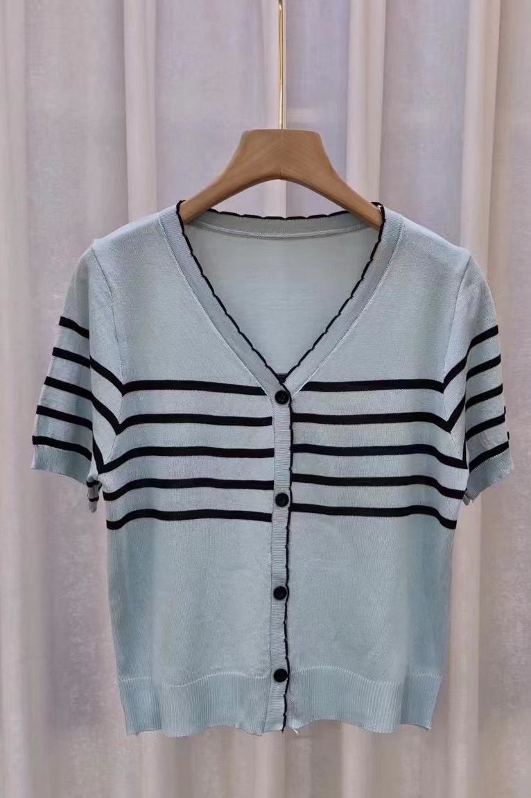 夏季新款2023年拼色条纹花边单排扣针织衫女短袖百搭条纹百搭上衣