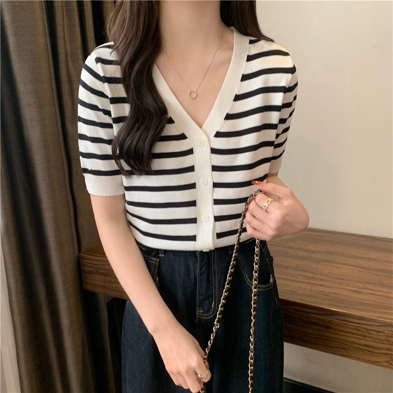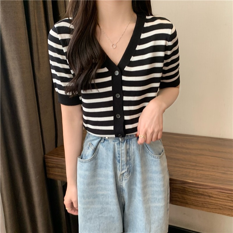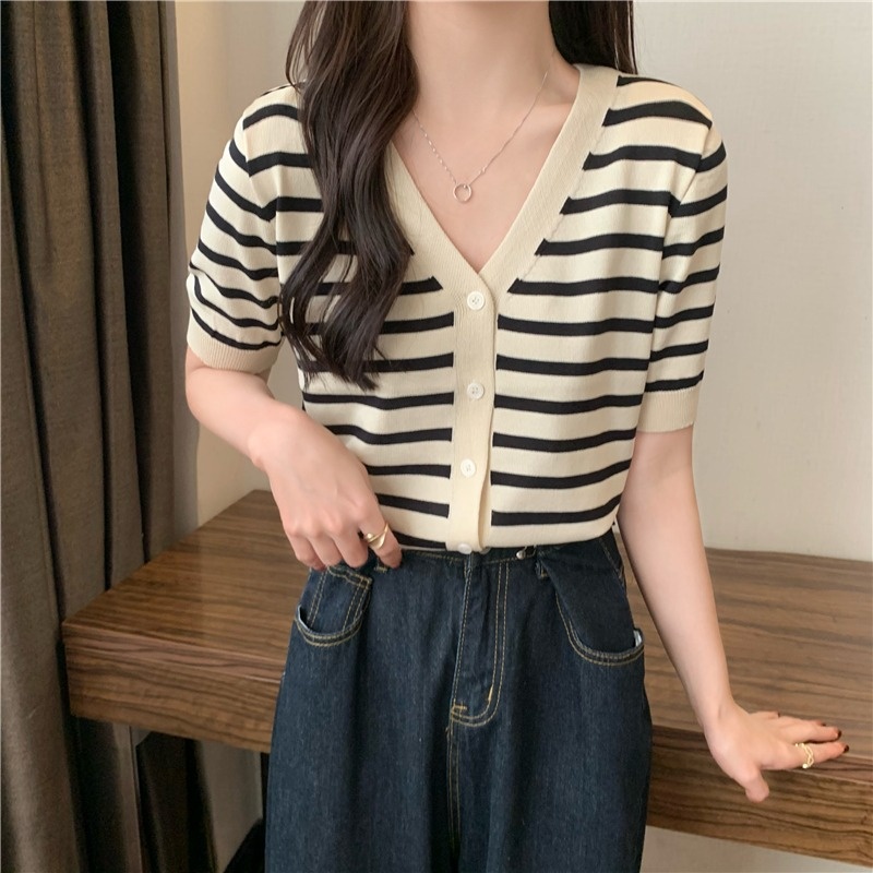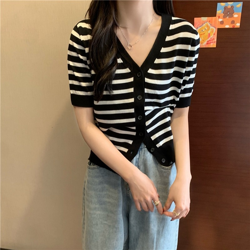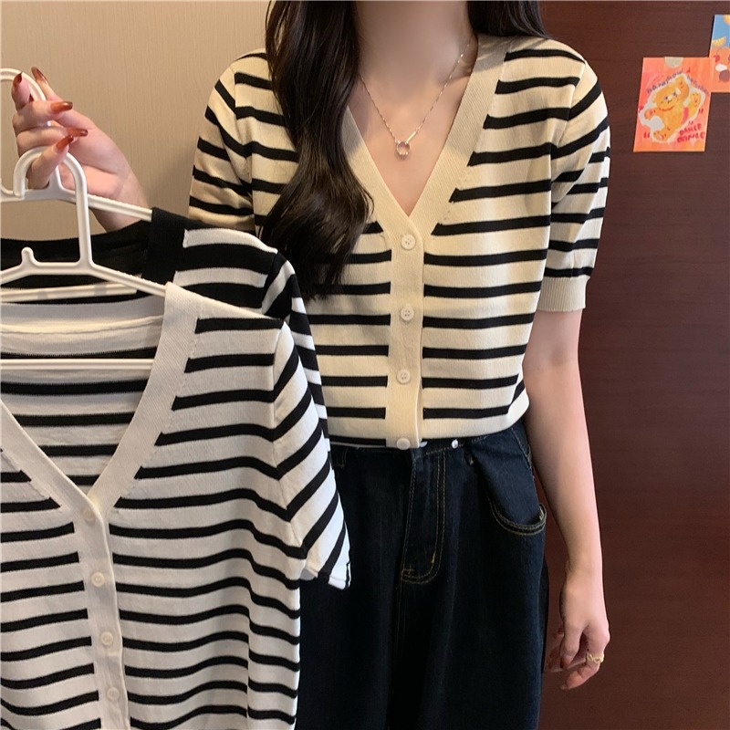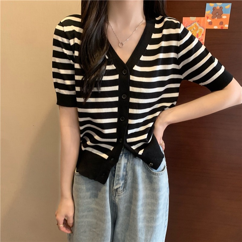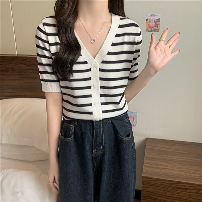 短袖针织衫女夏季2023新款气质百搭显瘦vV领条纹开衫短款上衣潮新