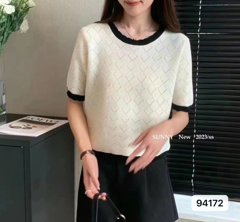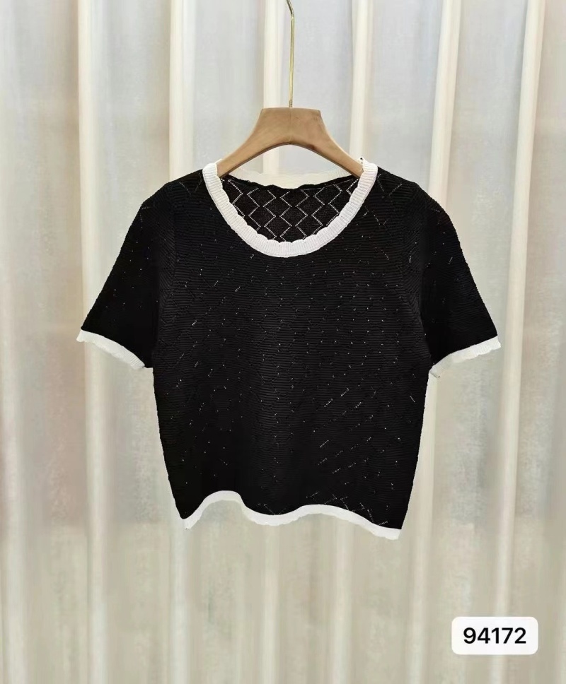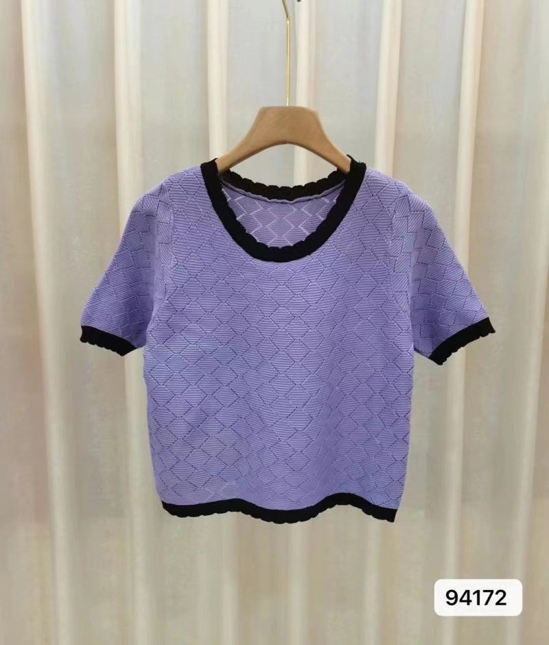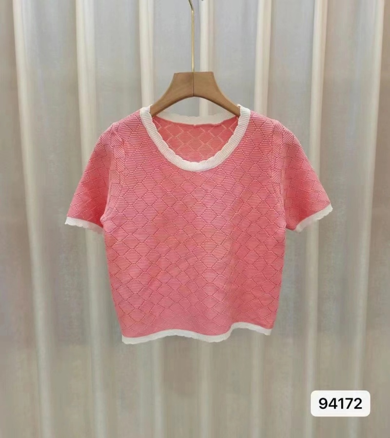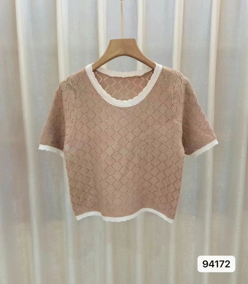 2023夏季新款韩版小清新 质感软糯 菱格小镂空撞色边针织上衣潮款