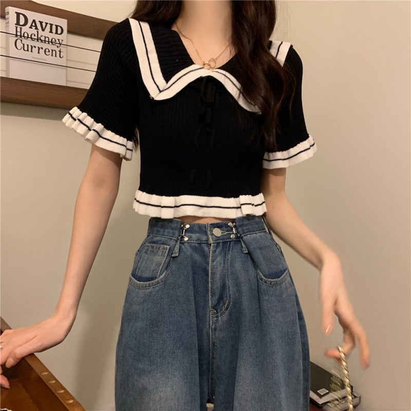 上衣ins娃娃领T恤短袖女夏季薄款显瘦抽绳设计感小众针织独特短款