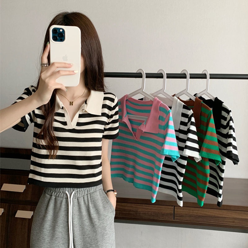 2022夏季新款polo领条纹短袖薄款设计感气质小众短款针织衫上衣女