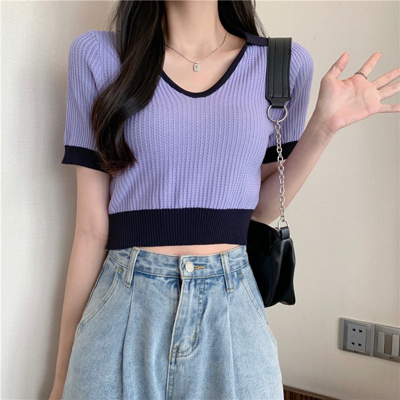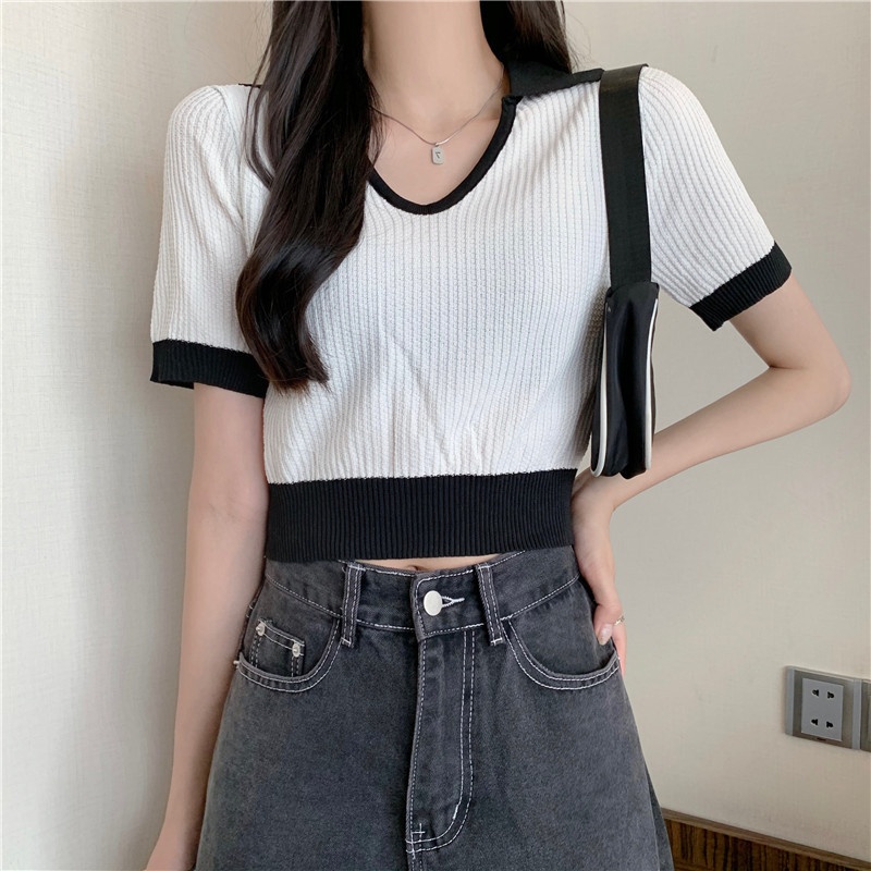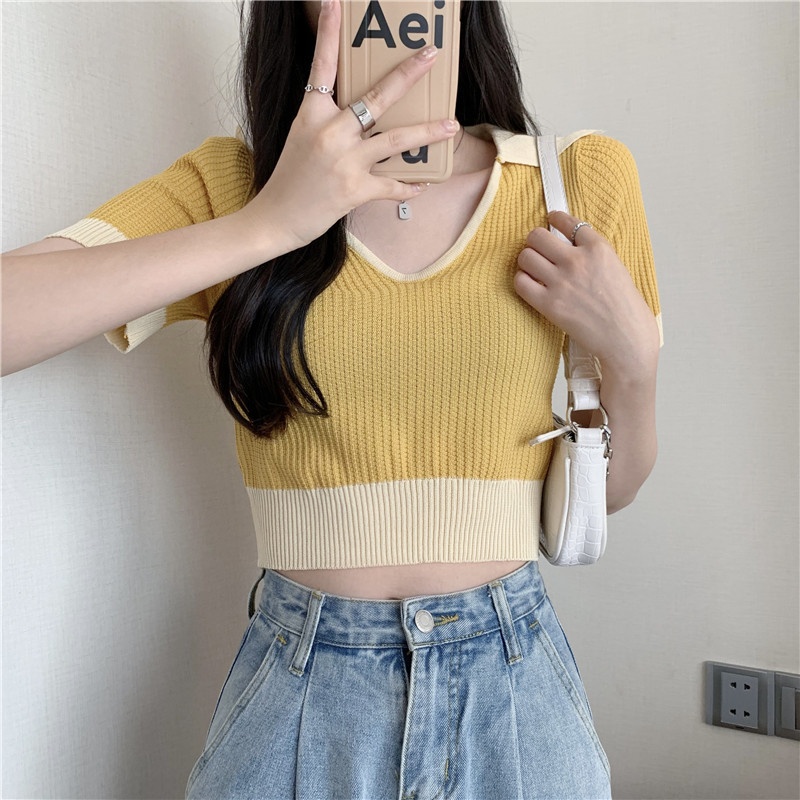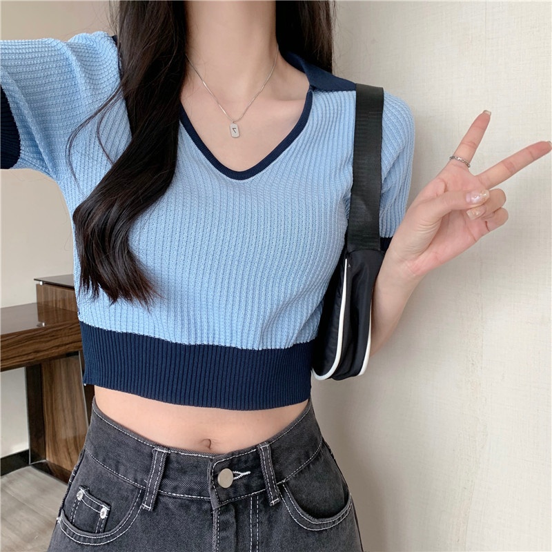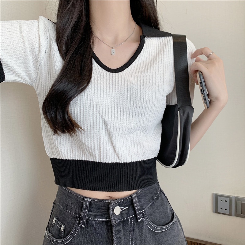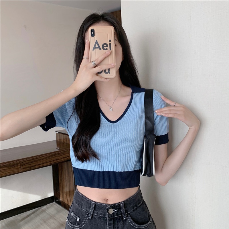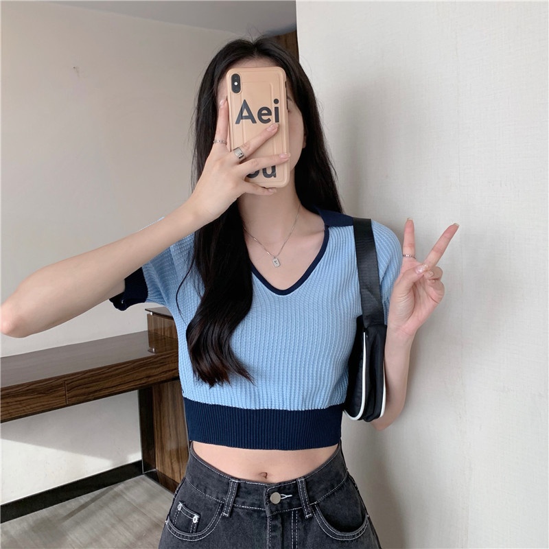 复古撞色V领冰丝辣妹短款别致收腰针织衫修身显瘦时尚短袖上衣女