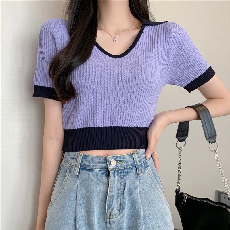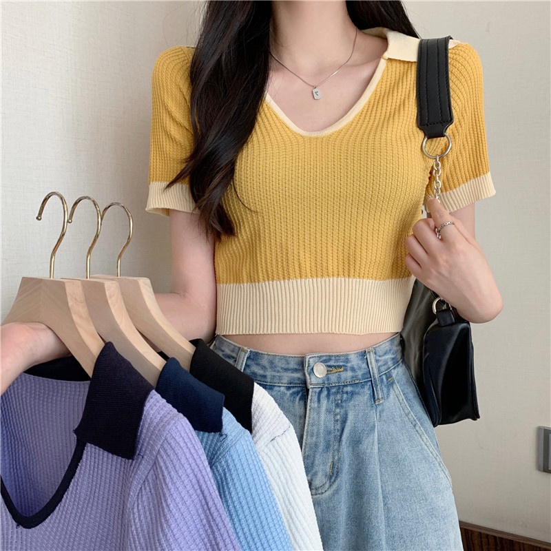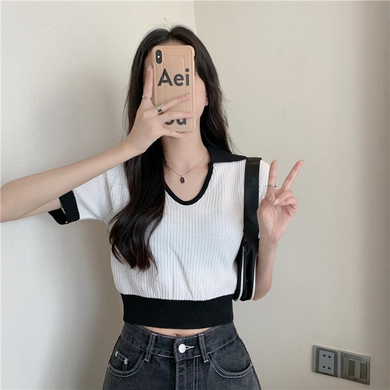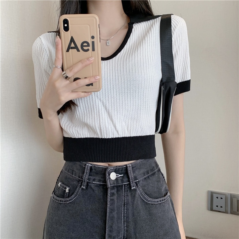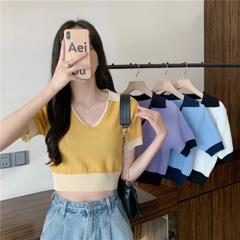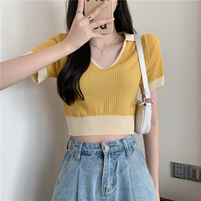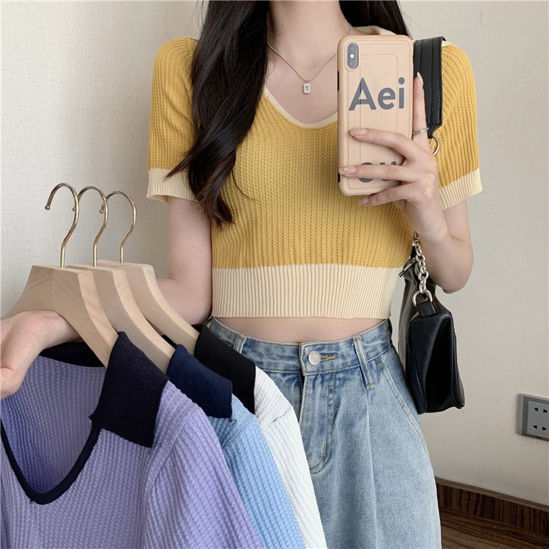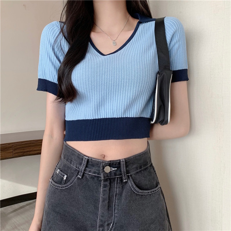 复古撞色V领冰丝辣妹短款别致收腰针织衫修身显瘦时尚短袖上衣女