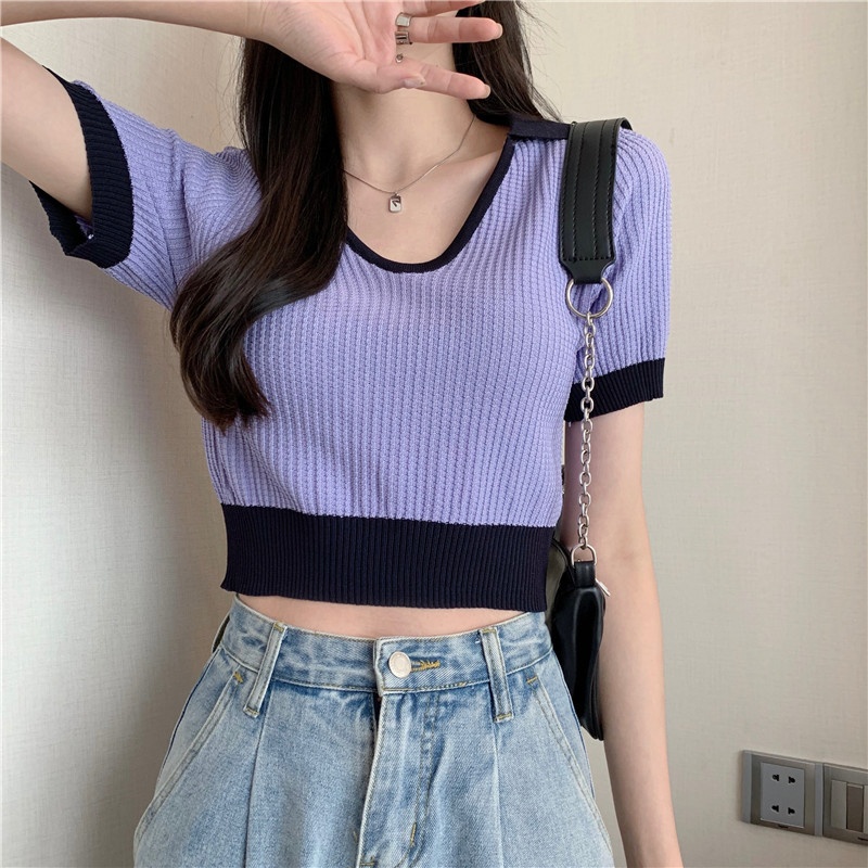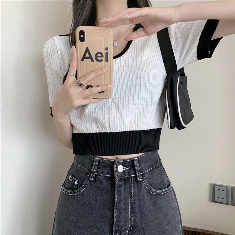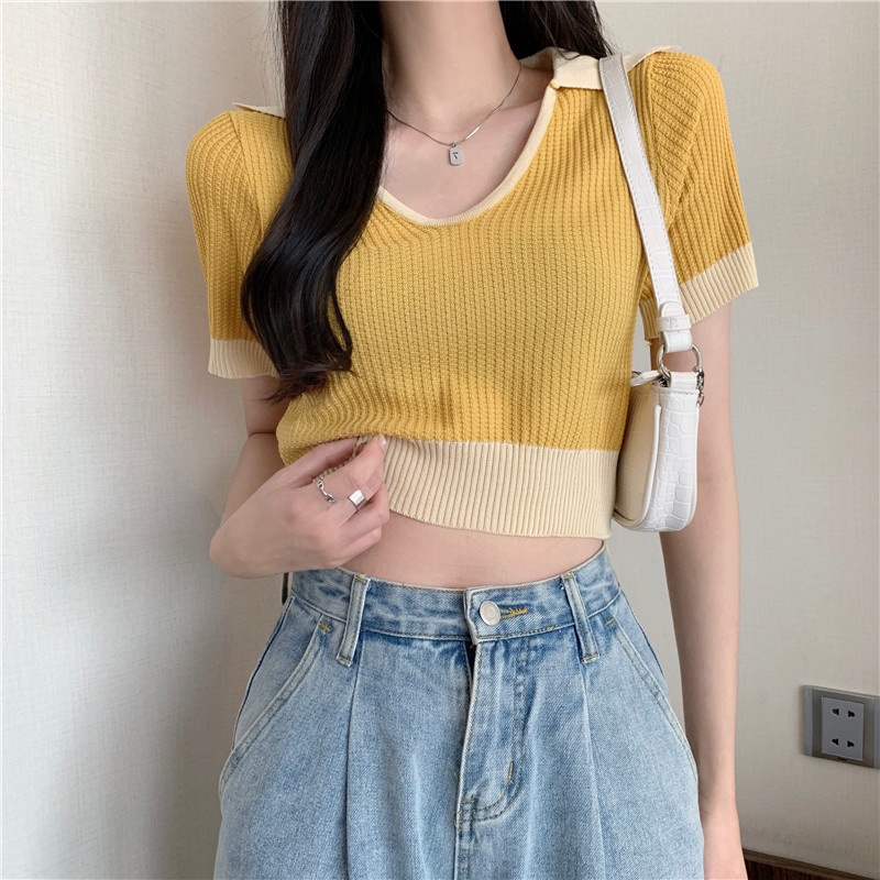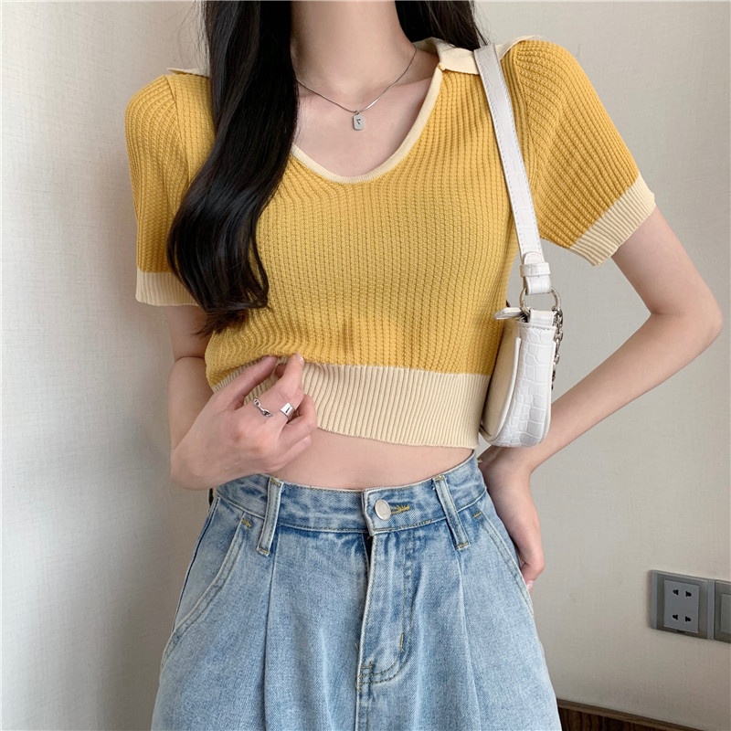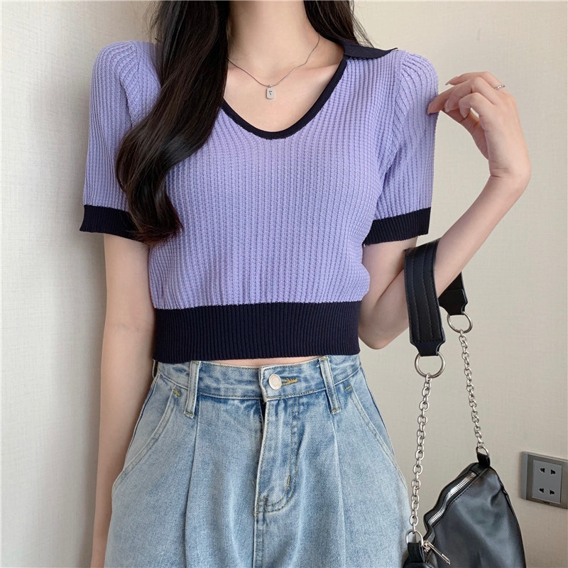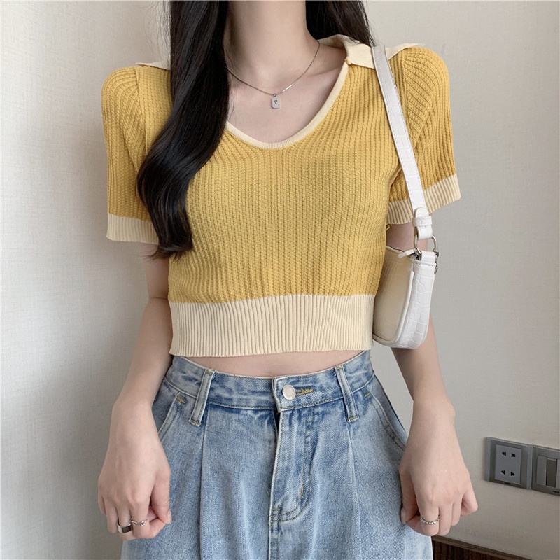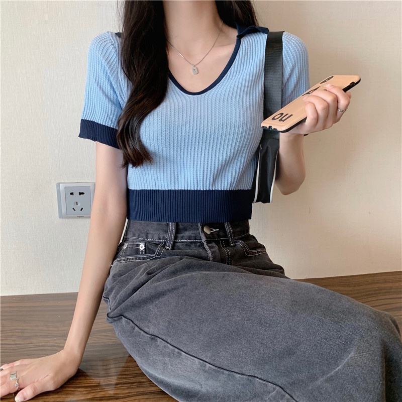 复古撞色V领冰丝辣妹短款别致收腰针织衫修身显瘦时尚短袖上衣女