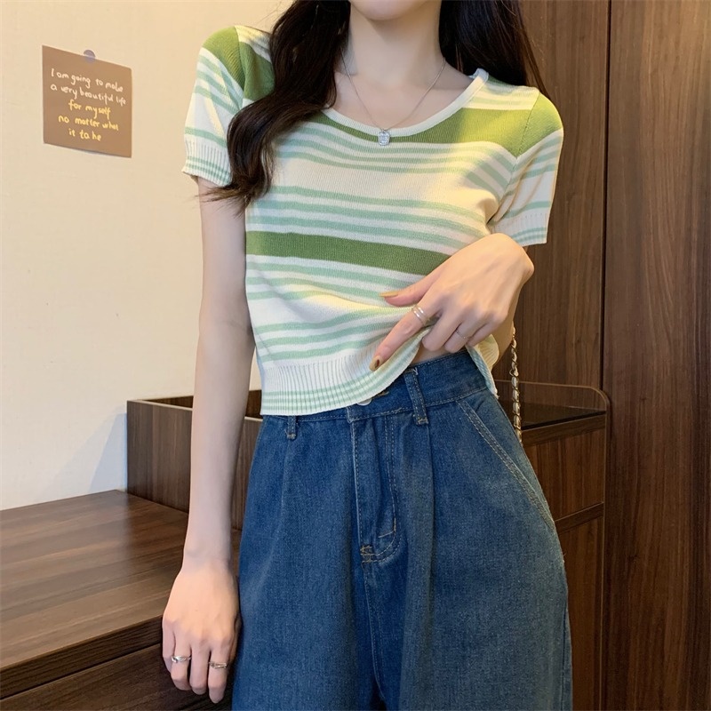 条纹短袖女款冰爽丝针织衫短款上衣2023春夏新款修身且独特设计感