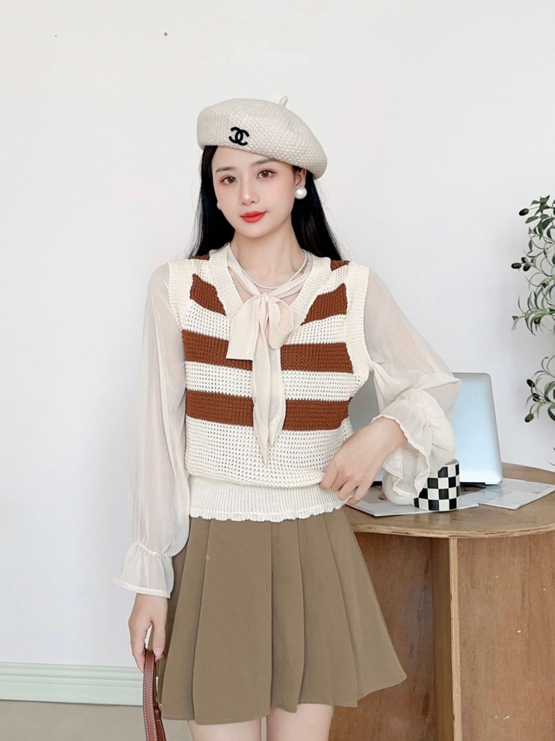 韩版简约气质飘带拼接条纹衬衫长袖2023春季新款设计针织衫上衣女