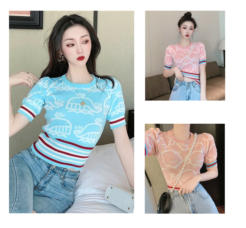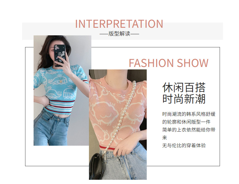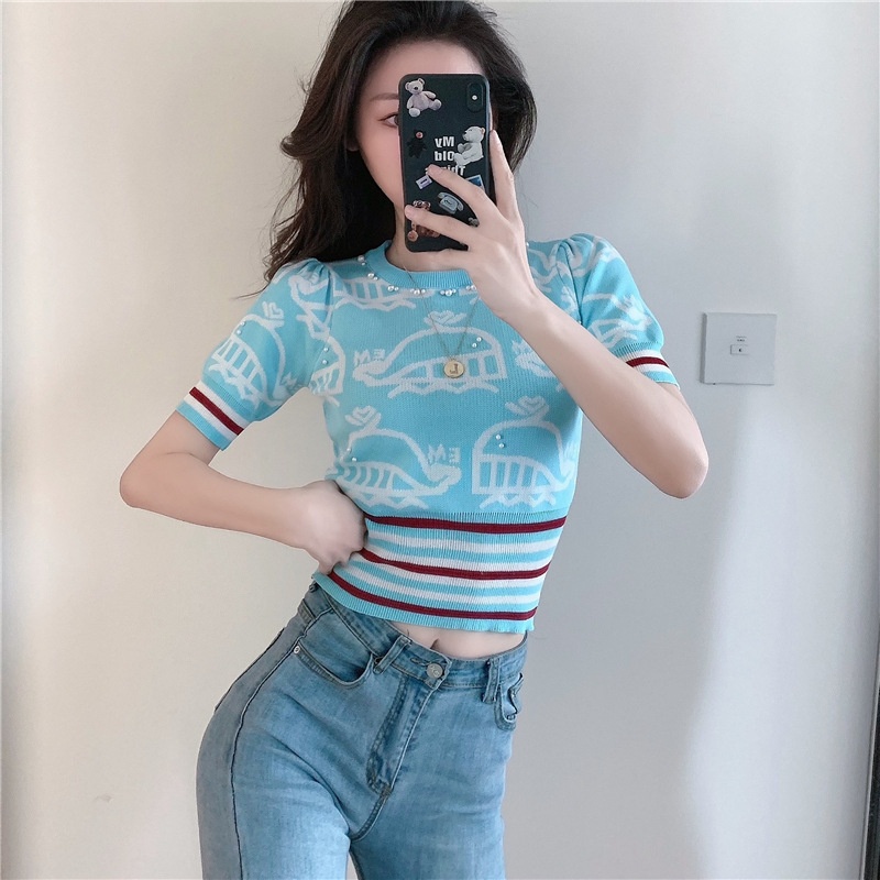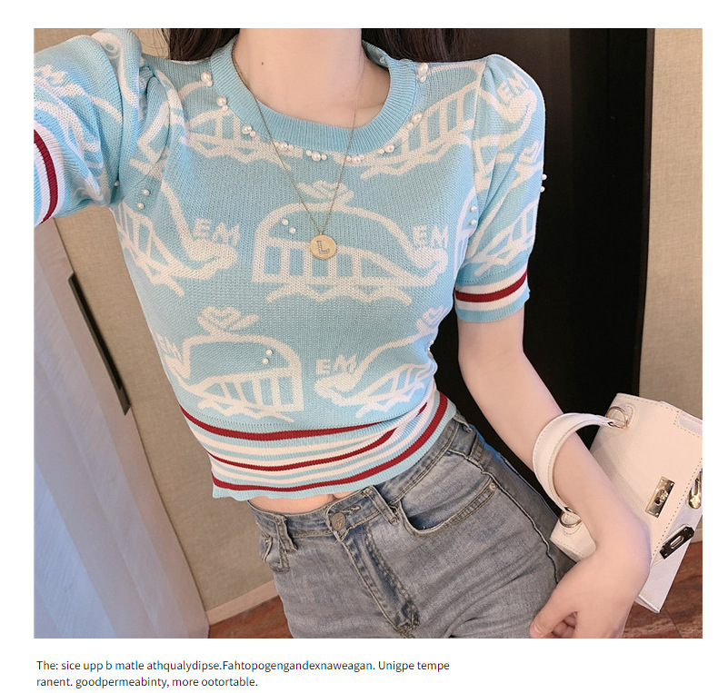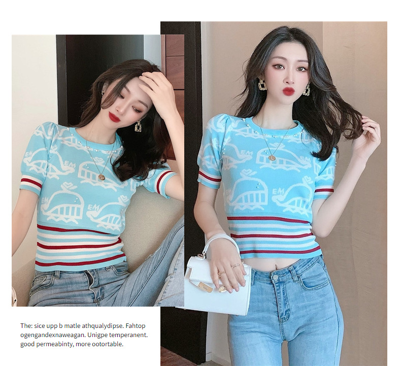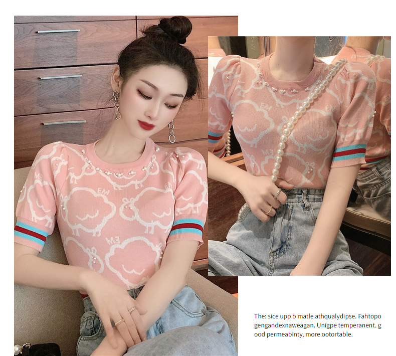夏季薄款小香风短袖复古高腰冰丝钉珠针织衫泡泡袖上衣女气质感潮