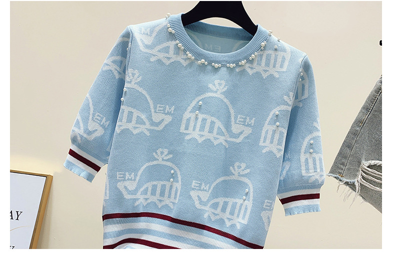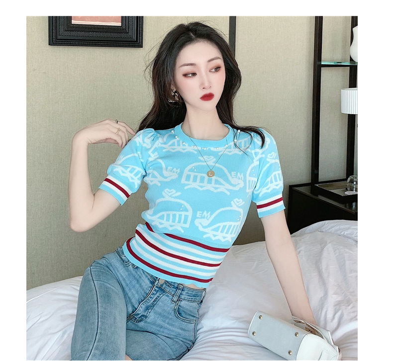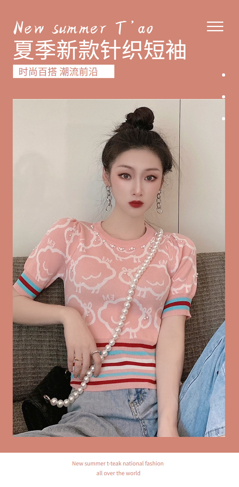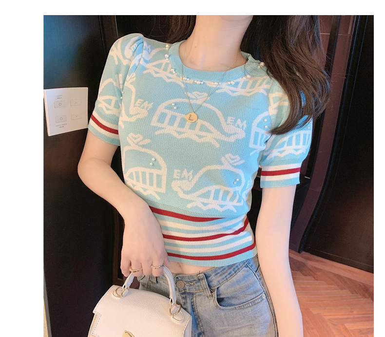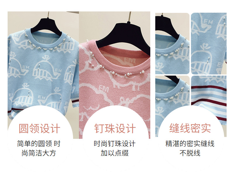 夏季薄款小香风短袖复古高腰冰丝钉珠针织衫泡泡袖上衣女气质感潮