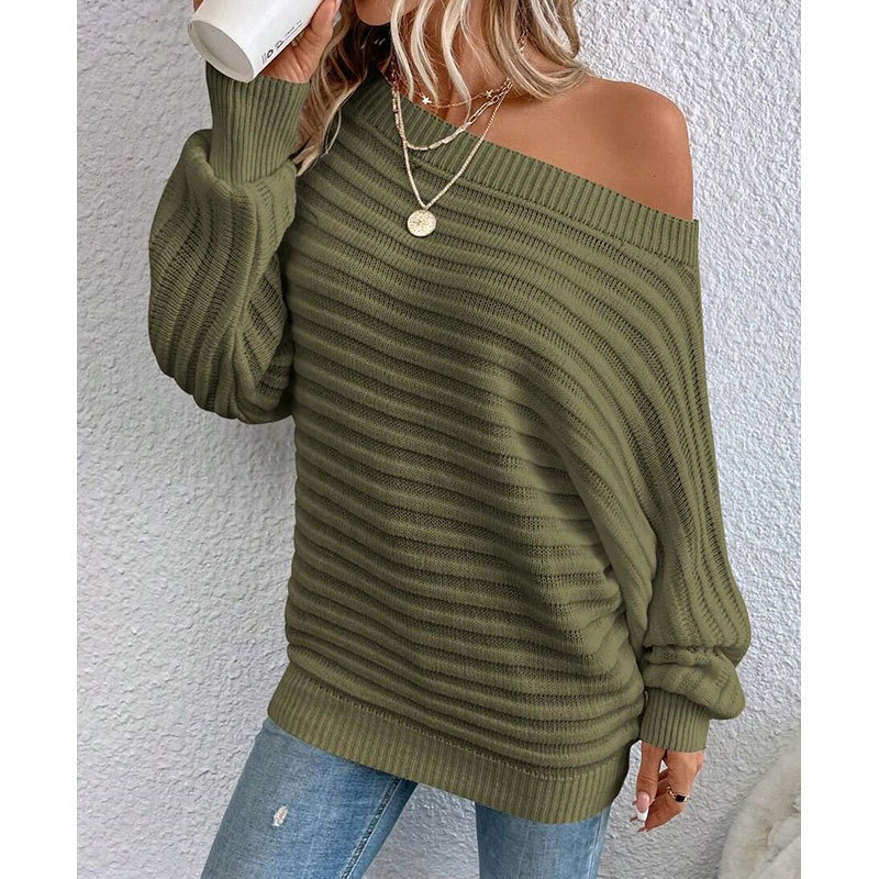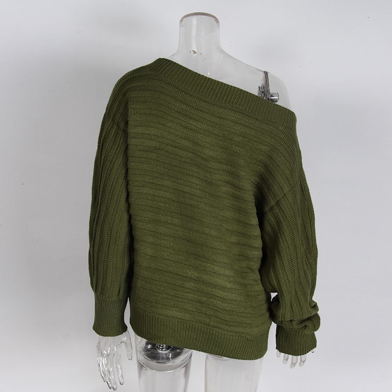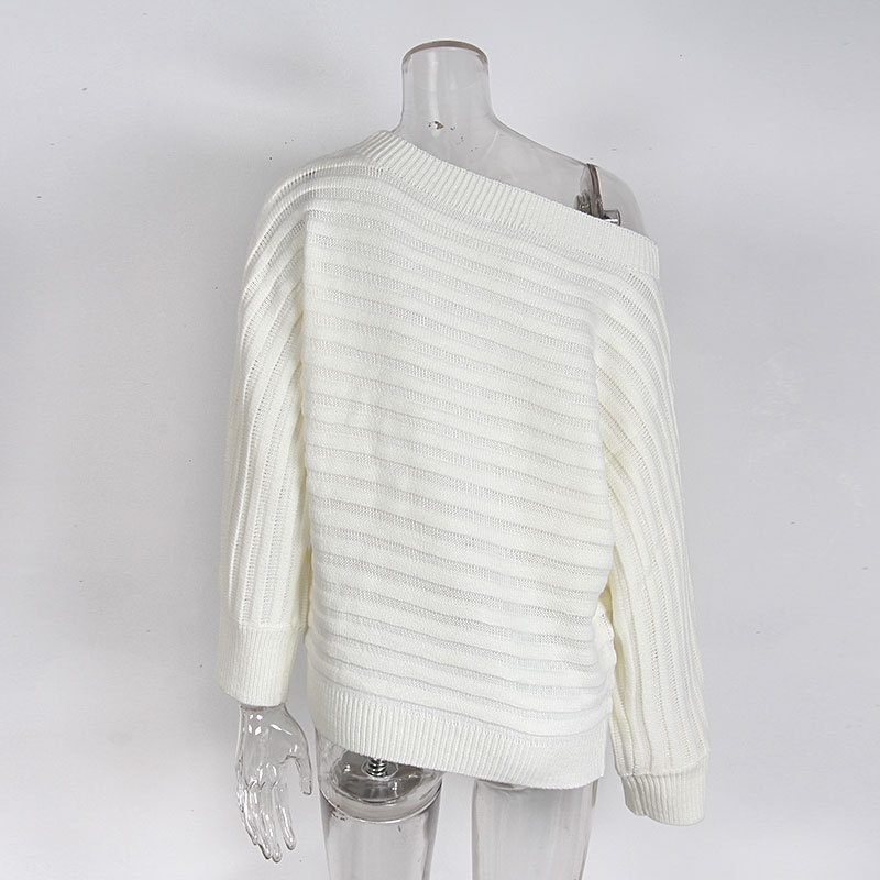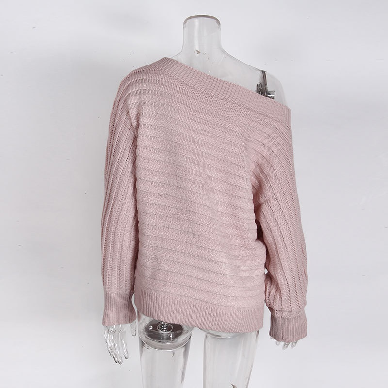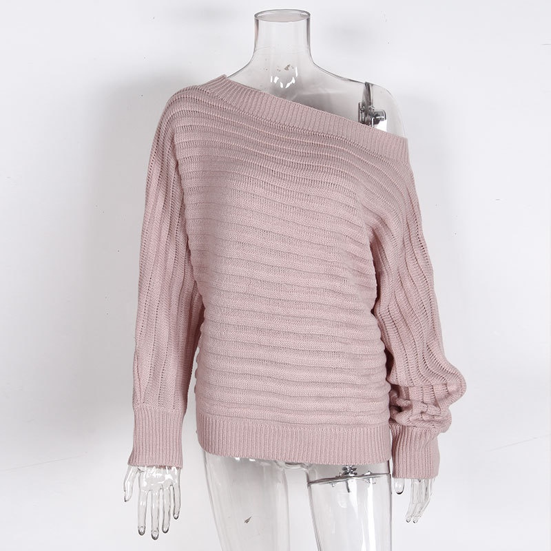 秋冬新款跨境欧美纯色立体横纹一字领蝙蝠袖套头针织毛衣女