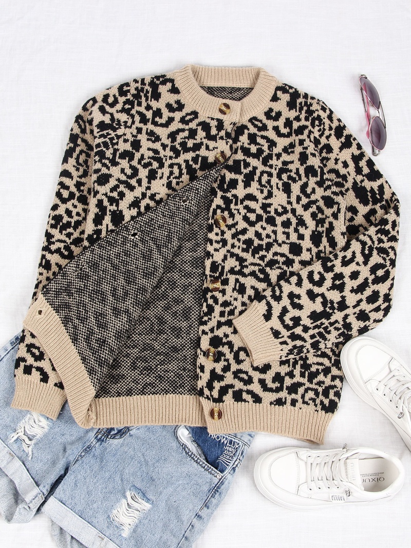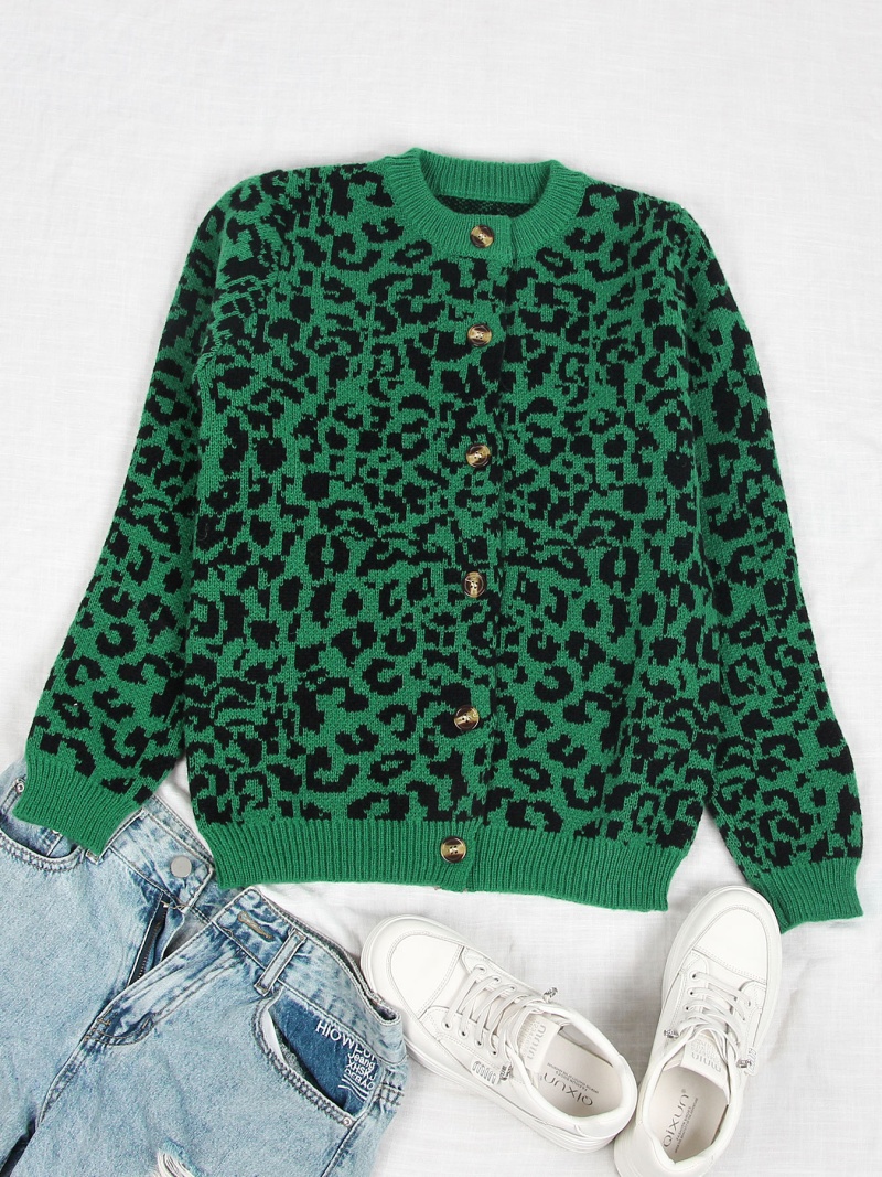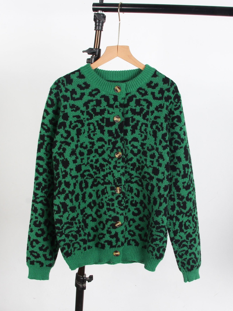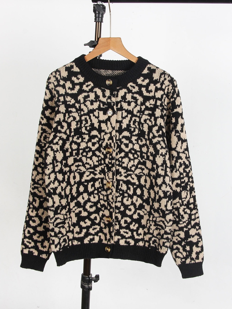 欧美新款秋冬毛衣女跨境宽松针织圆领长袖豹纹毛衣开衫外套