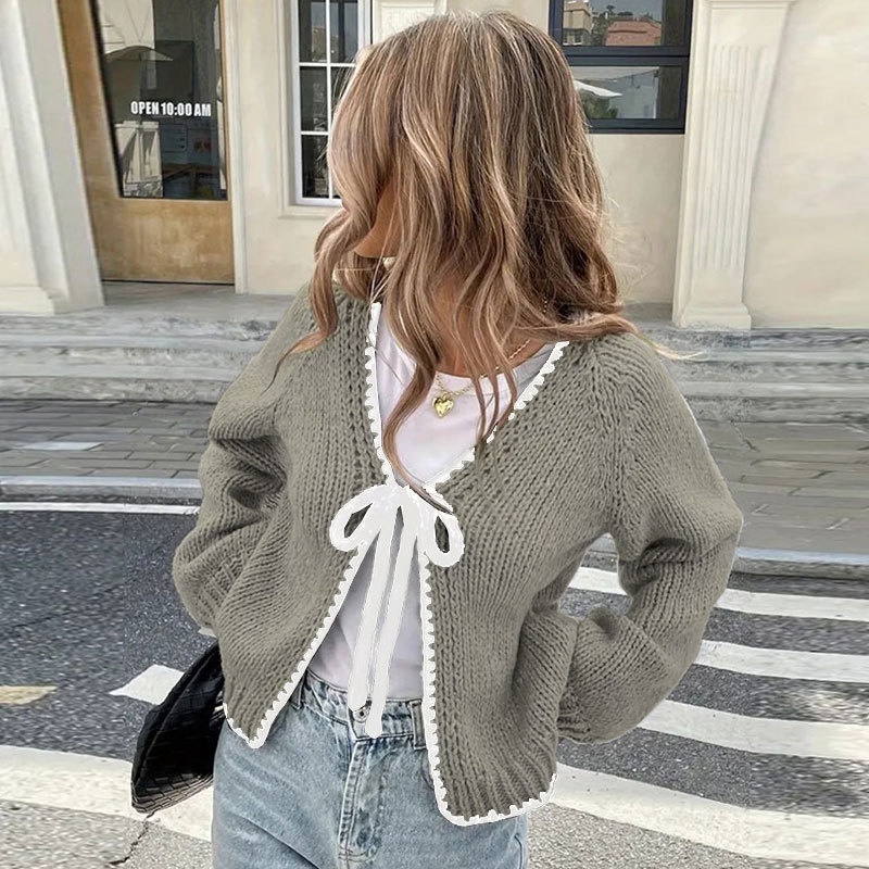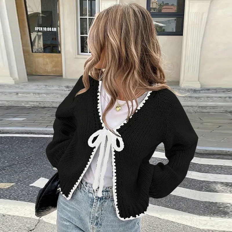 跨境欧美秋冬毛衣女新款针织衫宽松长袖蝴蝶结绑带开衫外套上衣女