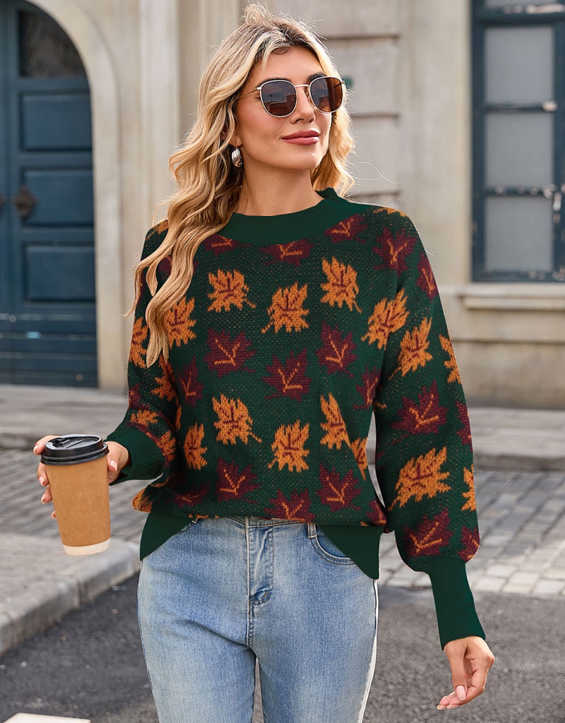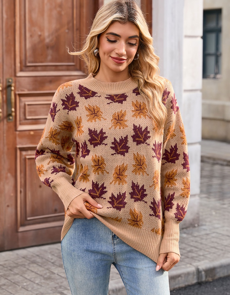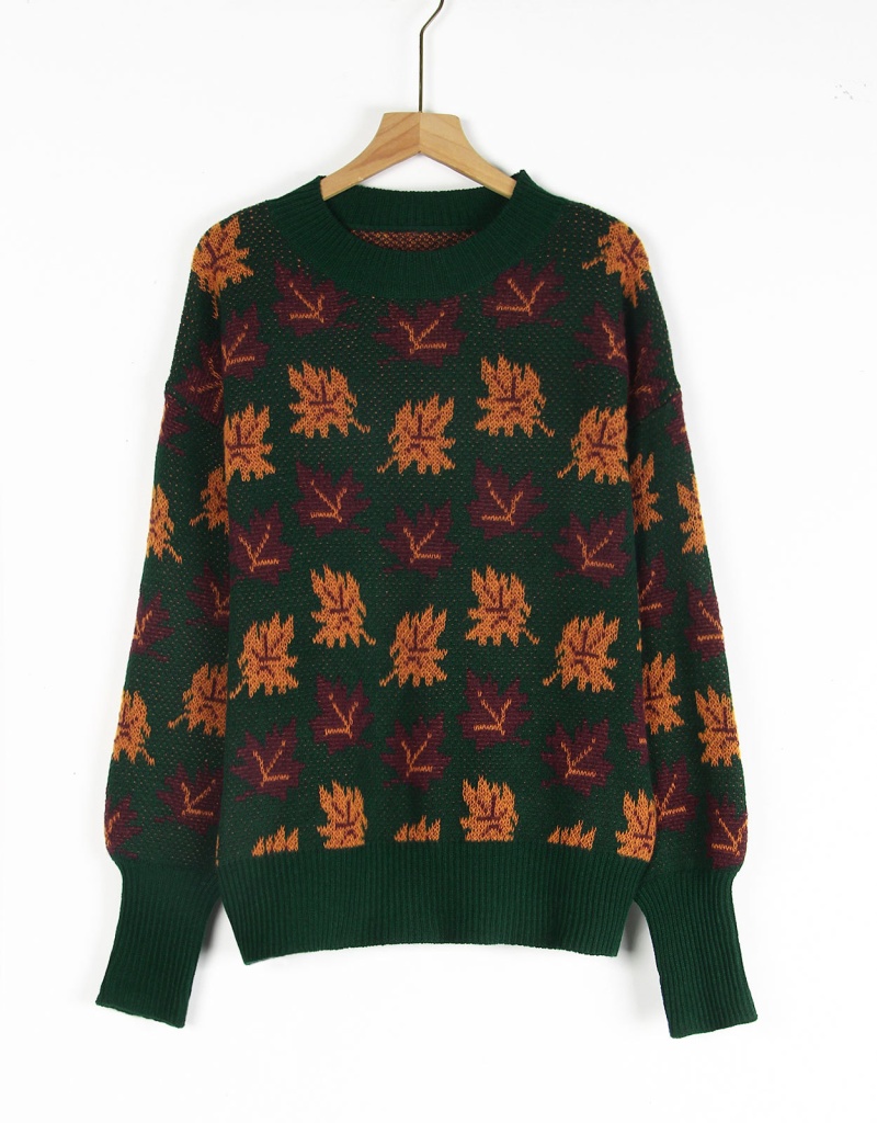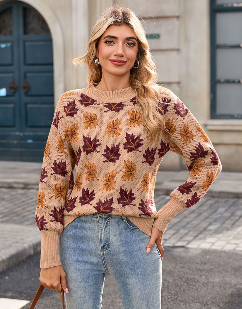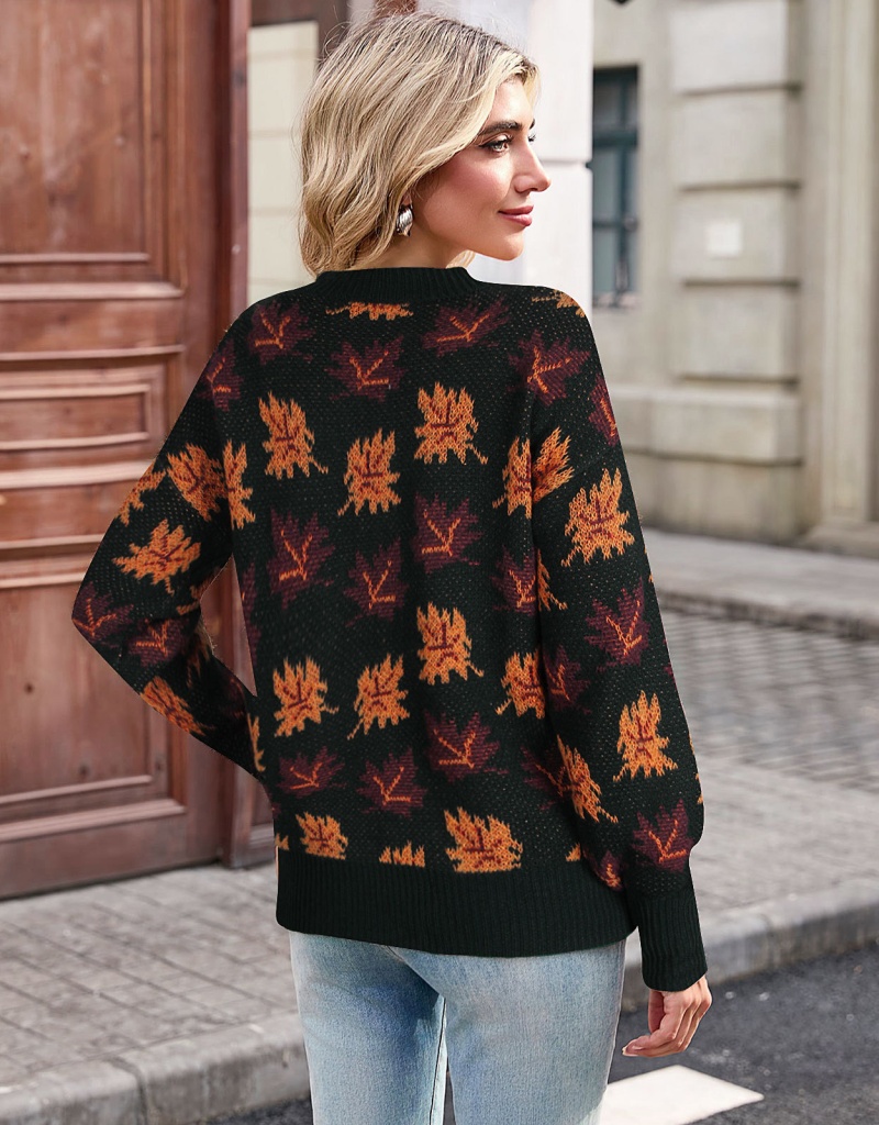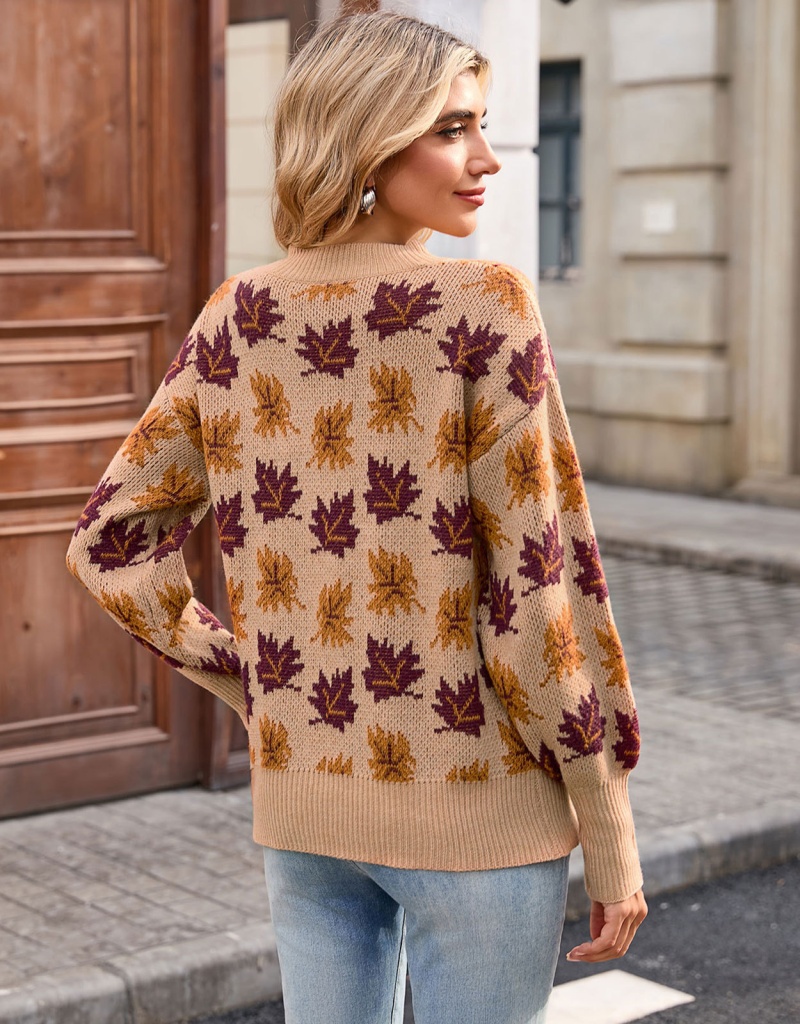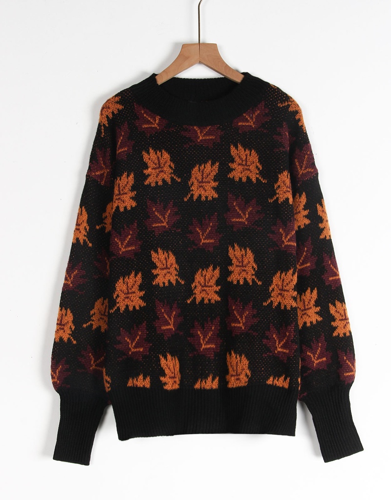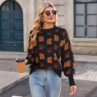 秋冬新款欧美毛衣女装跨境休闲枫叶图案提花圆领套头针织衫