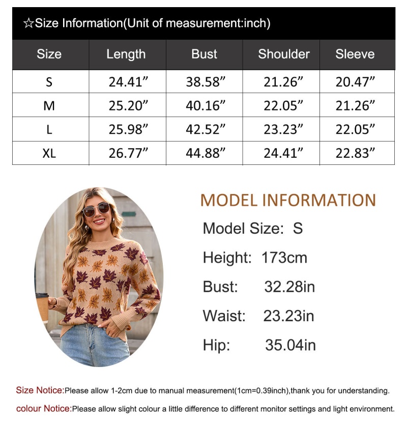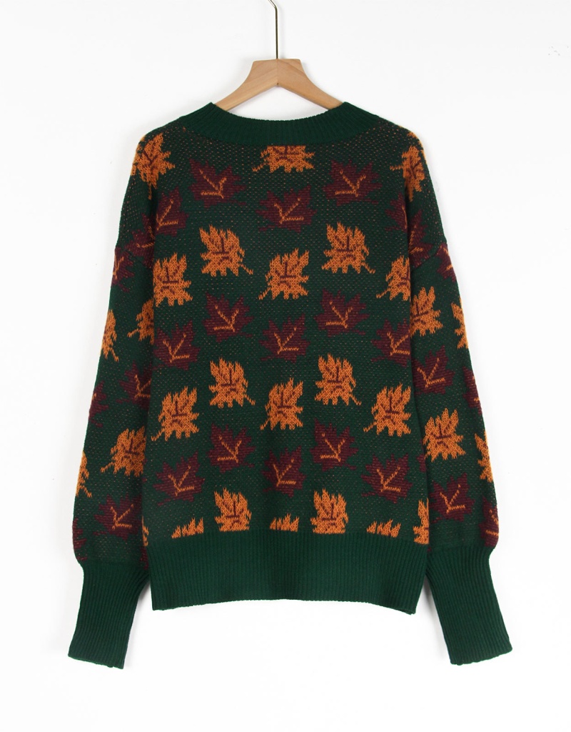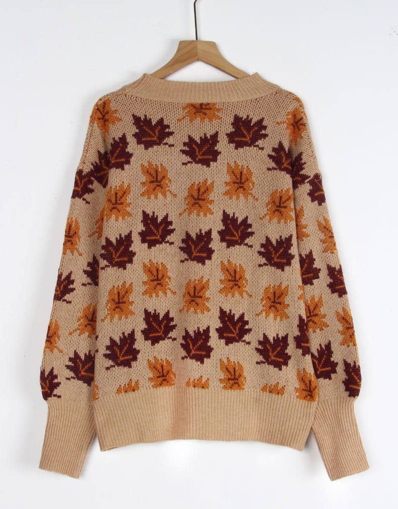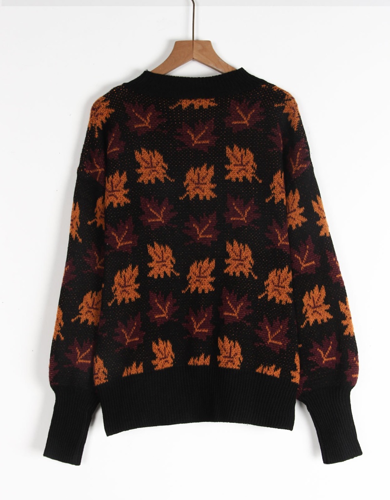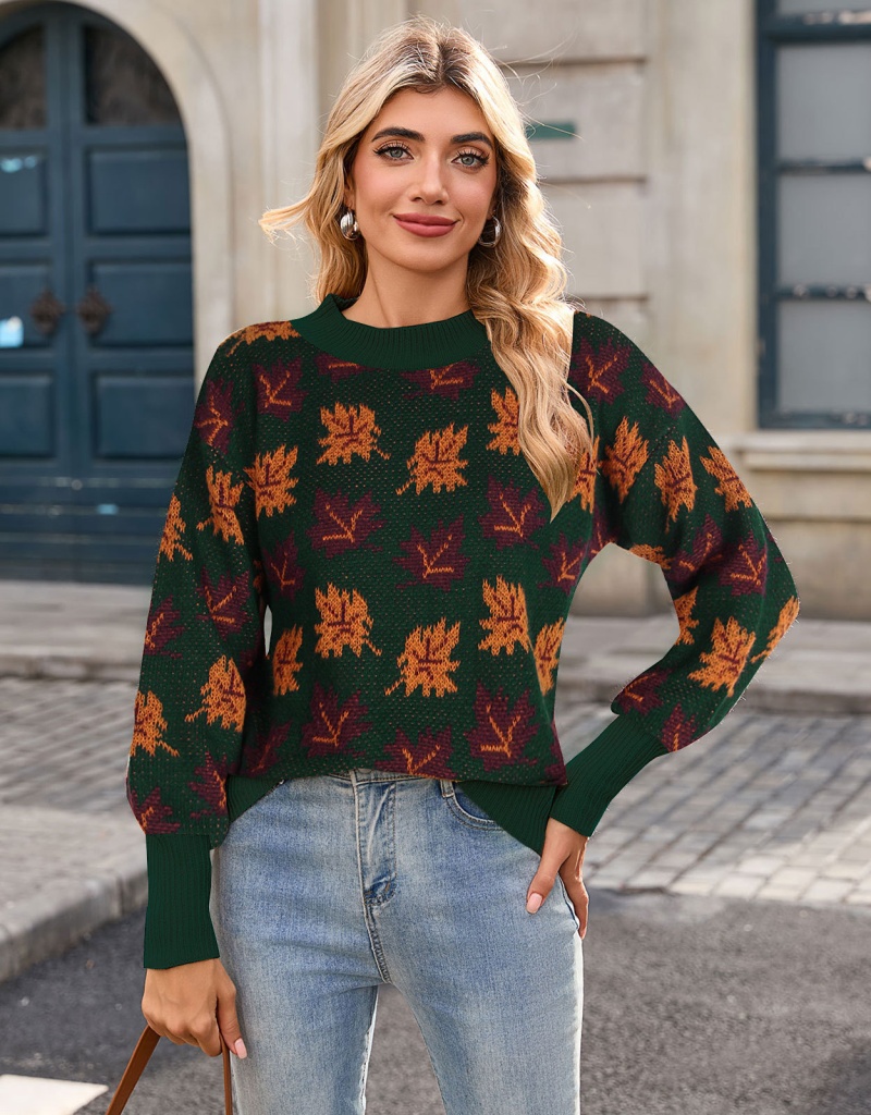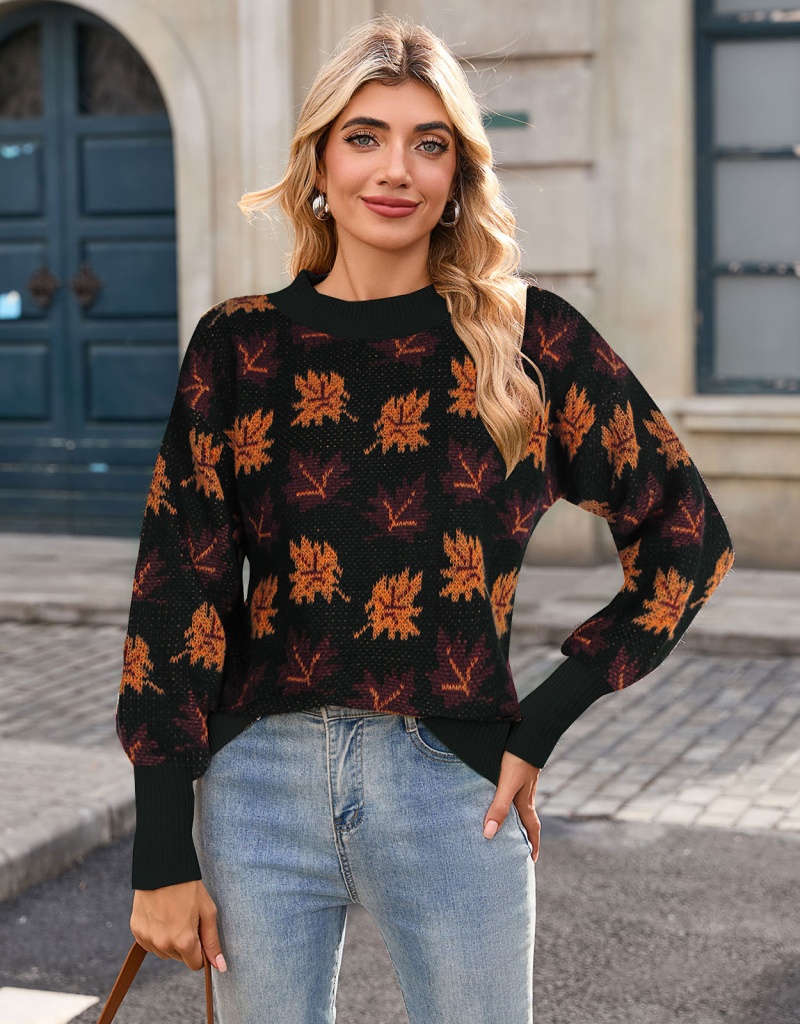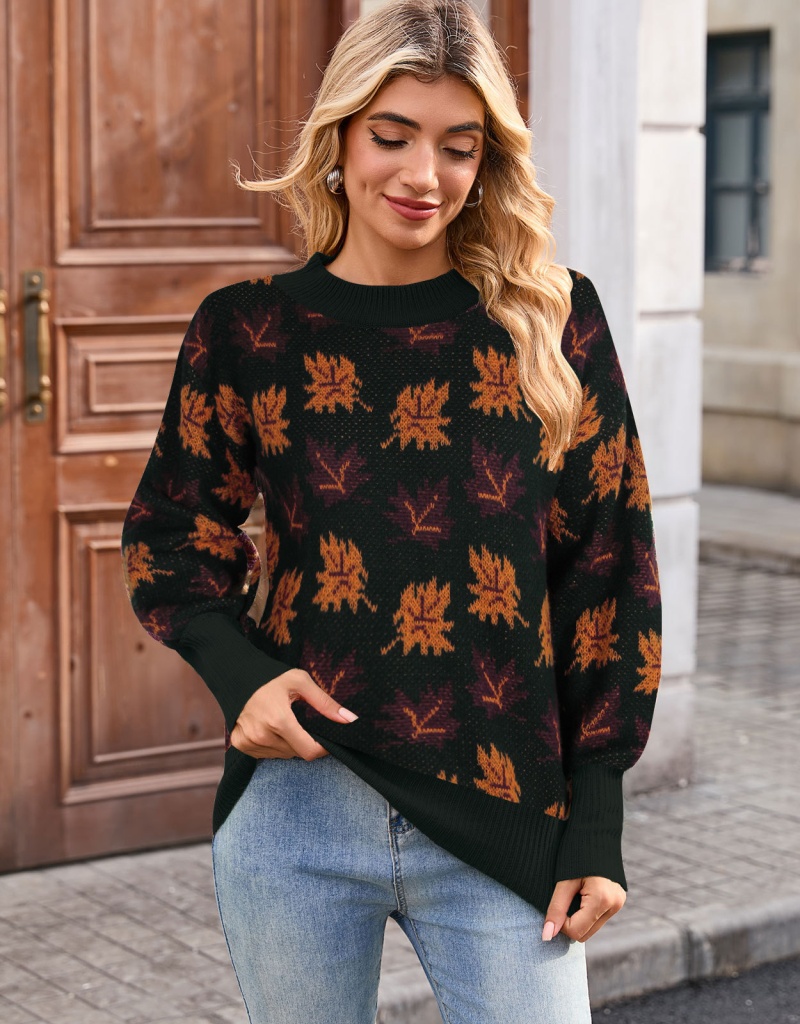 秋冬新款欧美毛衣女装跨境休闲枫叶图案提花圆领套头针织衫
