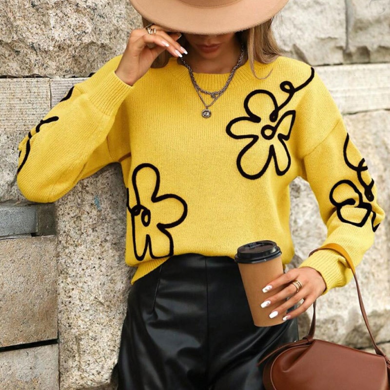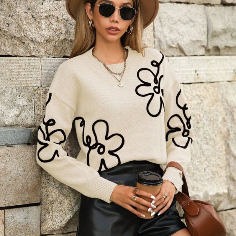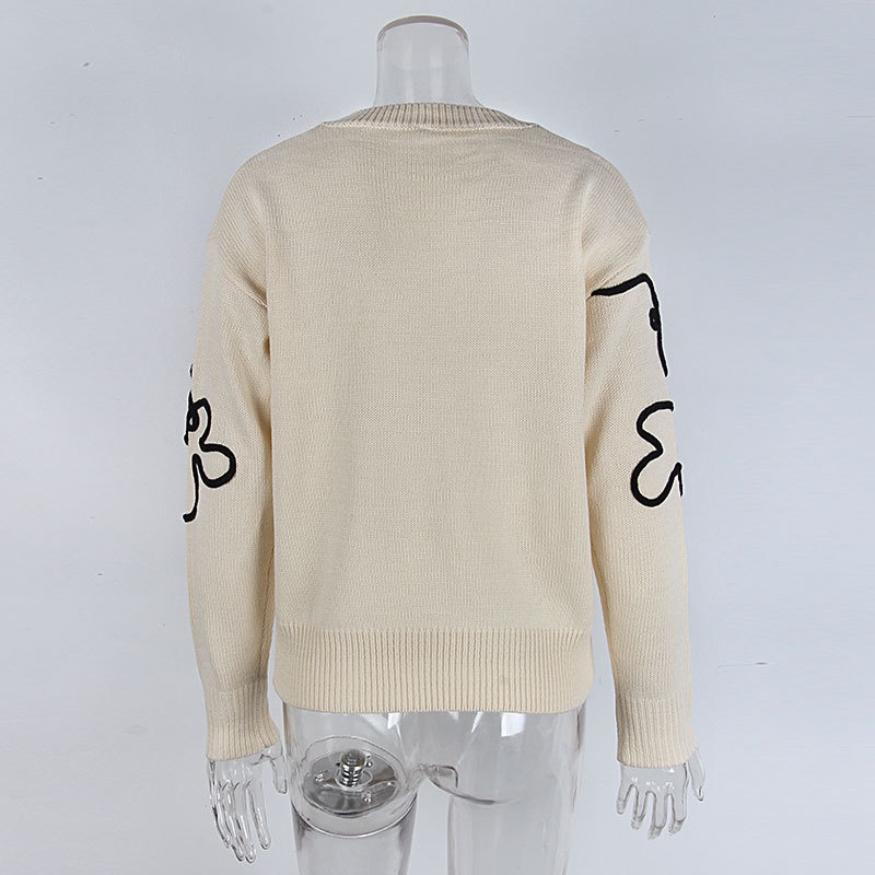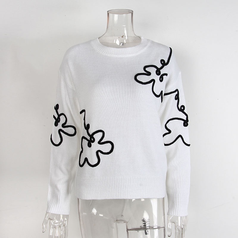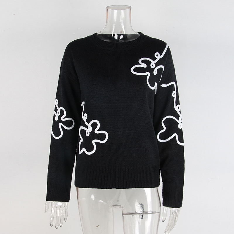 跨境欧美秋冬新款女装毛衣时尚花朵立体刺绣圆领套头长袖针织衫女
