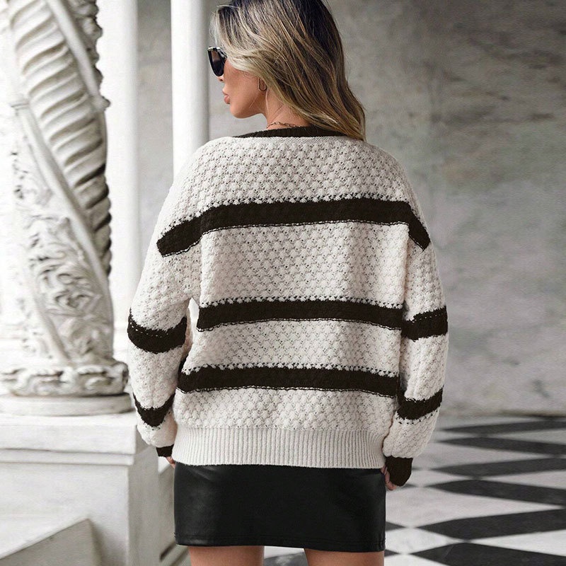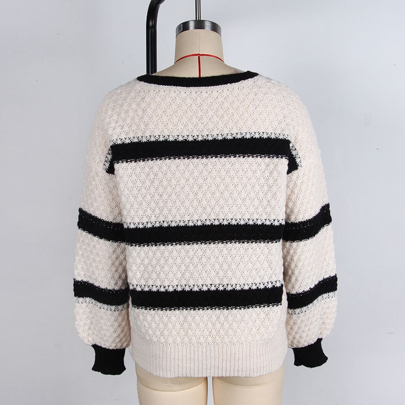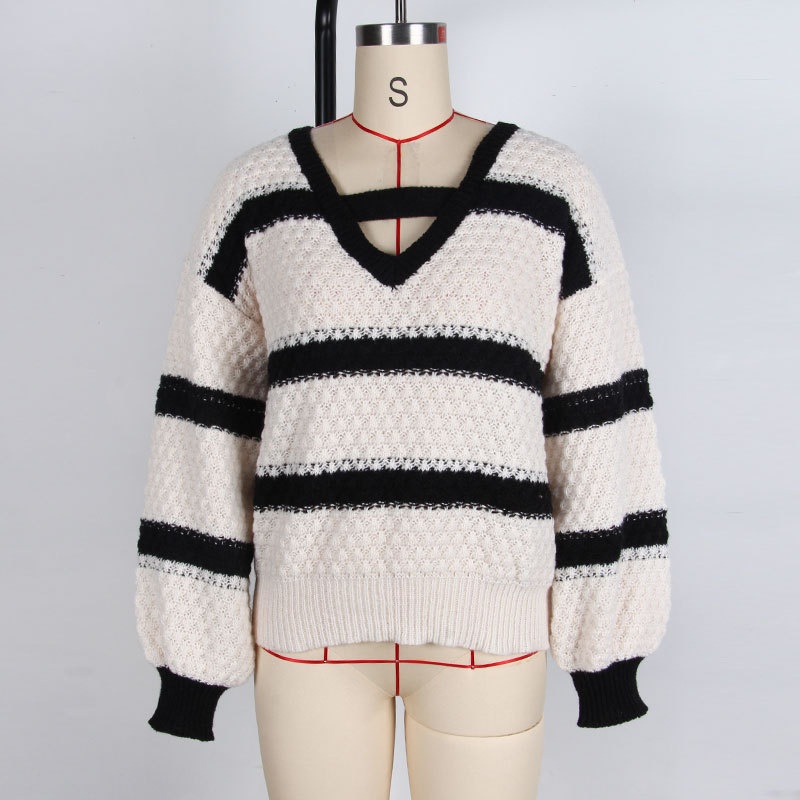 秋冬跨境新款欧美毛衣女 宽松针织拼接撞色V领灯笼袖套头百搭上衣