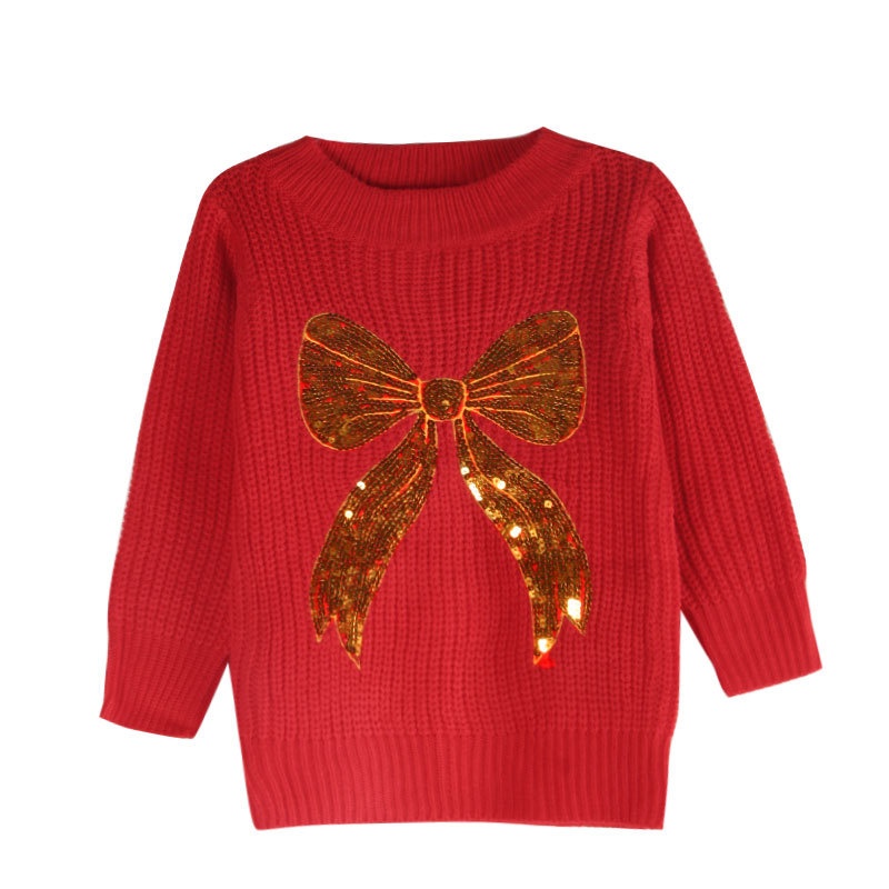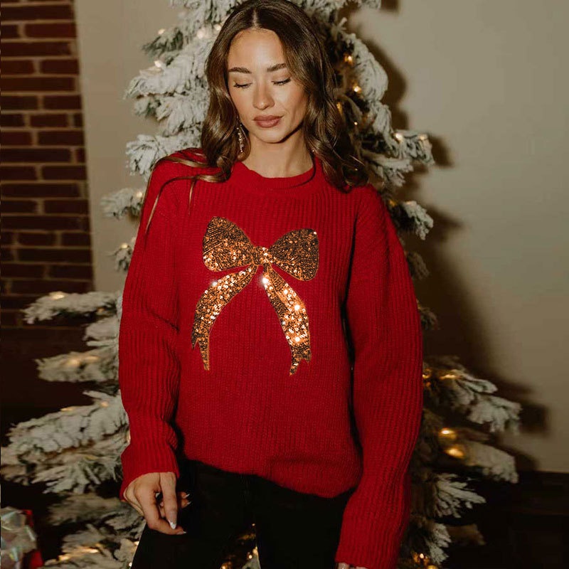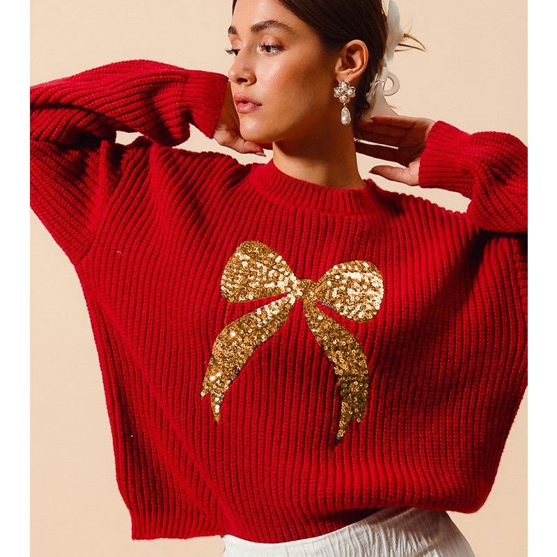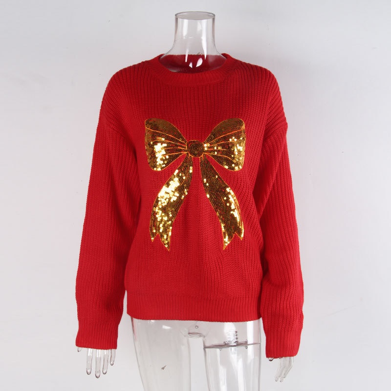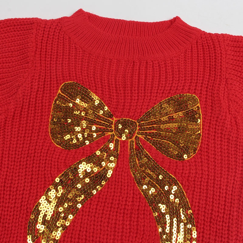 秋冬外贸新款欧美跨境毛衣宽松珠片绣蝴蝶结长袖圆领套头上衣女装
