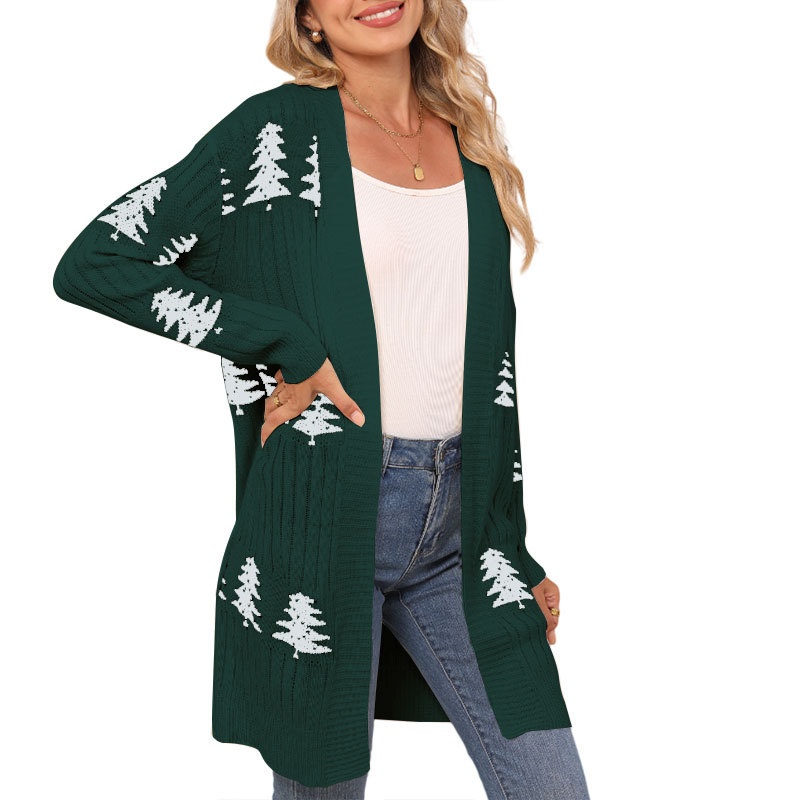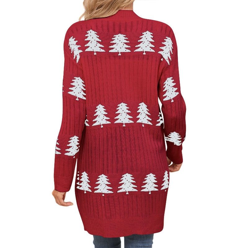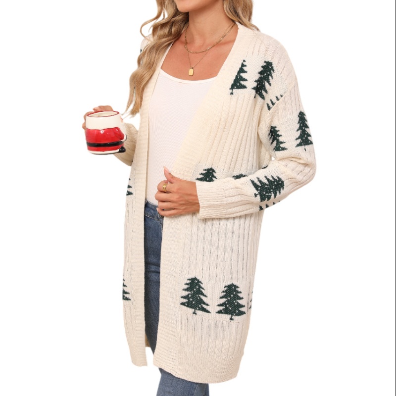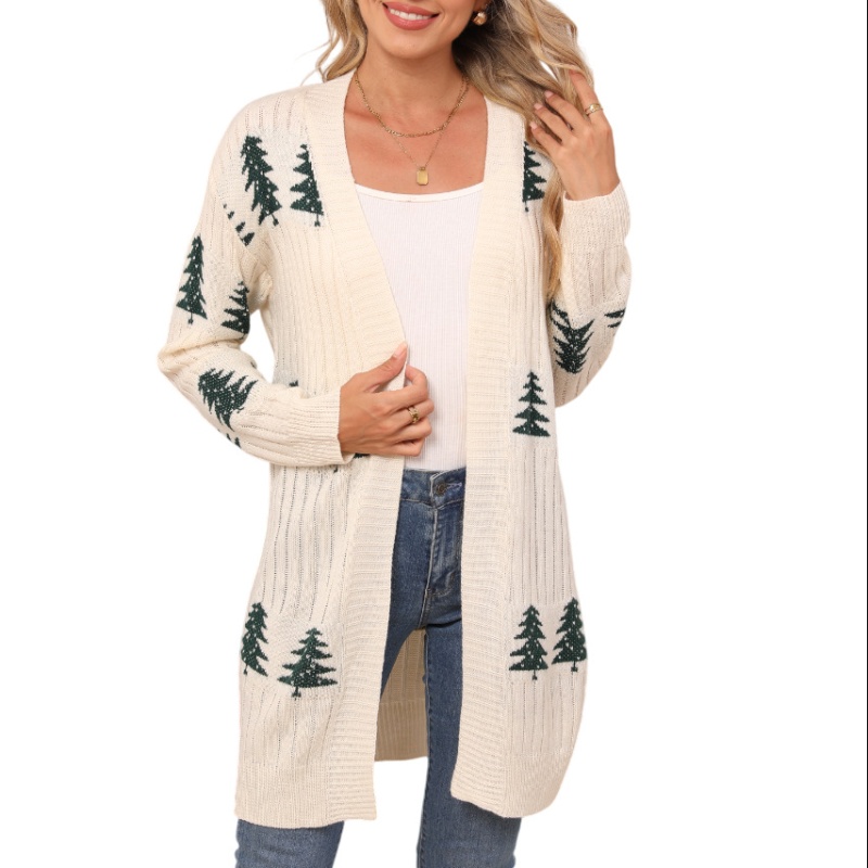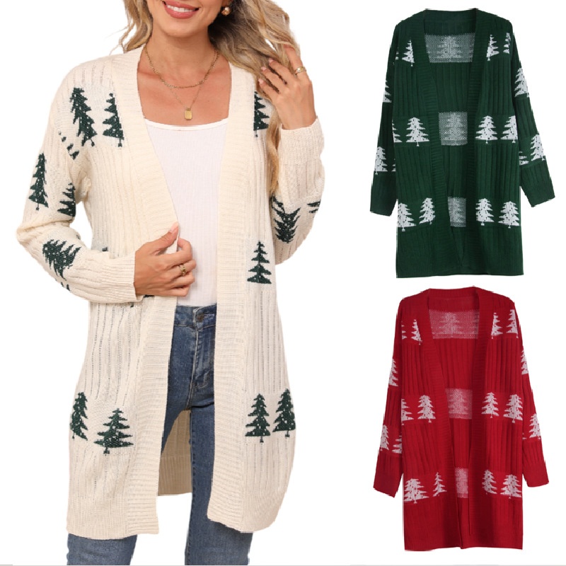 欧美秋冬新款毛衣女装跨境针织宽松圣诞节雪松刺绣开衫外套