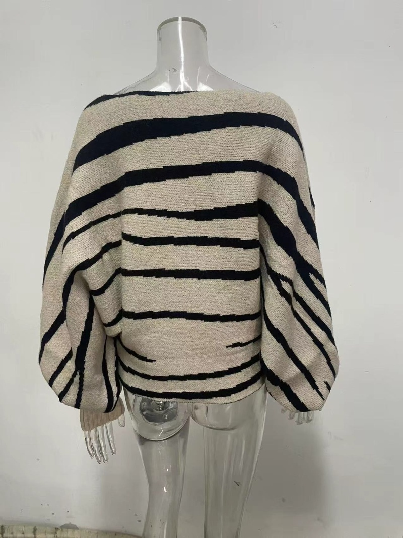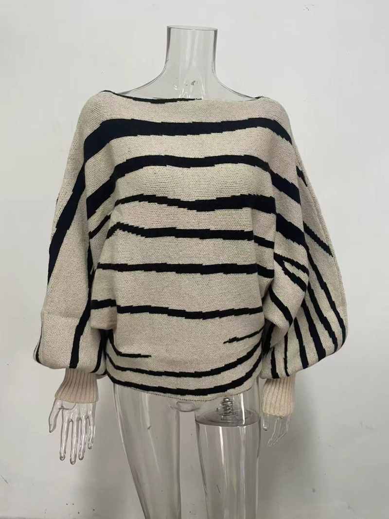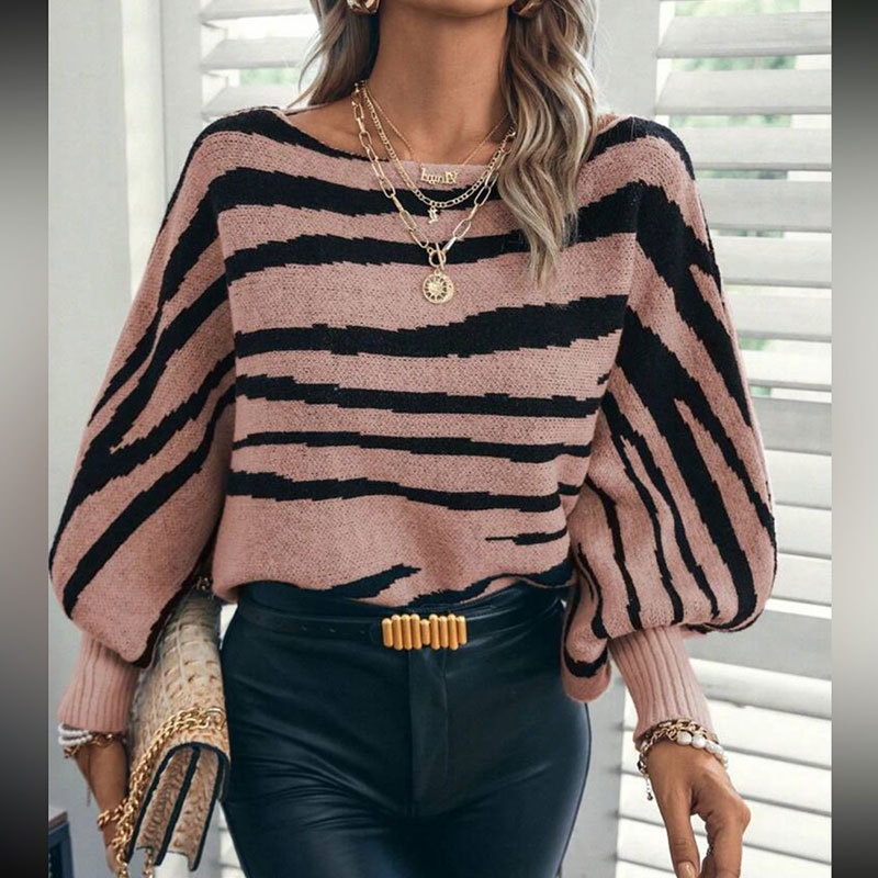 跨境新款欧美秋冬毛衣女宽松针织斑马纹撞色一字肩蝙蝠袖套头上衣