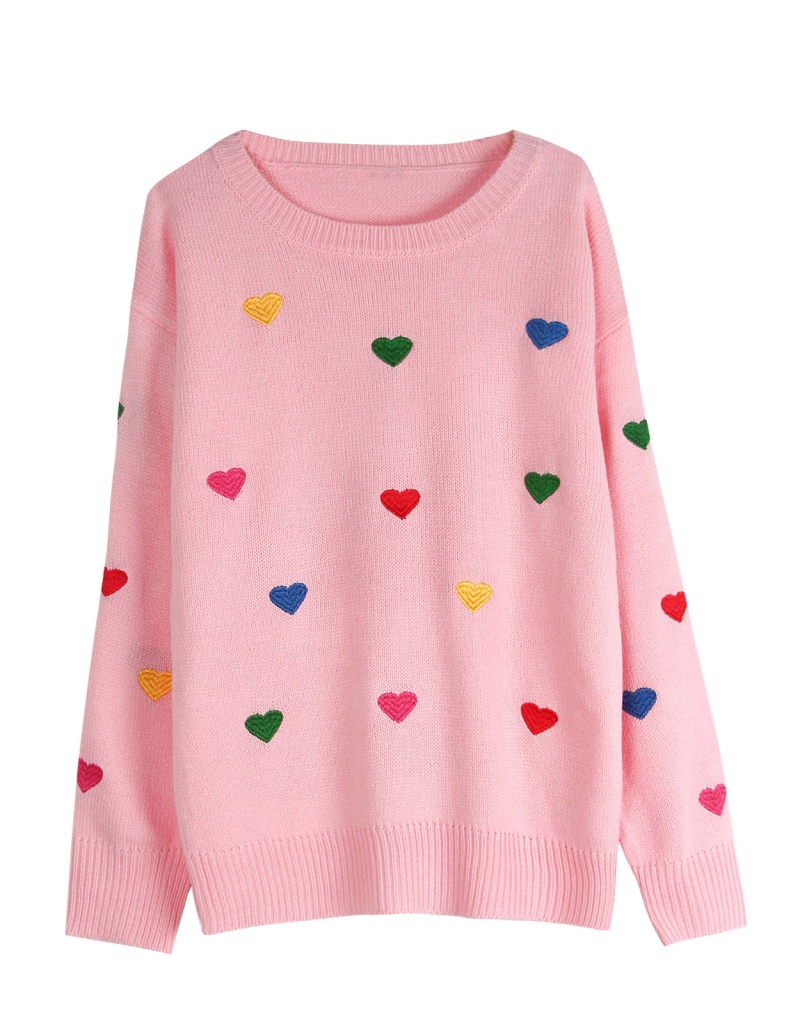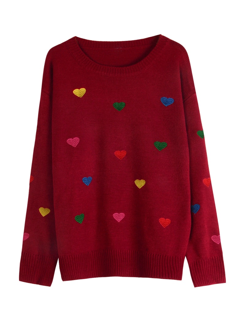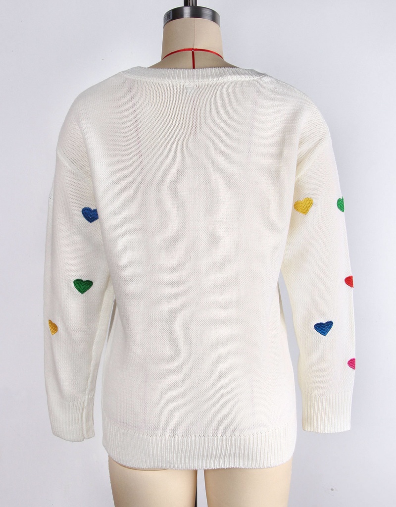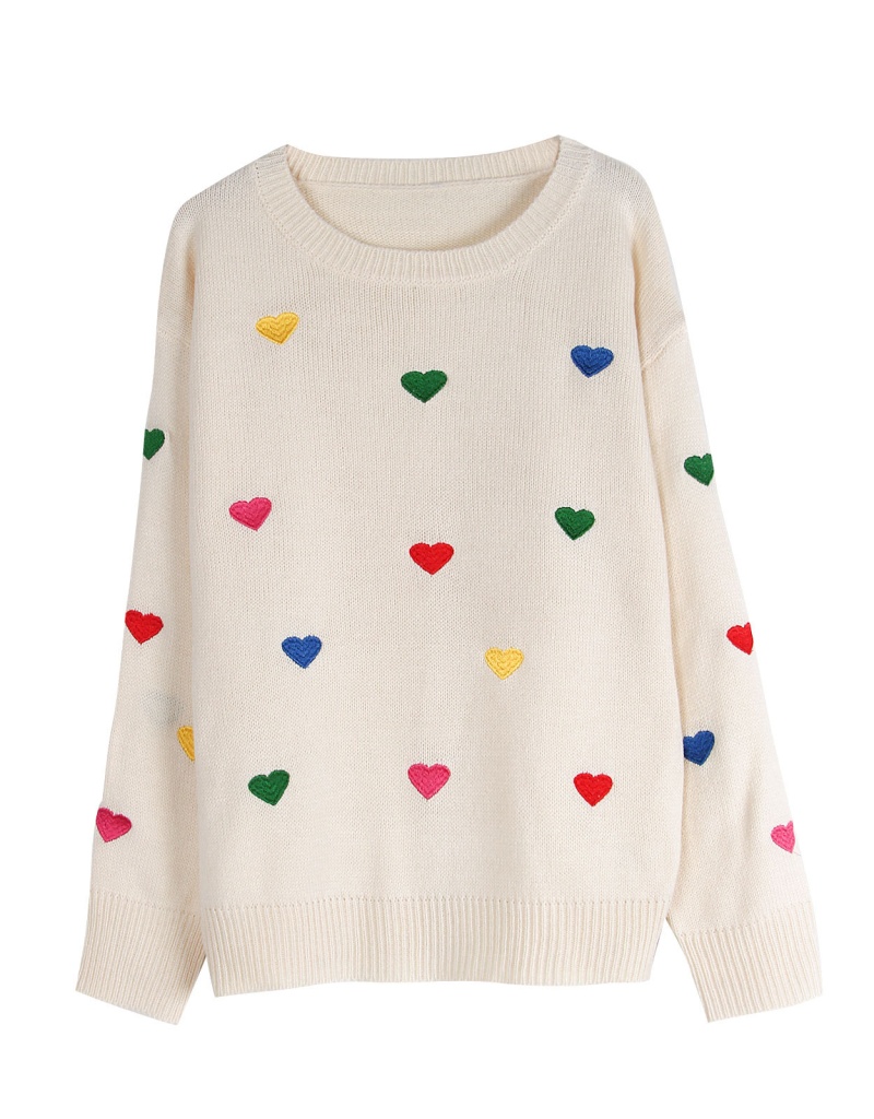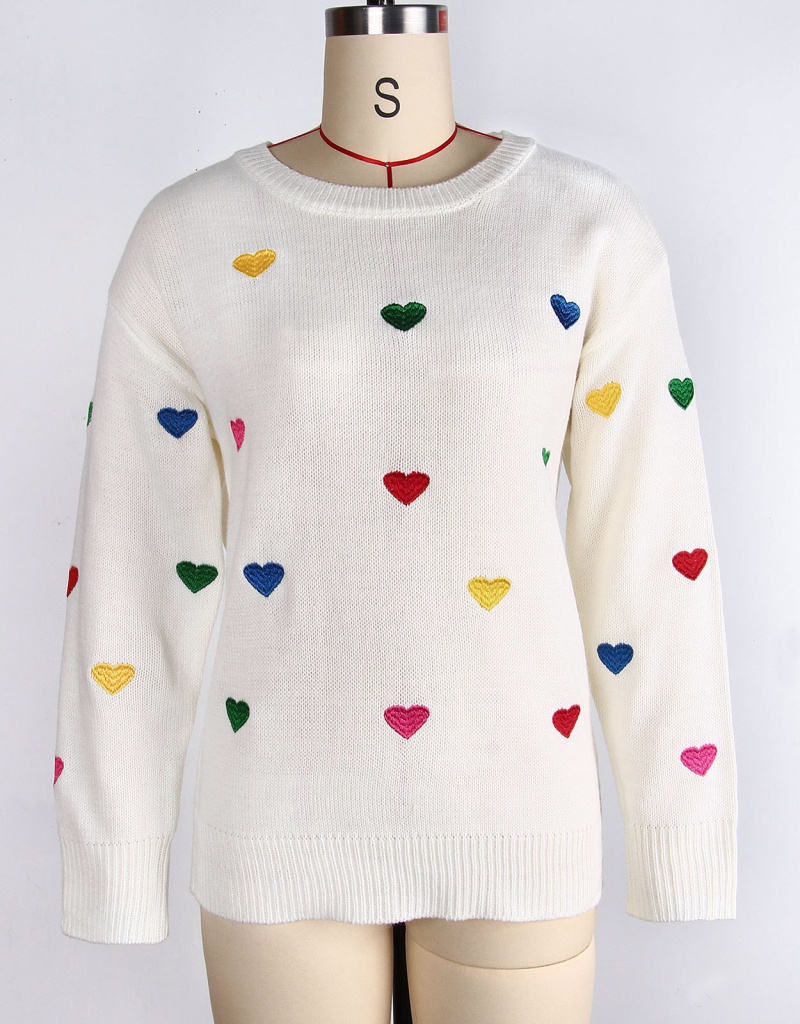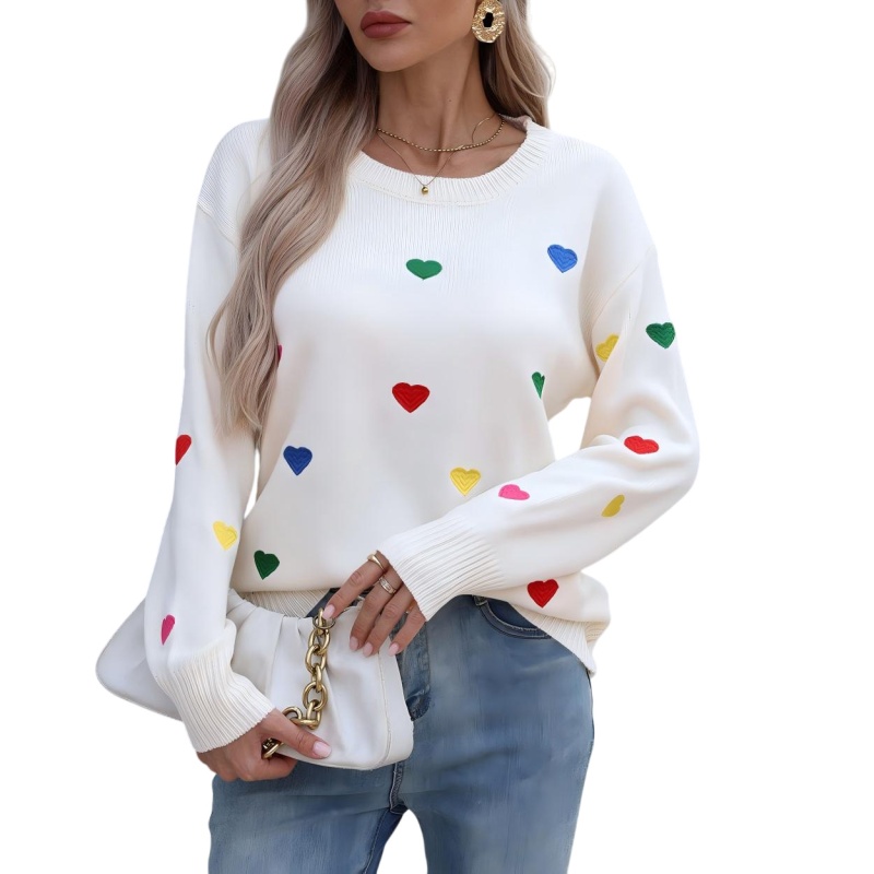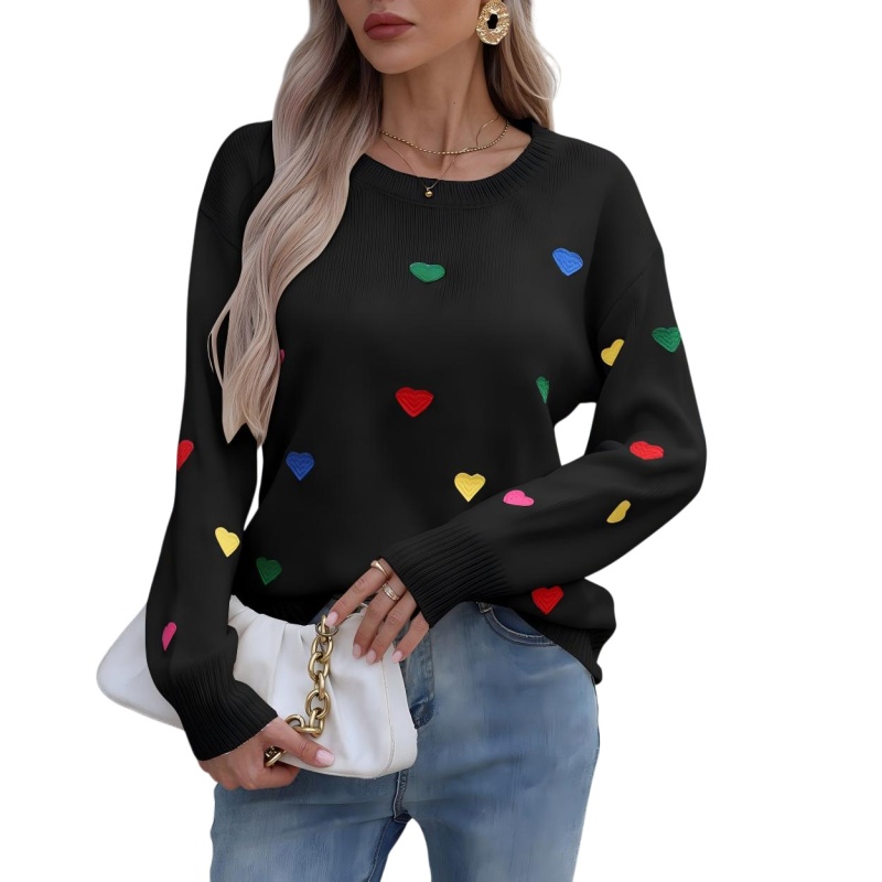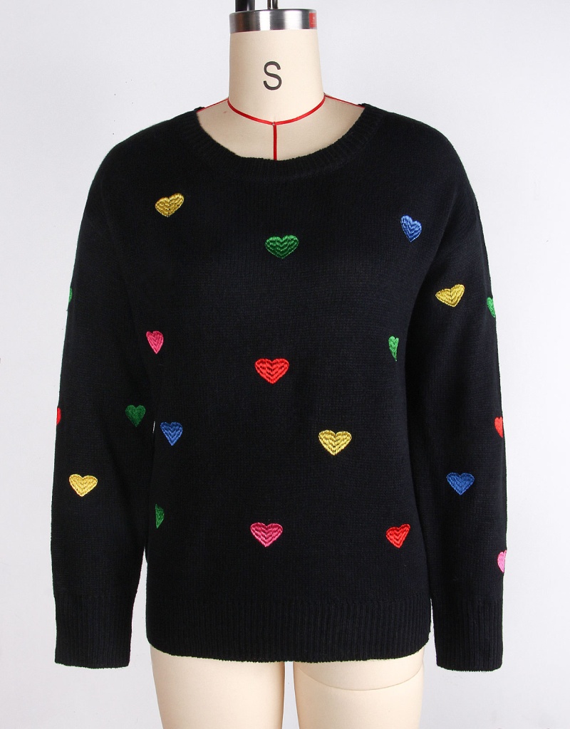秋冬跨境欧美外贸针织时尚彩色爱心提花长袖圆领套头毛衣女