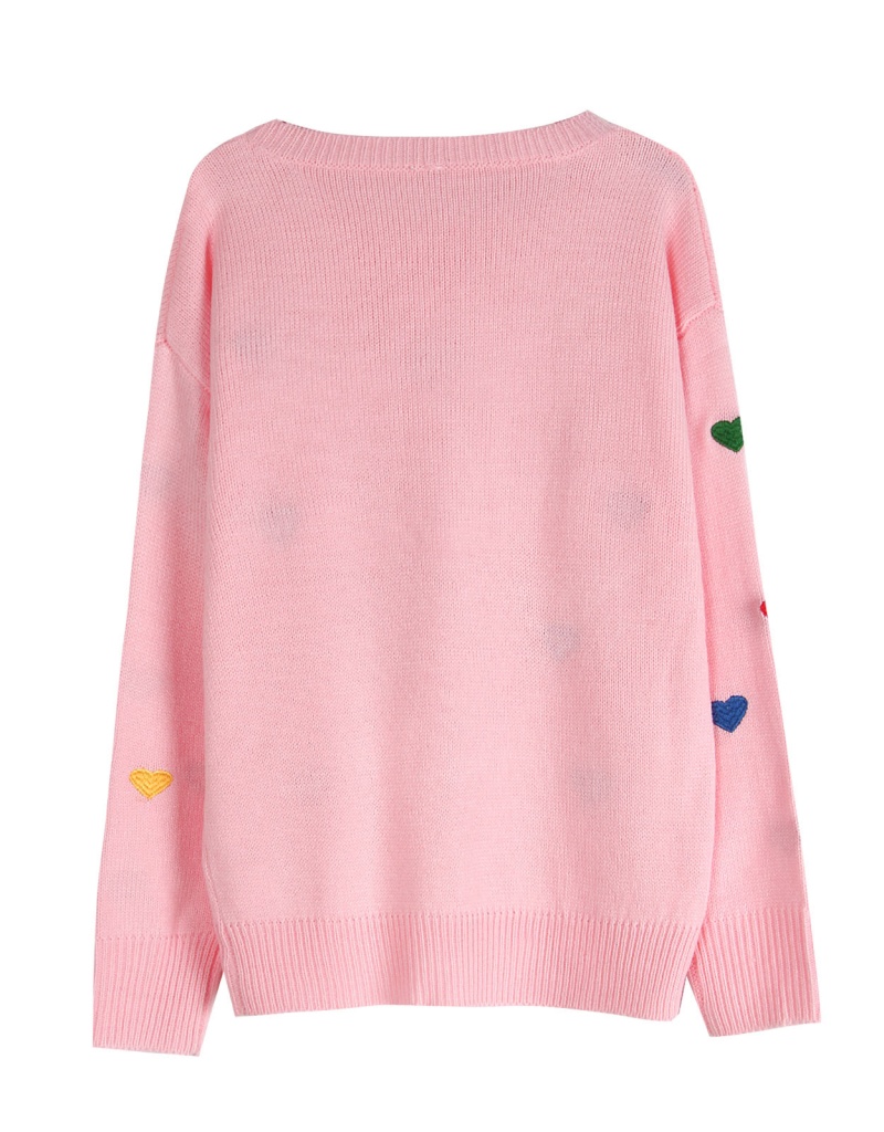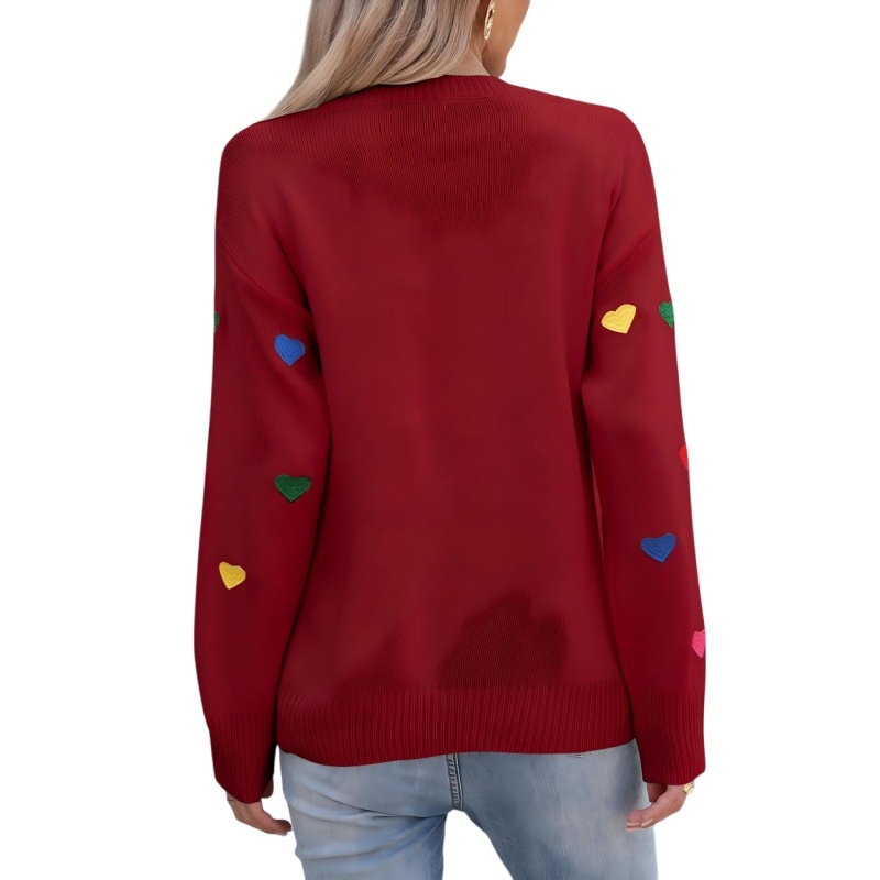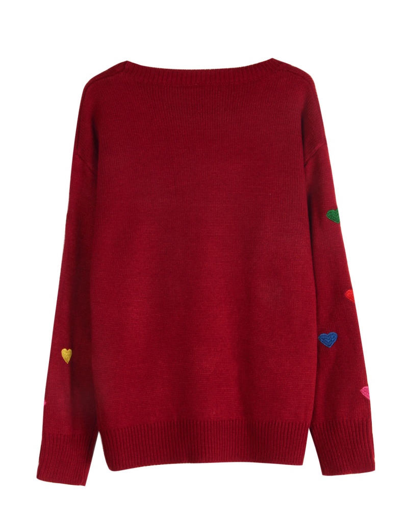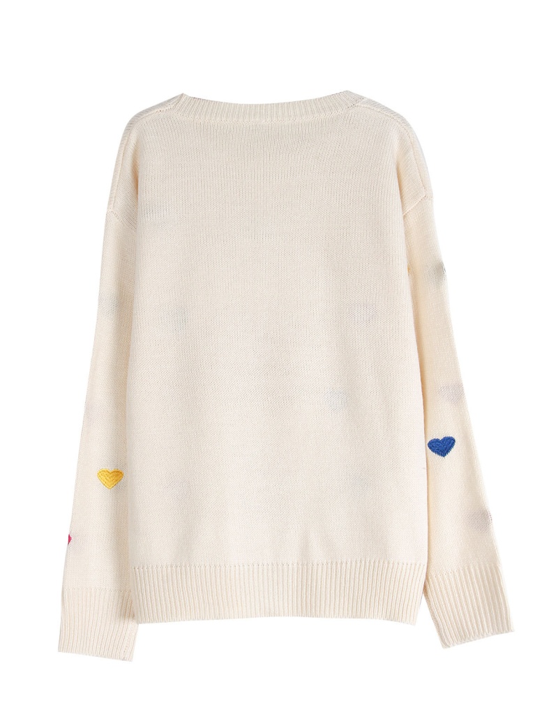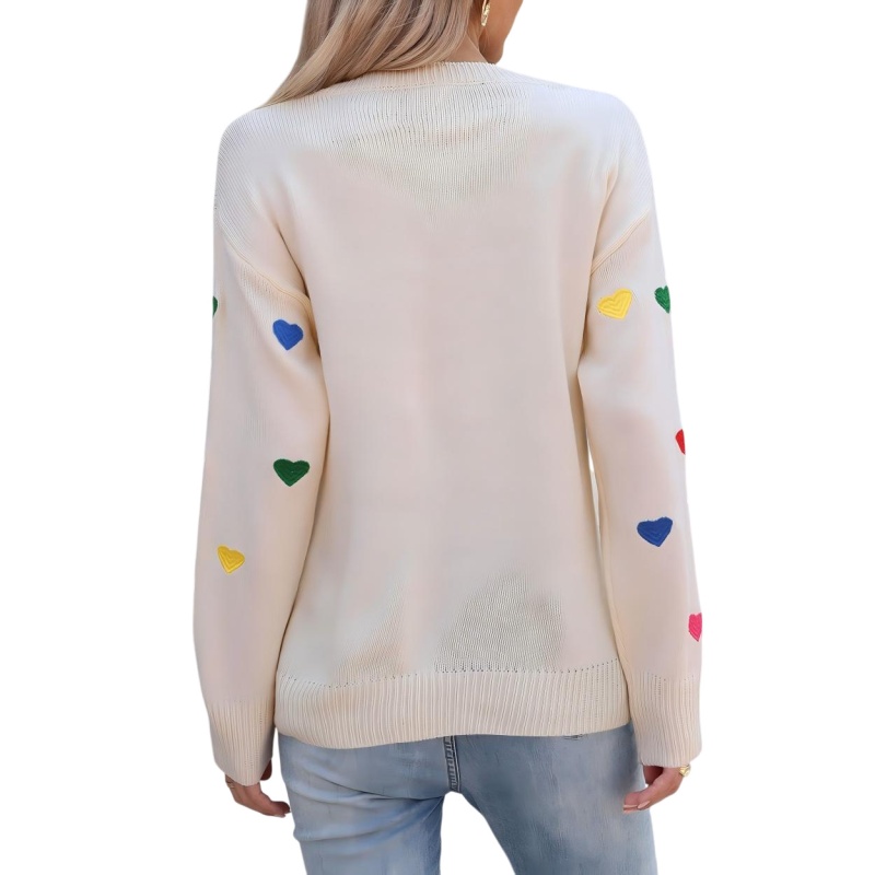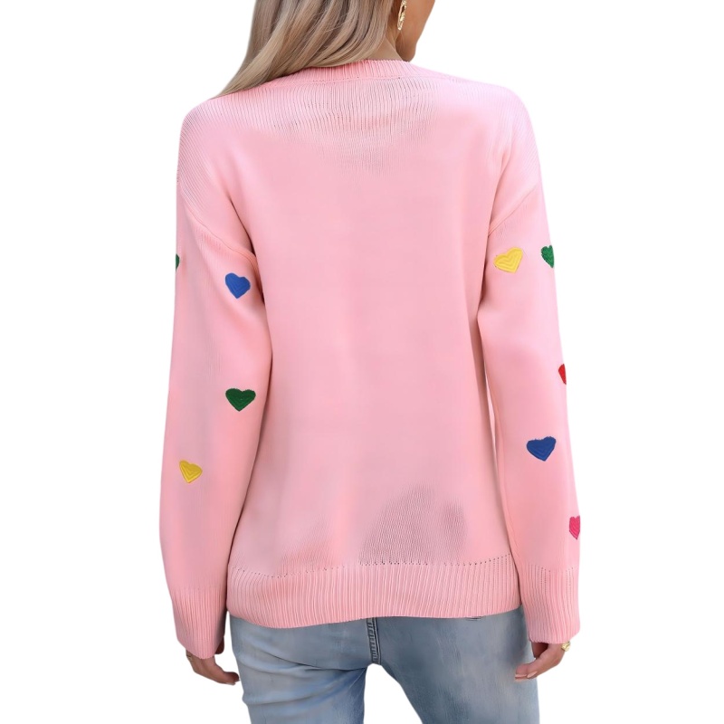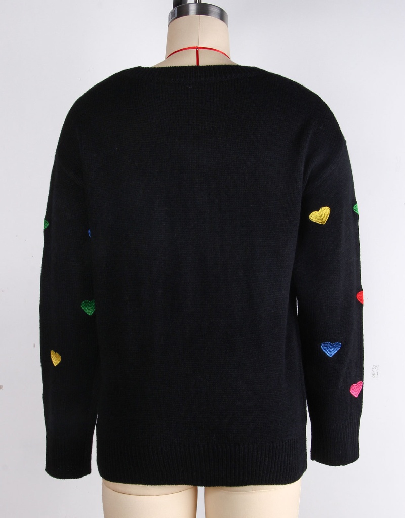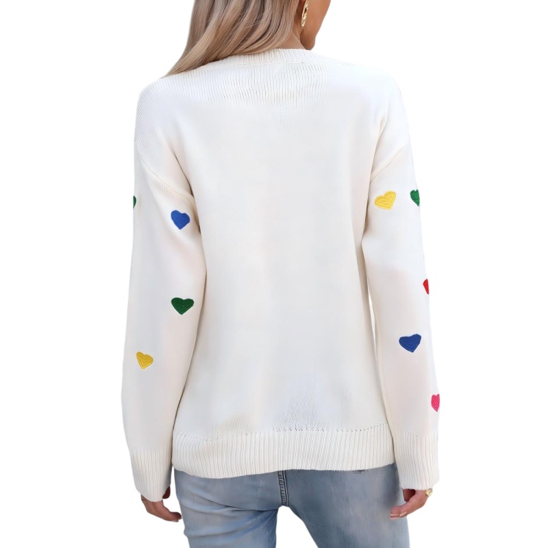 秋冬跨境欧美外贸针织时尚彩色爱心提花长袖圆领套头毛衣女