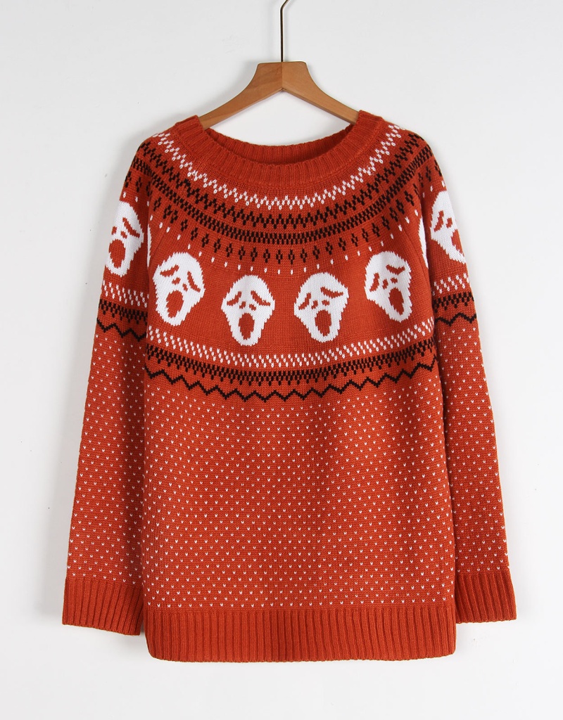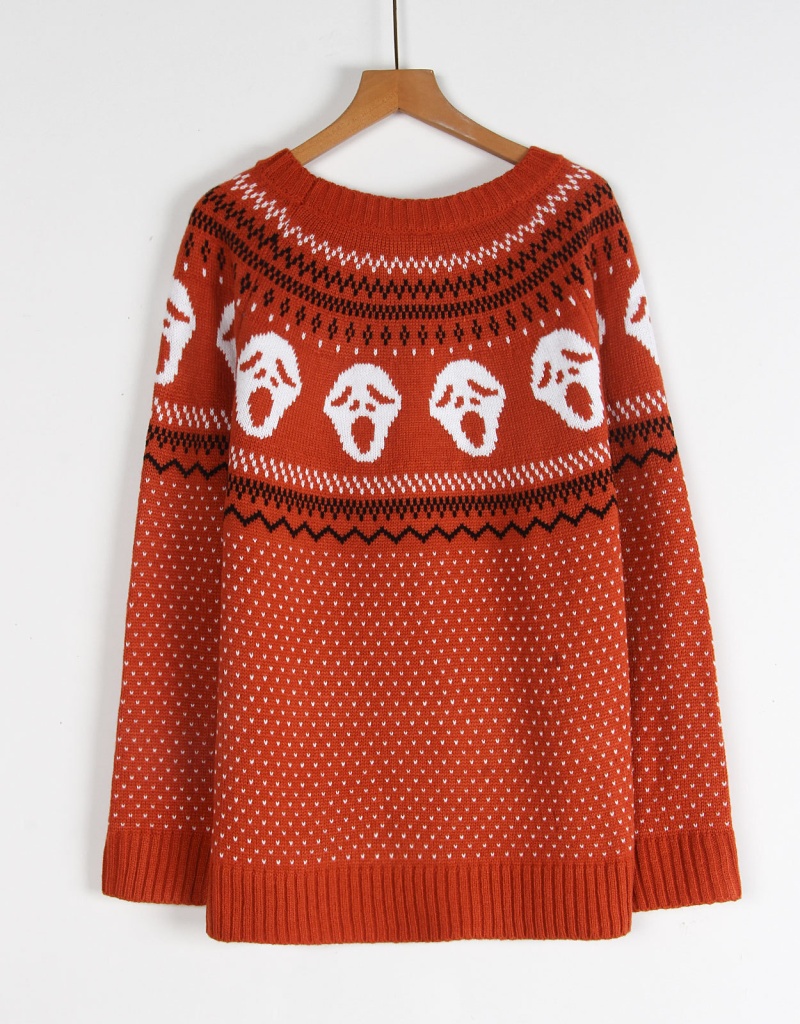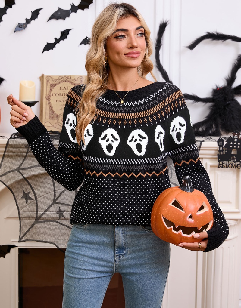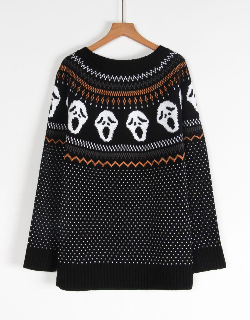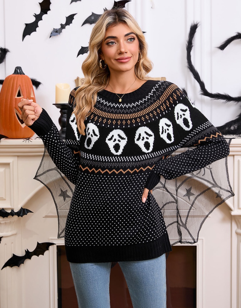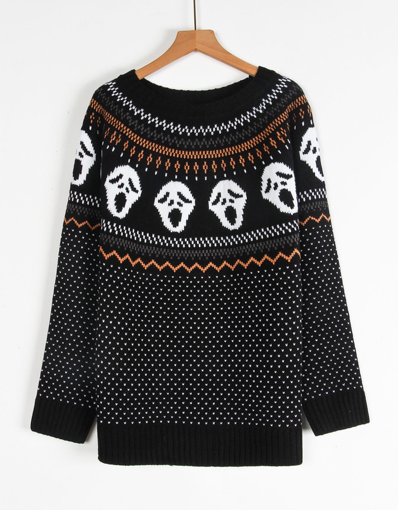 跨境秋冬新款欧美毛衣女装宽松万圣节独特骷髅提花圆领长袖针织衫