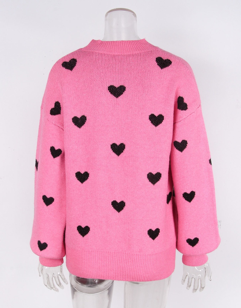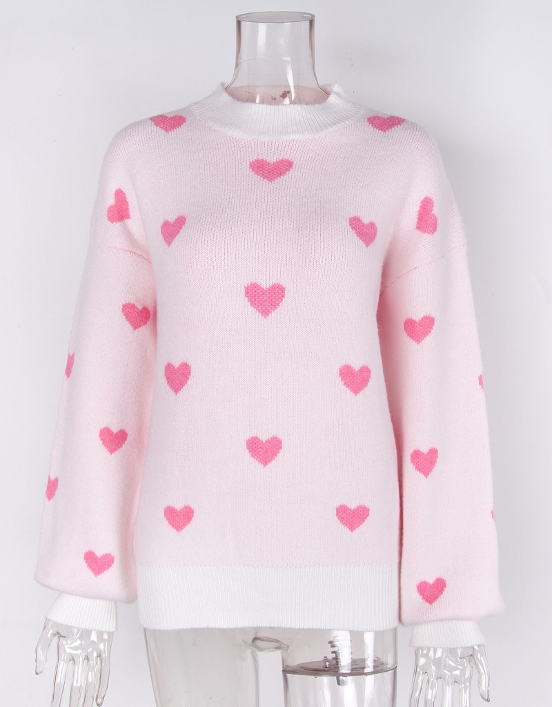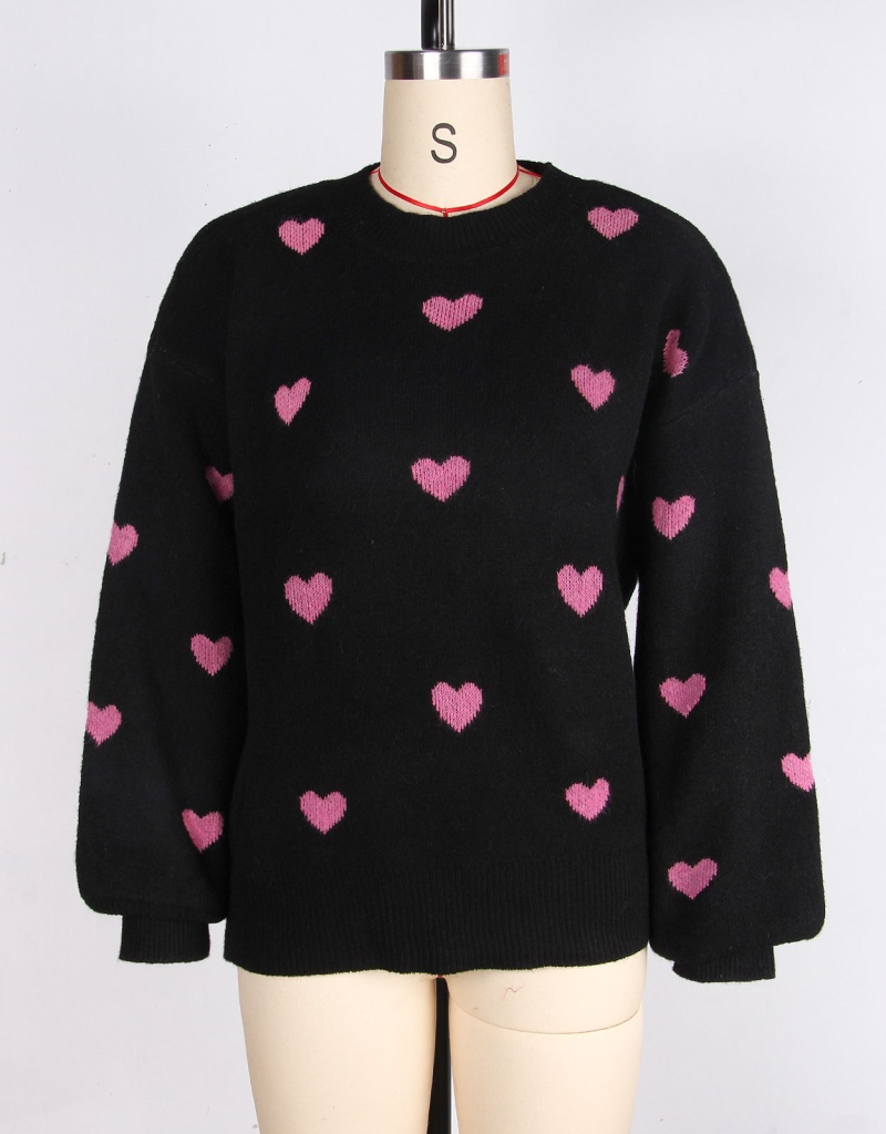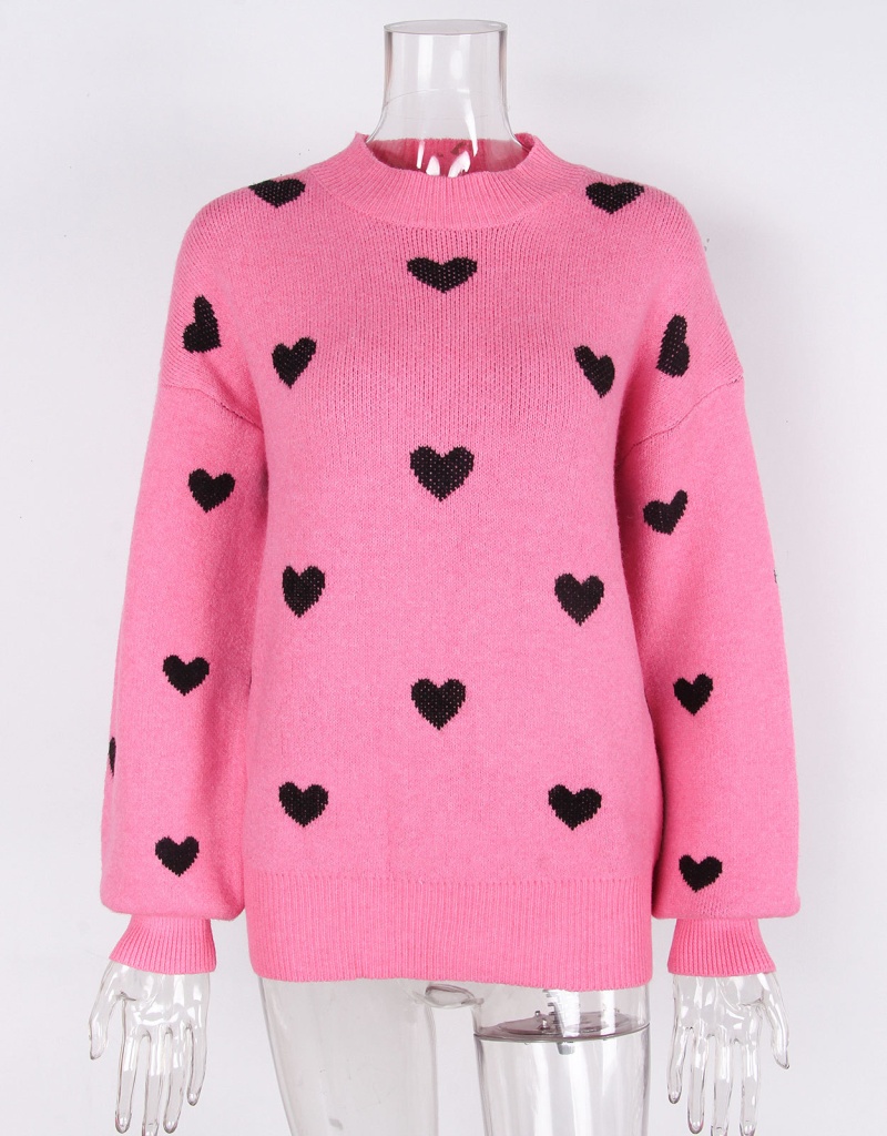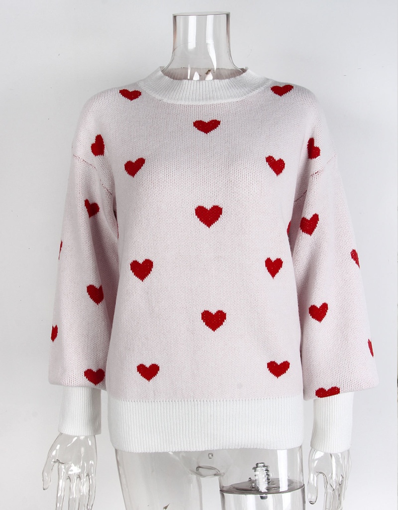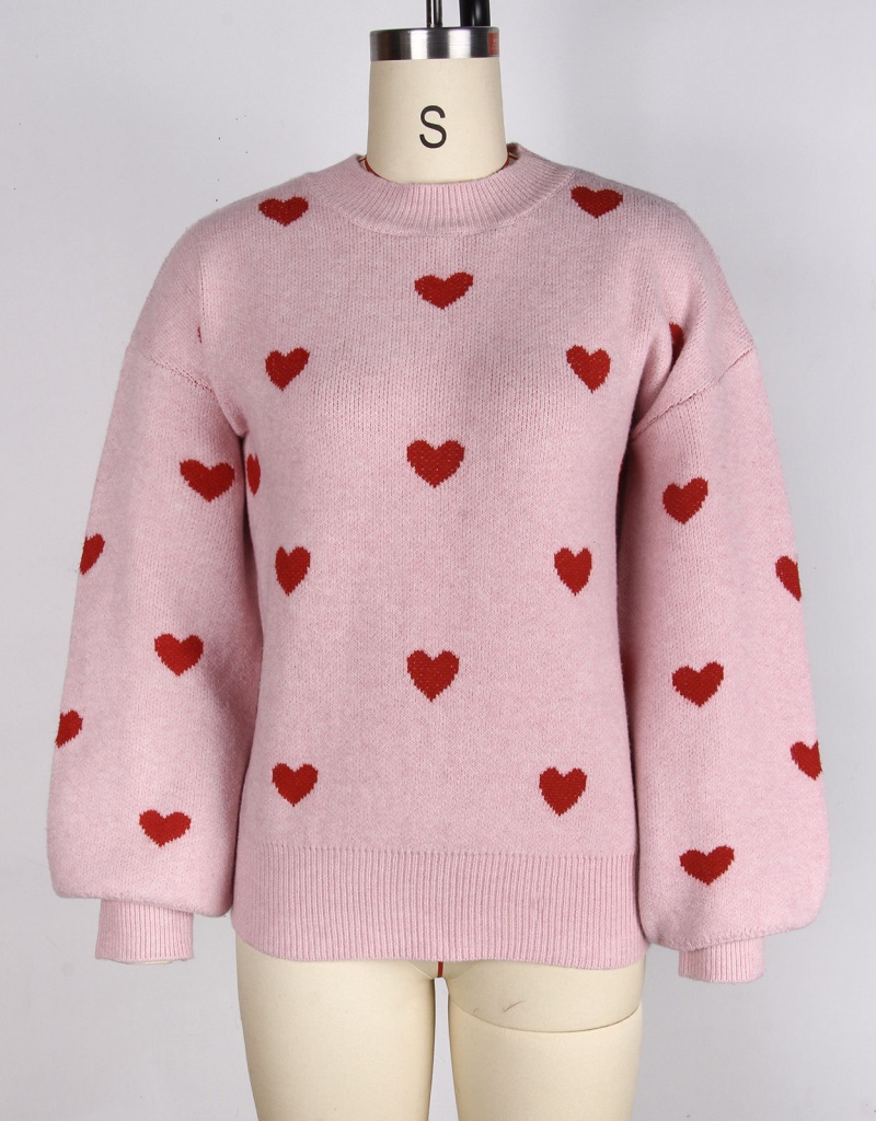 欧美秋冬情人节新款毛衣女跨境时尚爱心提花圆领套头针织衫