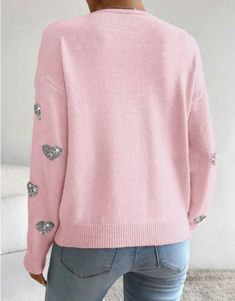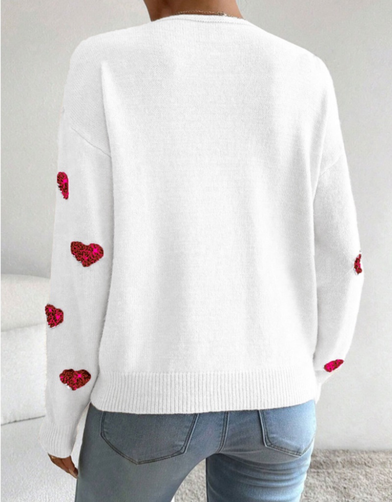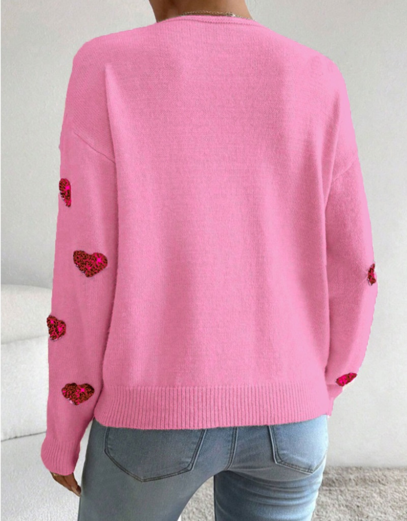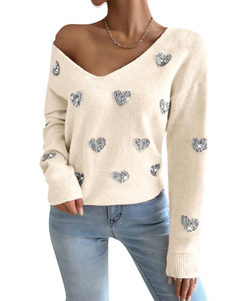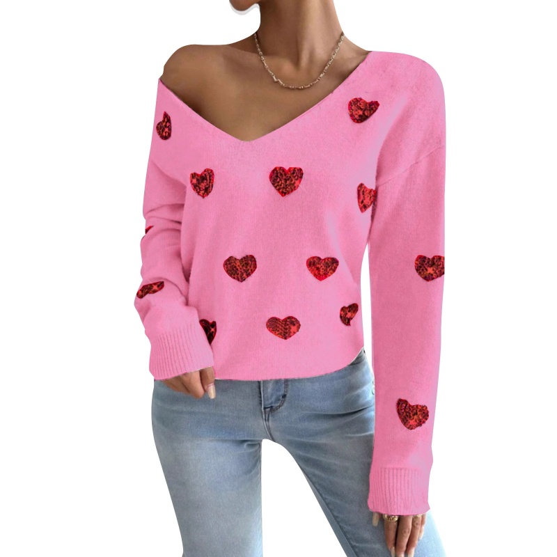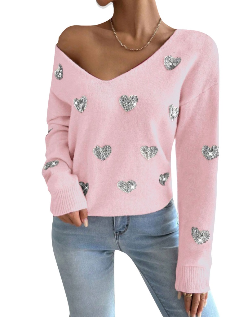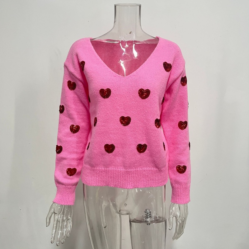 欧美秋冬跨境情人节设计感亮片爱心绣花V领套头毛衣女上衣