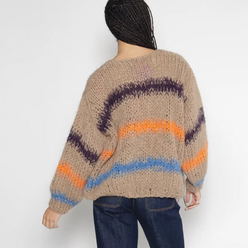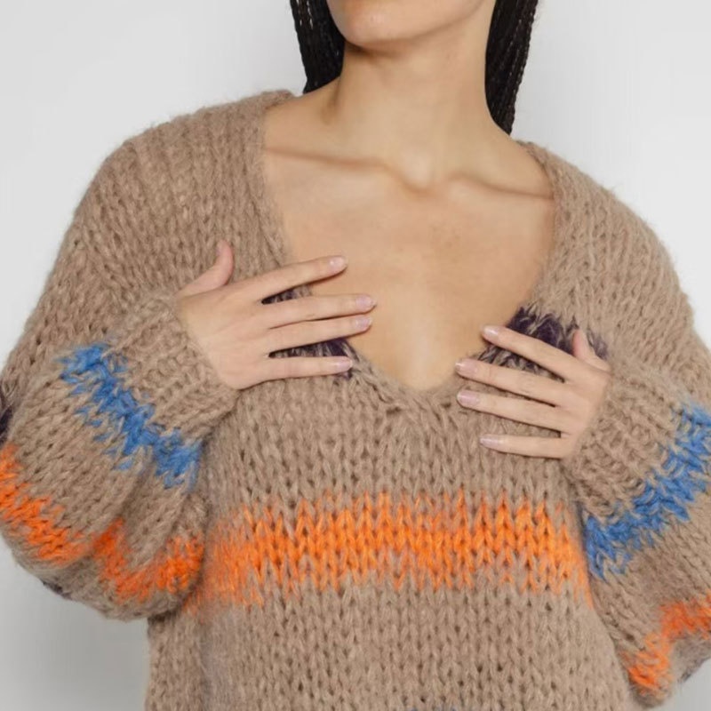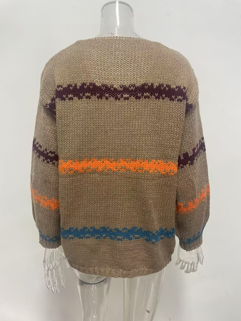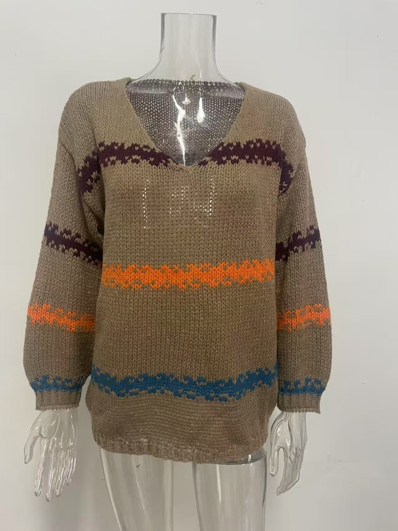 跨境新款秋冬欧美宽松彩色条纹拼色v领上衣针织衫长袖套头毛衣女