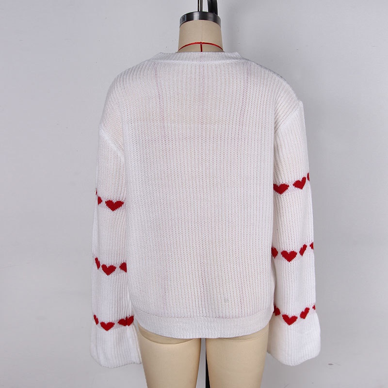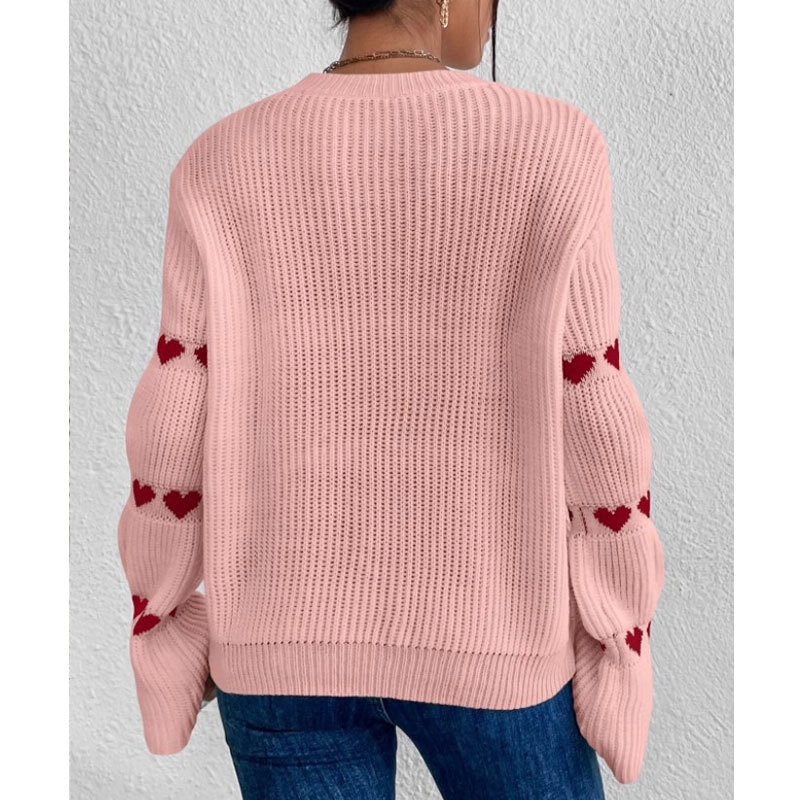 秋冬跨境欧美毛衣女装宽松长袖条纹手肘爱心套头圆领针织衫