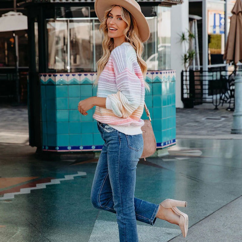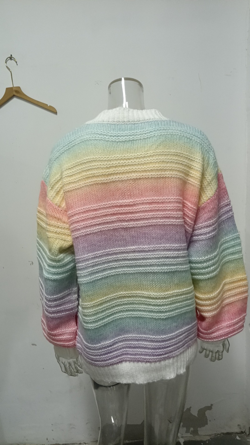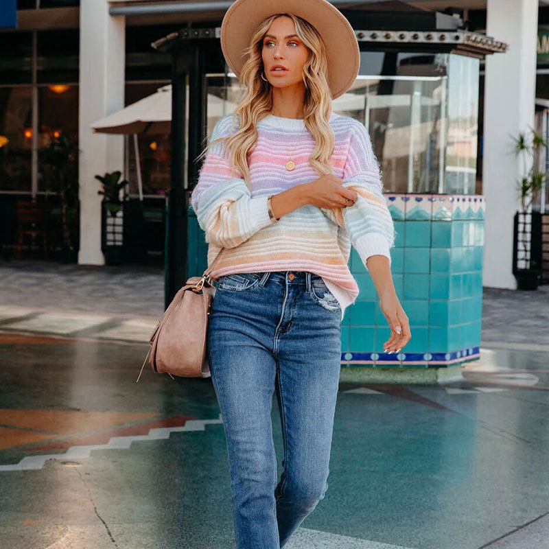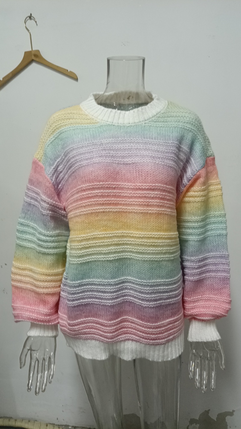 秋冬欧美套头条纹圆领针织衫跨境宽松长袖大码彩虹毛衣女装