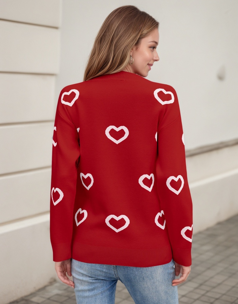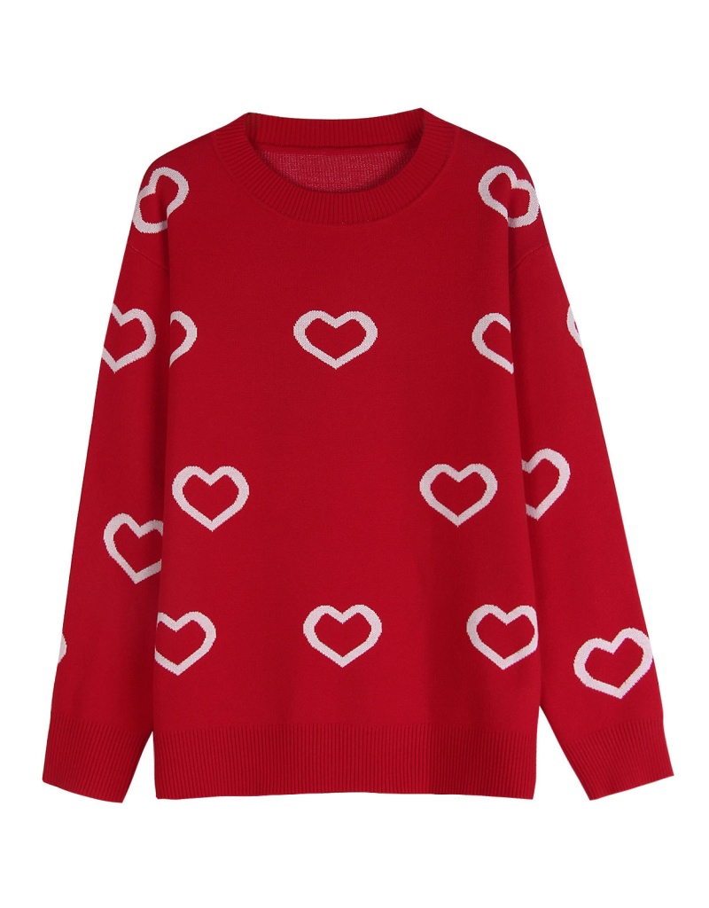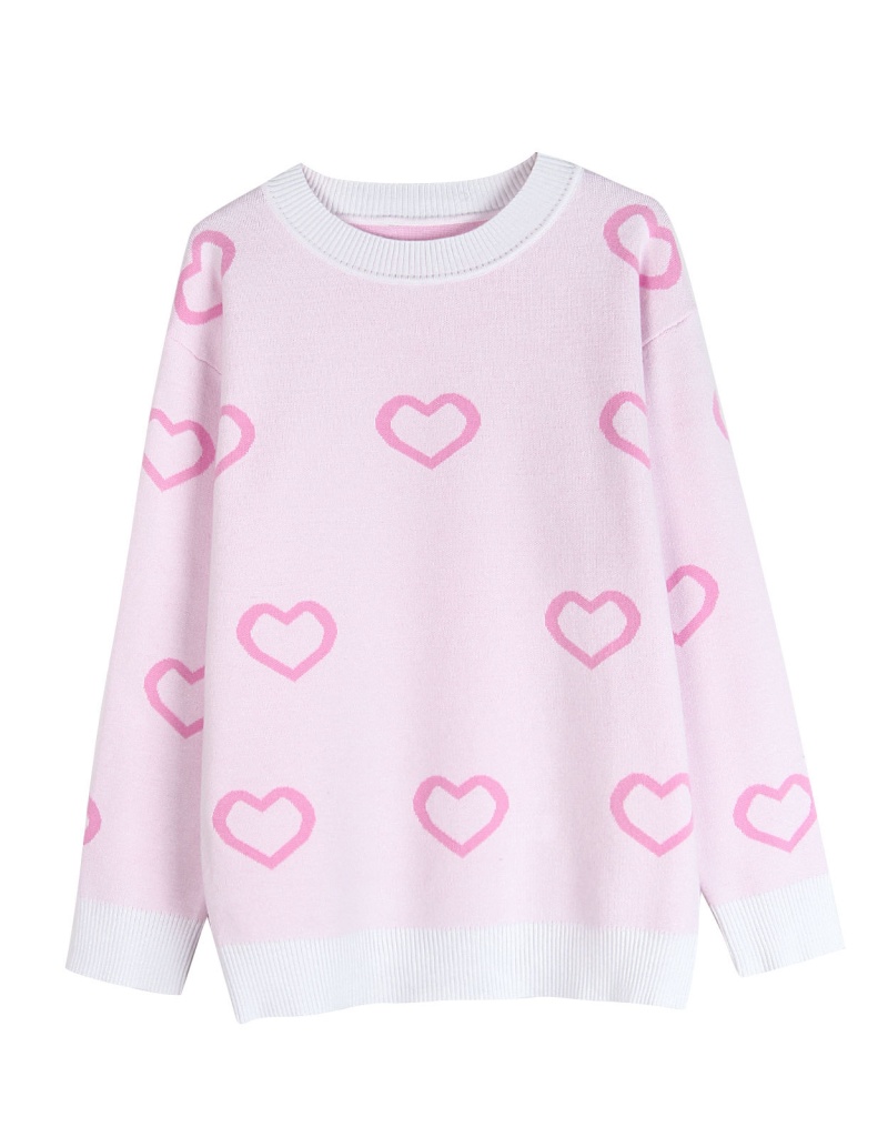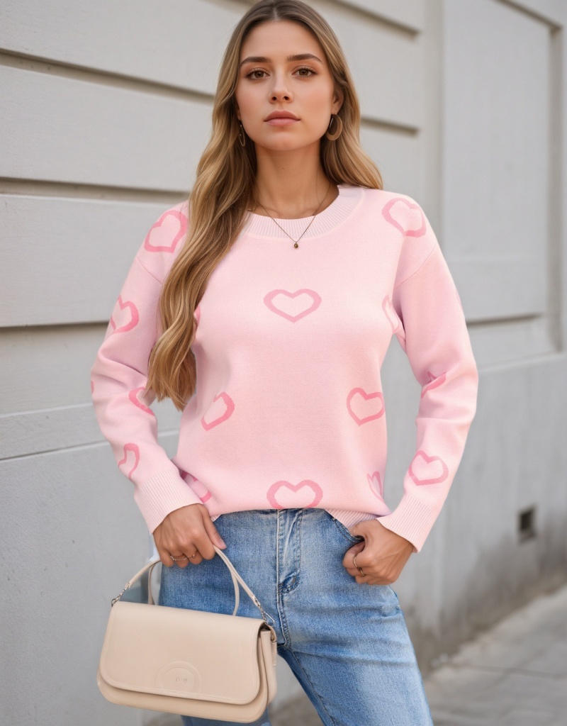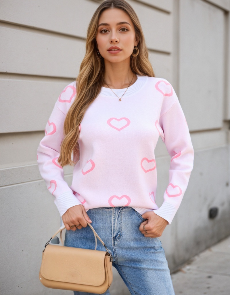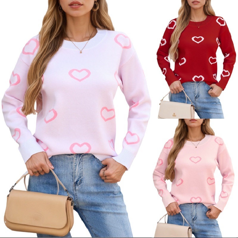 欧美秋冬新款跨境针织时尚爱心撞色长袖圆领套头毛衣女上衣