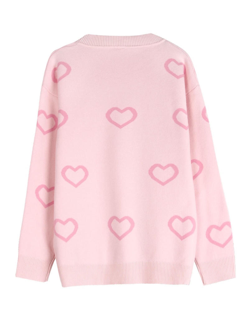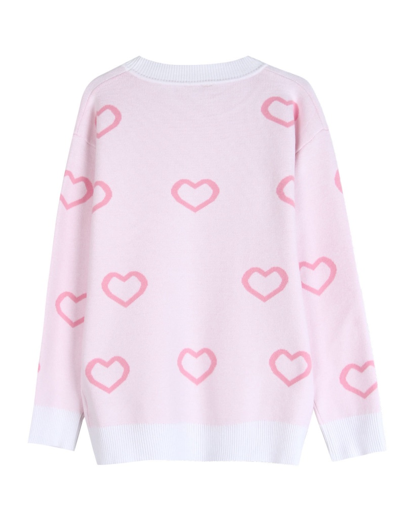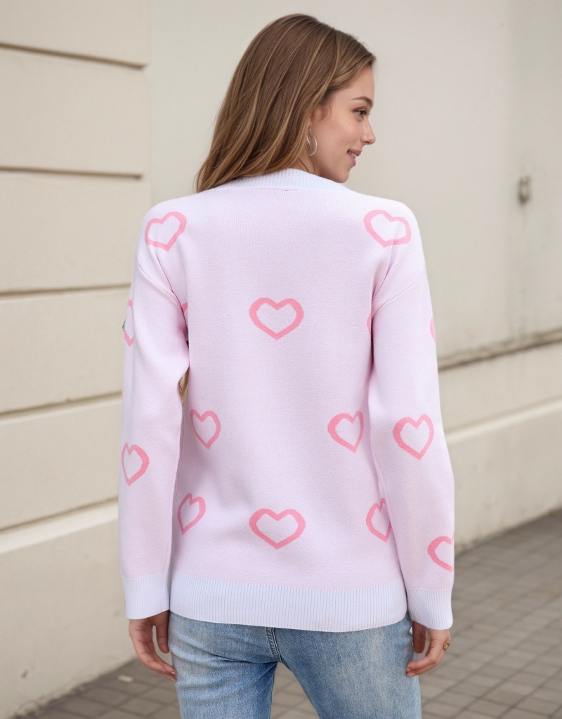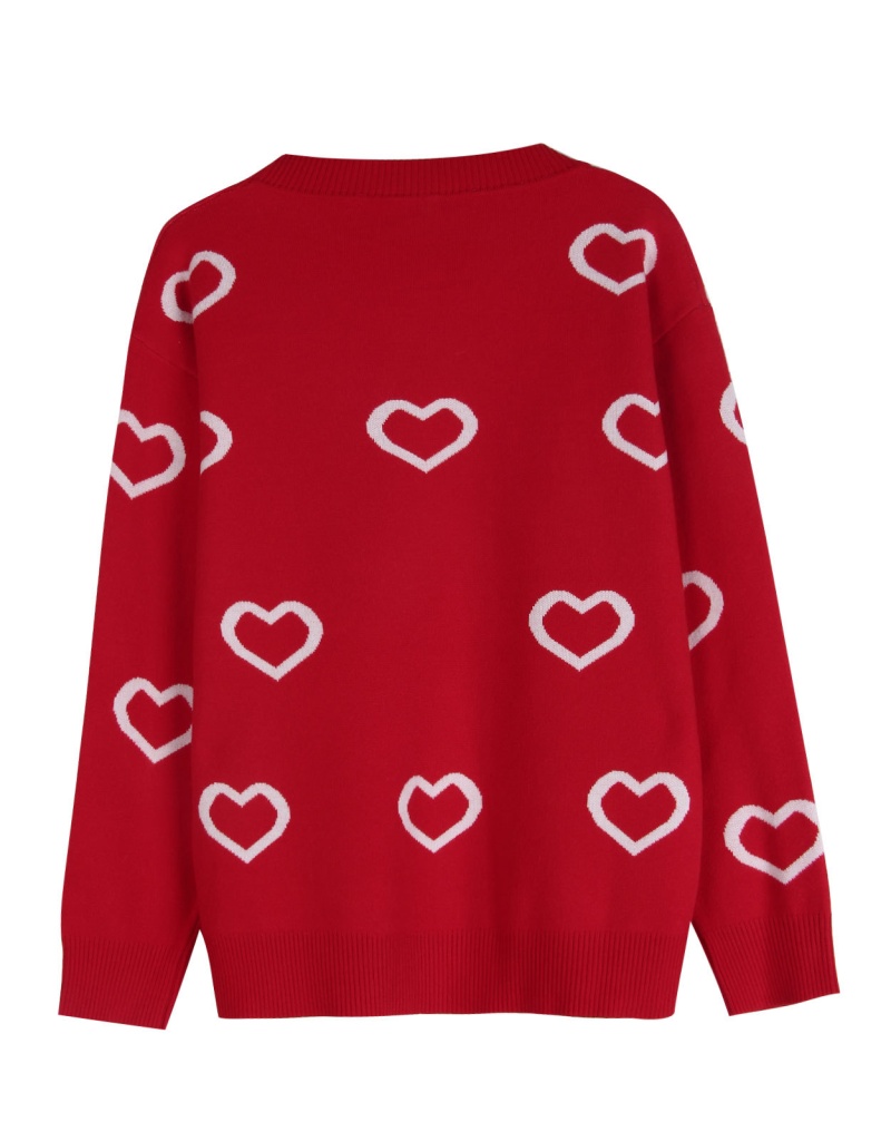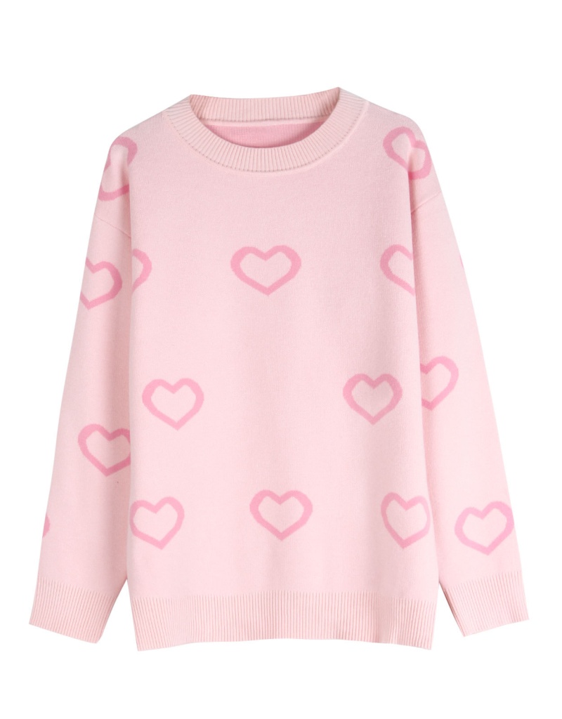 欧美秋冬新款跨境针织时尚爱心撞色长袖圆领套头毛衣女上衣
