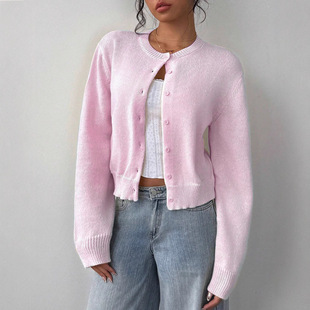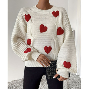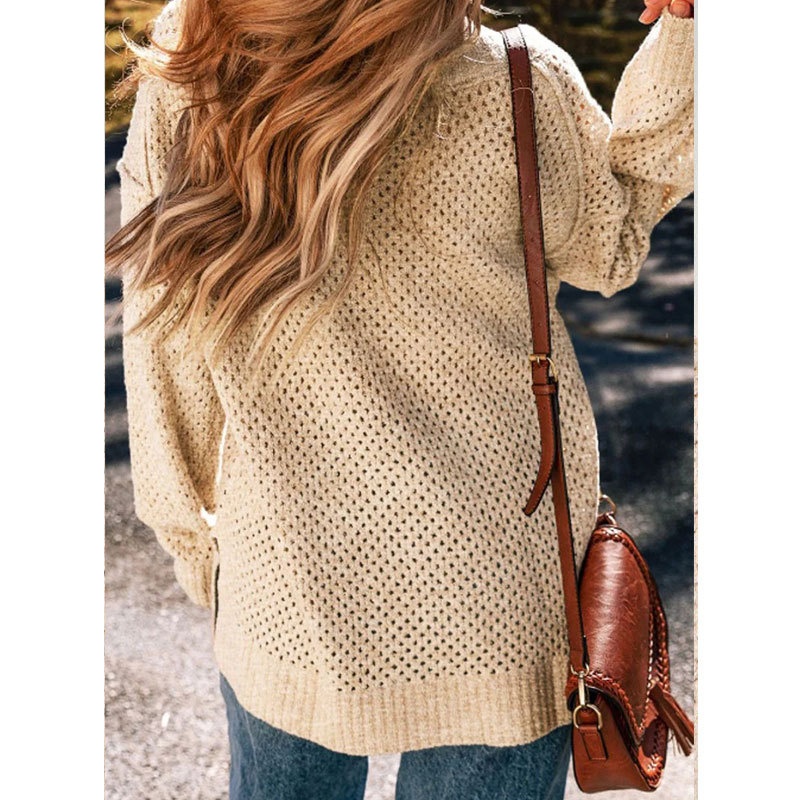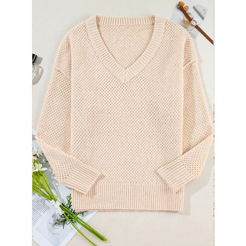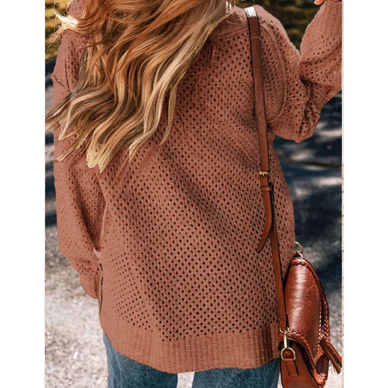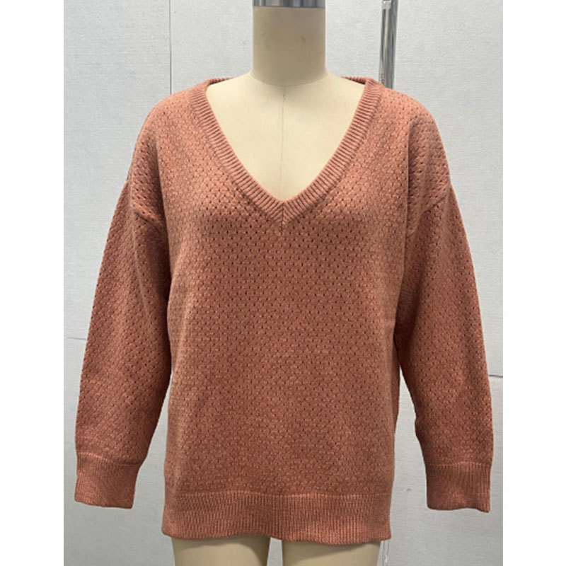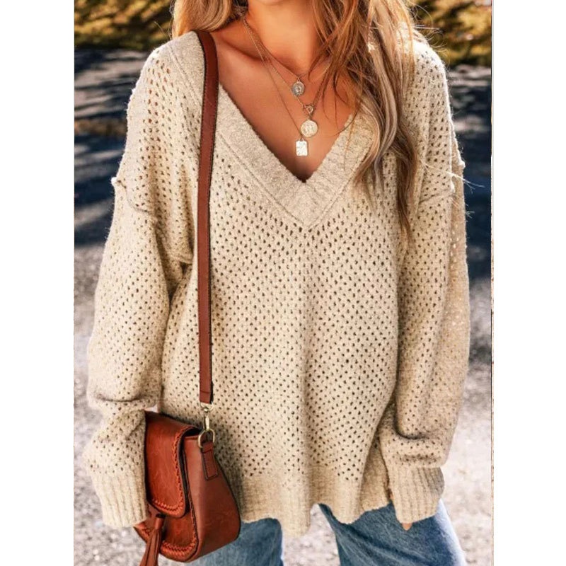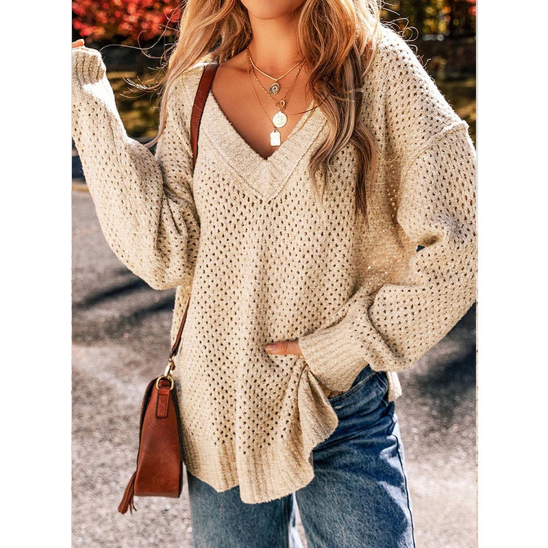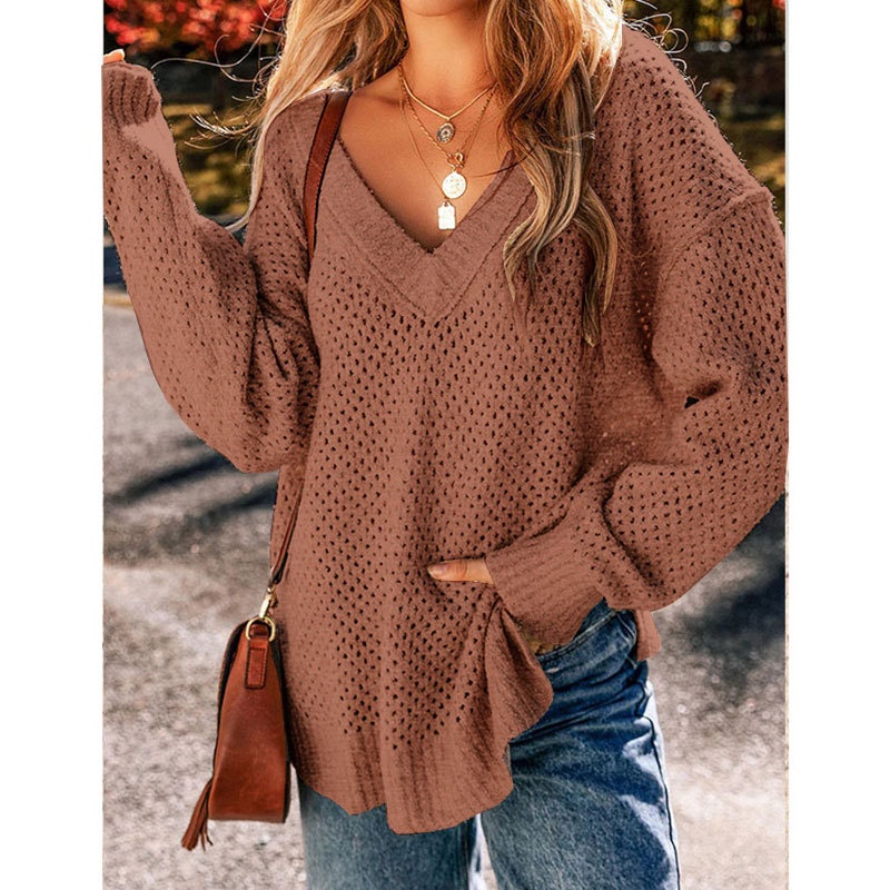 欧美跨境秋冬毛衣女 宽松针织镂空休闲V领套头长袖百搭上衣