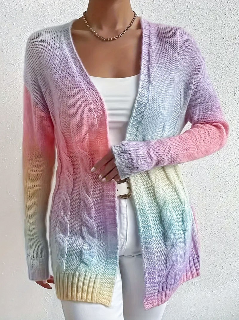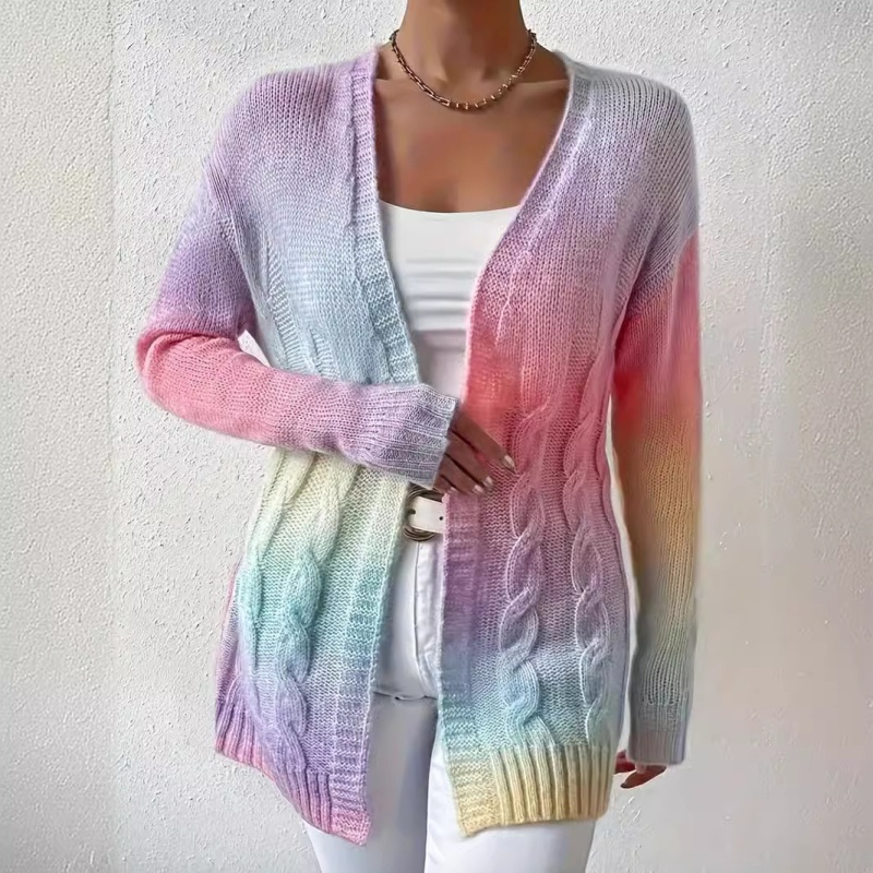 秋冬欧美外贸毛衣女装开衫外套跨境彩虹扎染麻花长袖针织衫