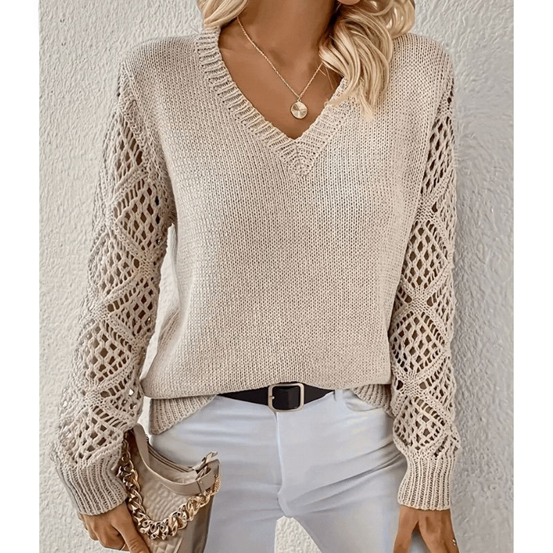 欧美外贸时尚毛衣女针织衫 慵懒风镂空长袖V领套头百搭上衣