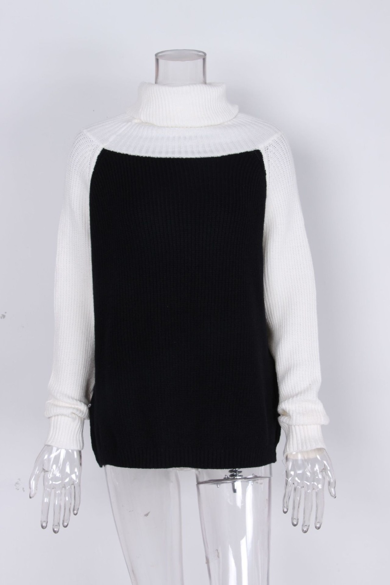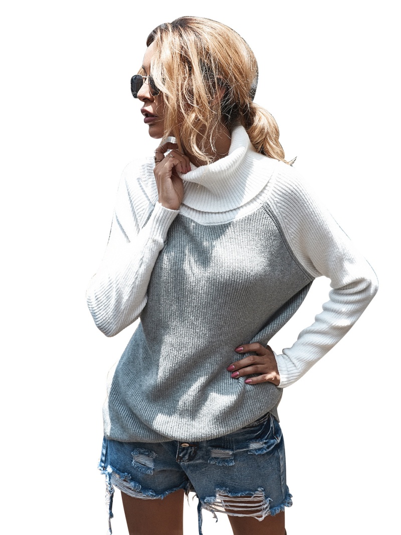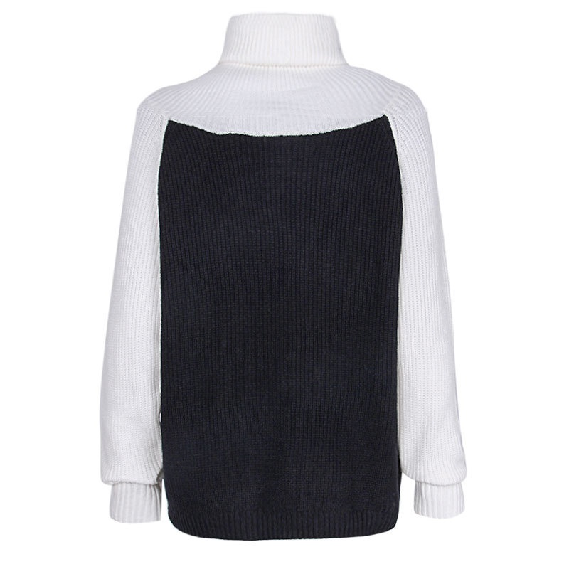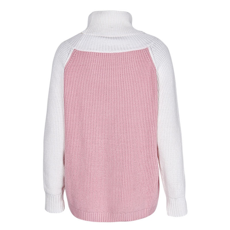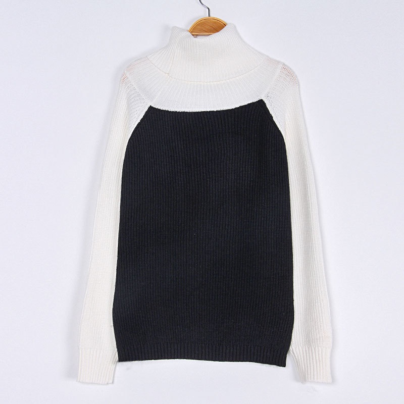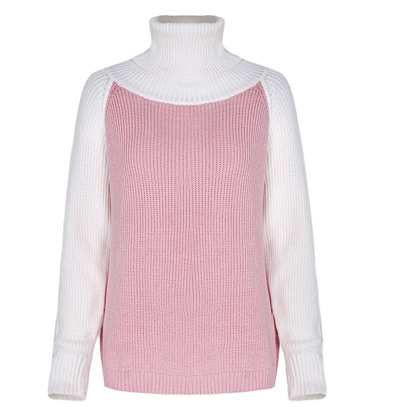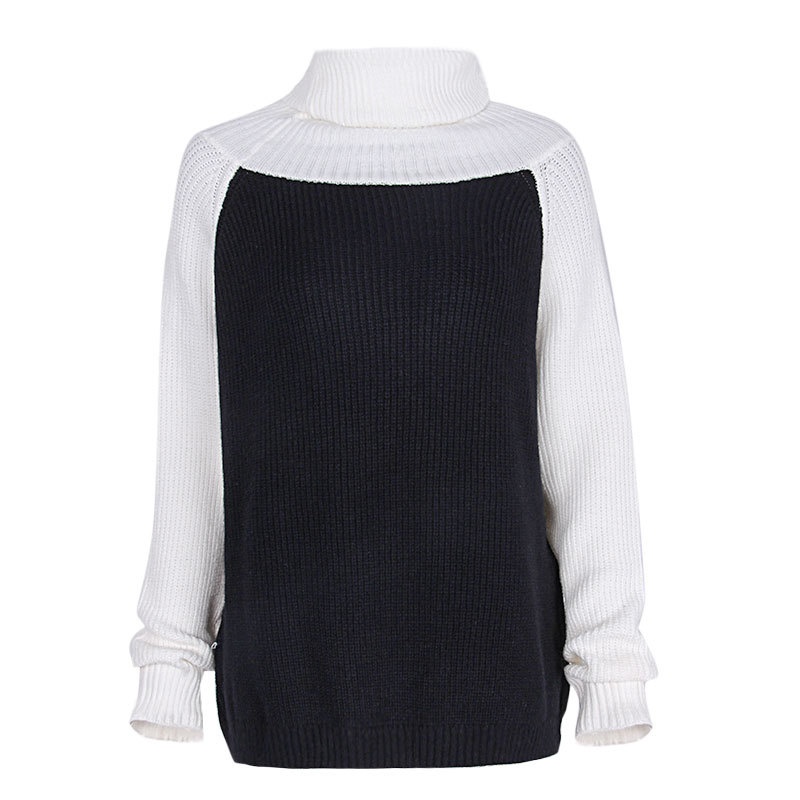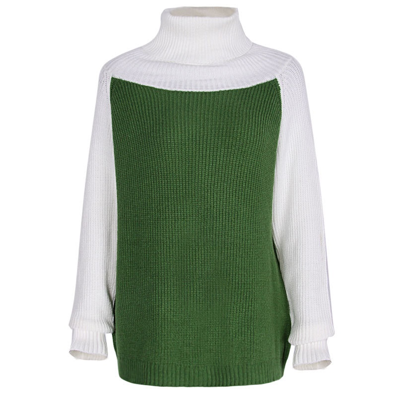 秋冬跨境新款欧美毛衣女装宽松大码高领套头撞色毛衣针织衫