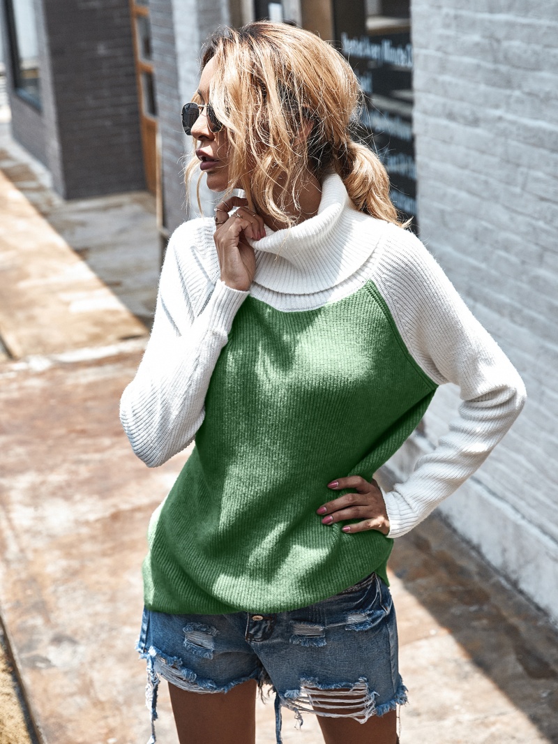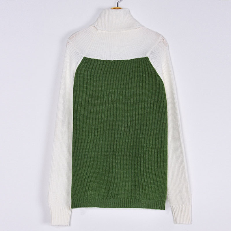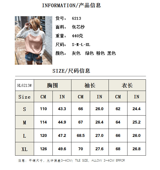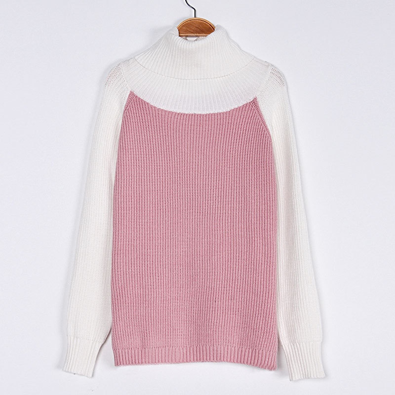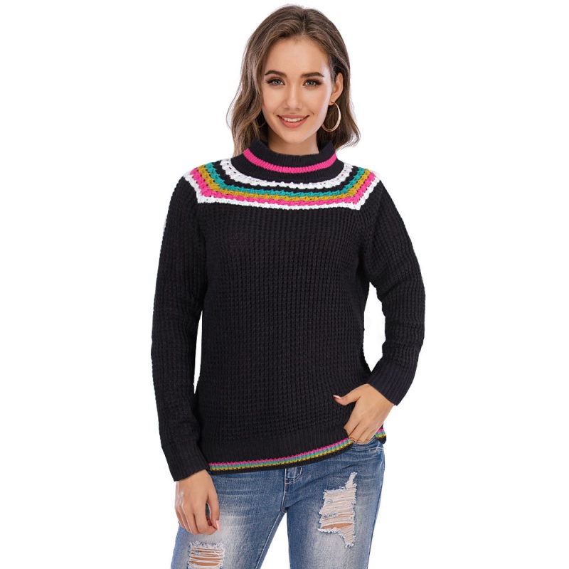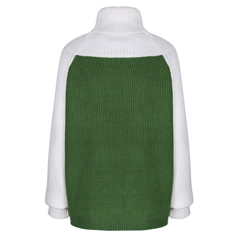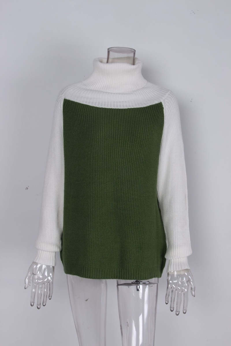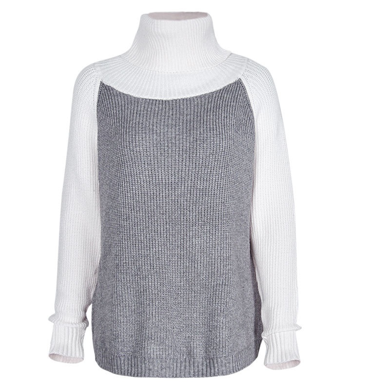 秋冬跨境新款欧美毛衣女装宽松大码高领套头撞色毛衣针织衫
