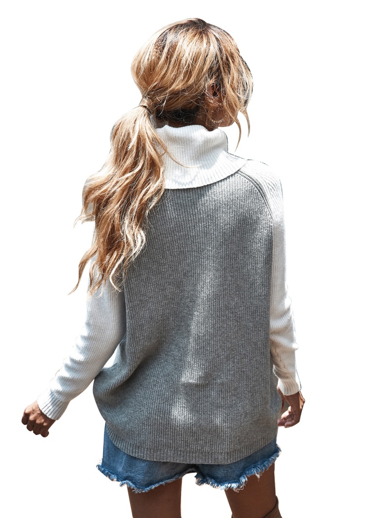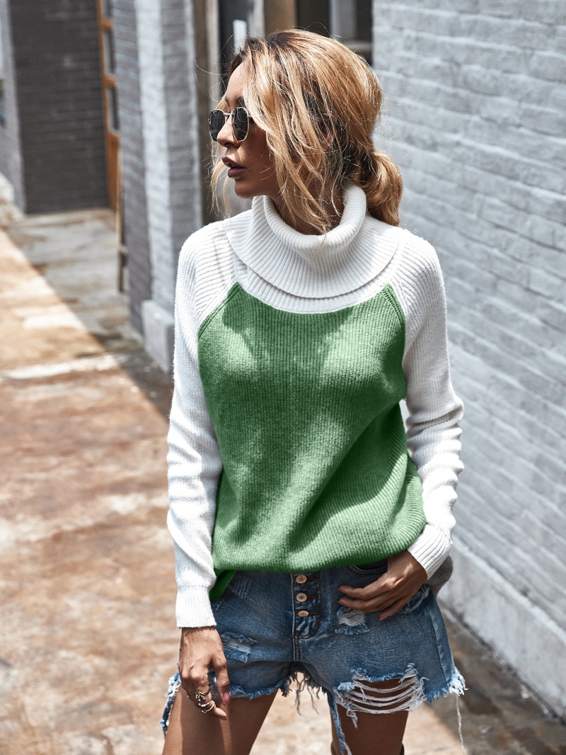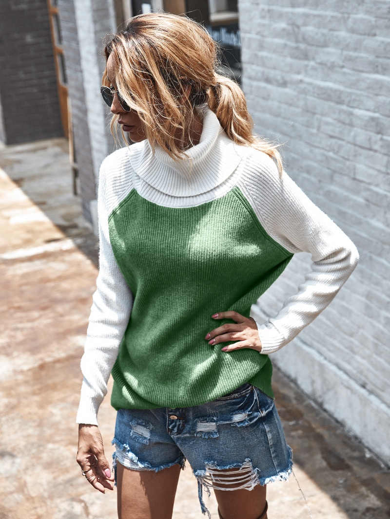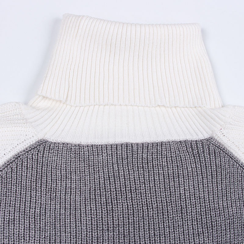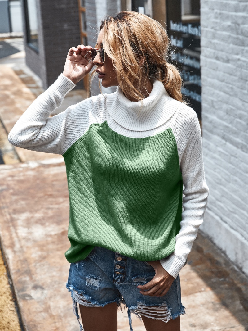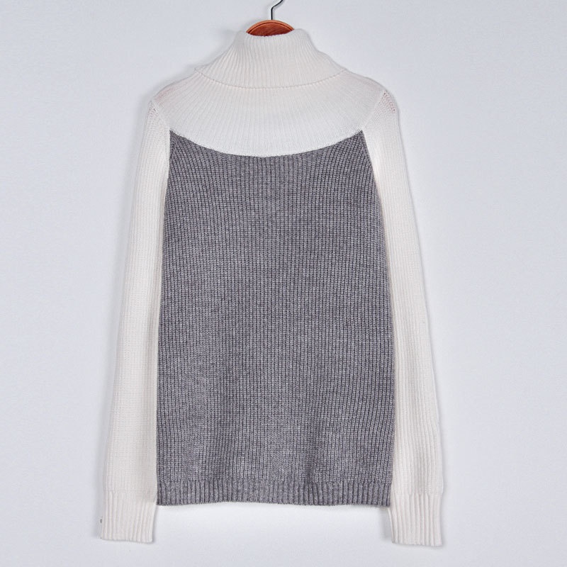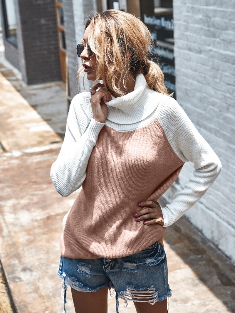 秋冬跨境新款欧美毛衣女装宽松大码高领套头撞色毛衣针织衫