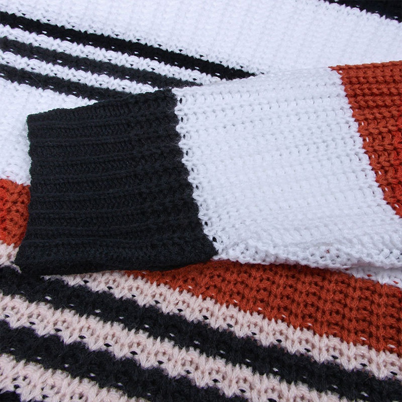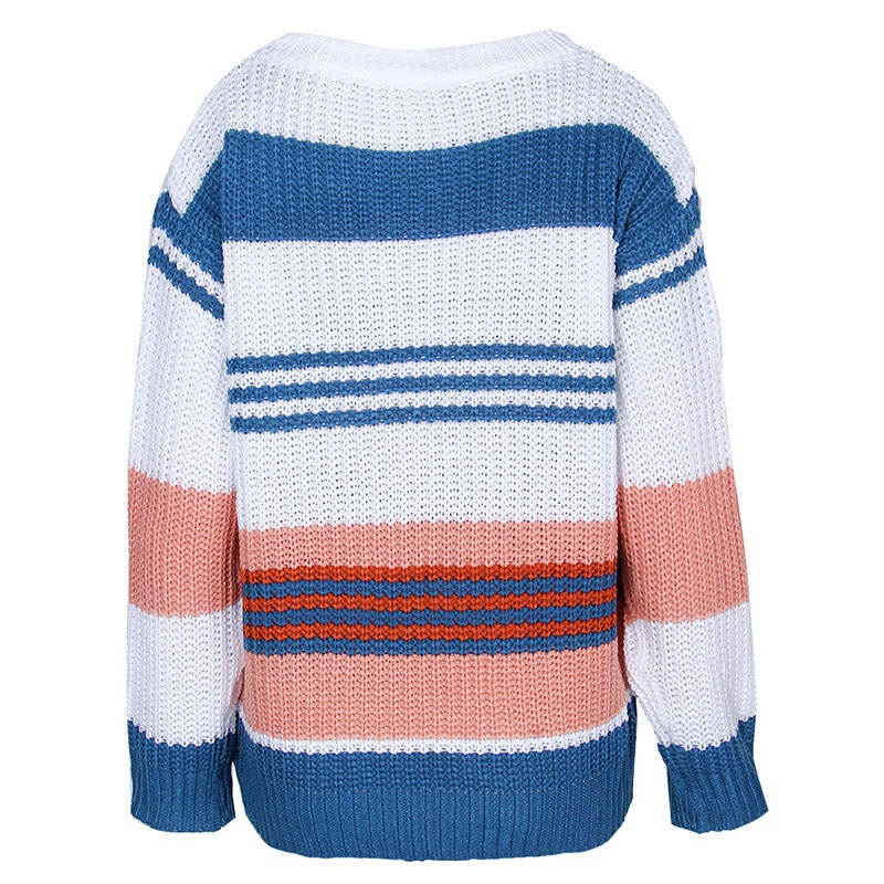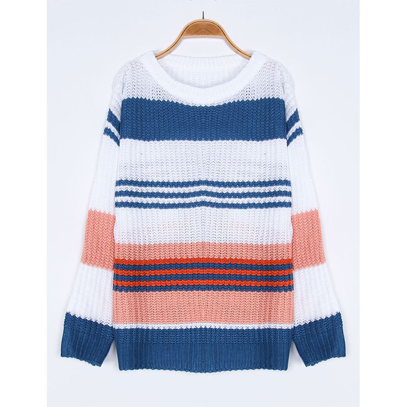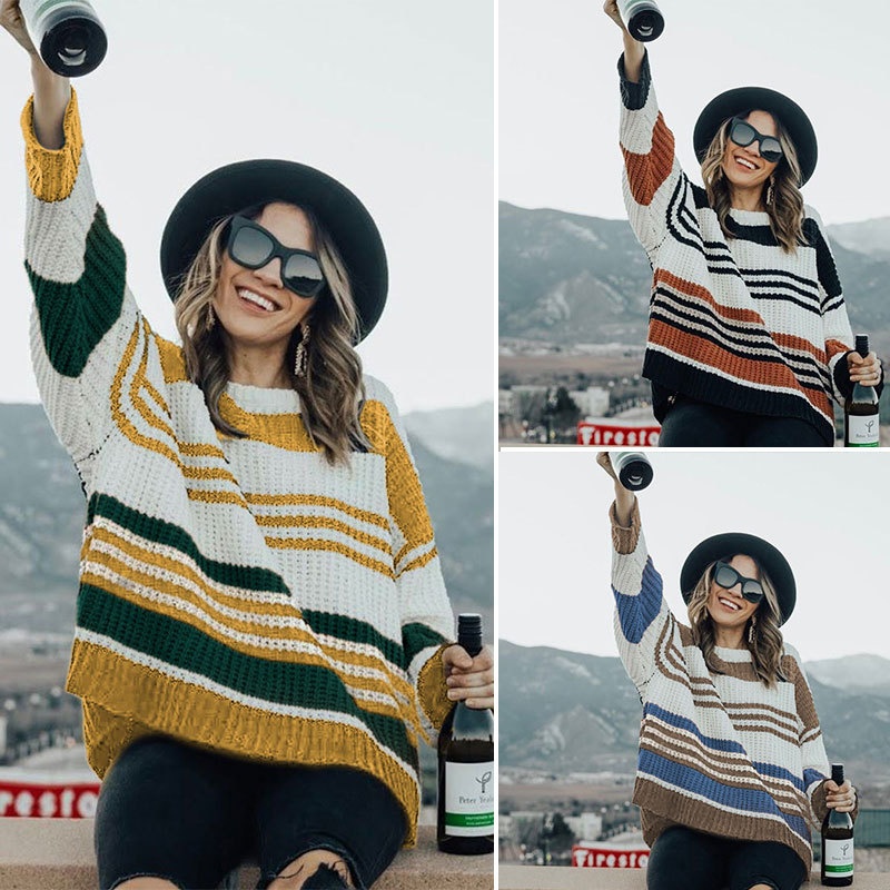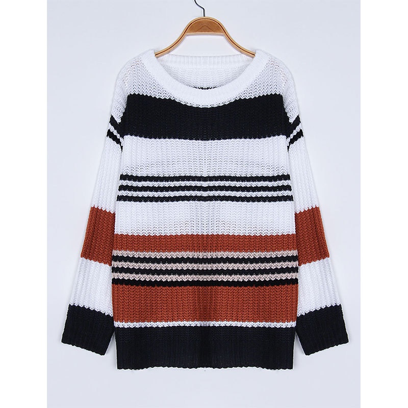 跨境秋冬新款欧美毛衣女装休闲宽松圆领条纹拼接撞色针织衫毛衣女