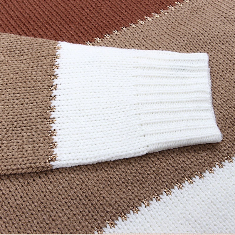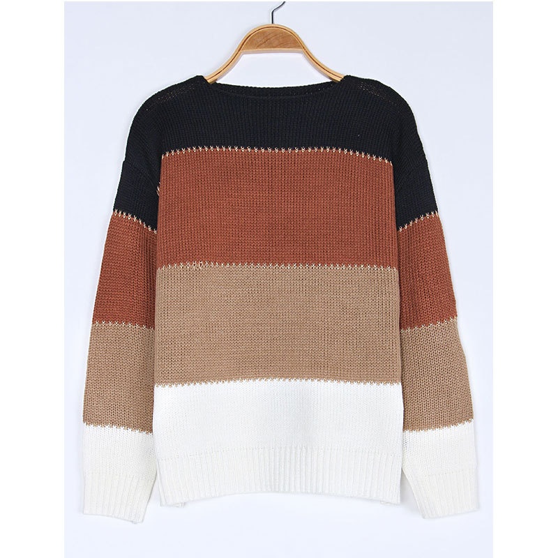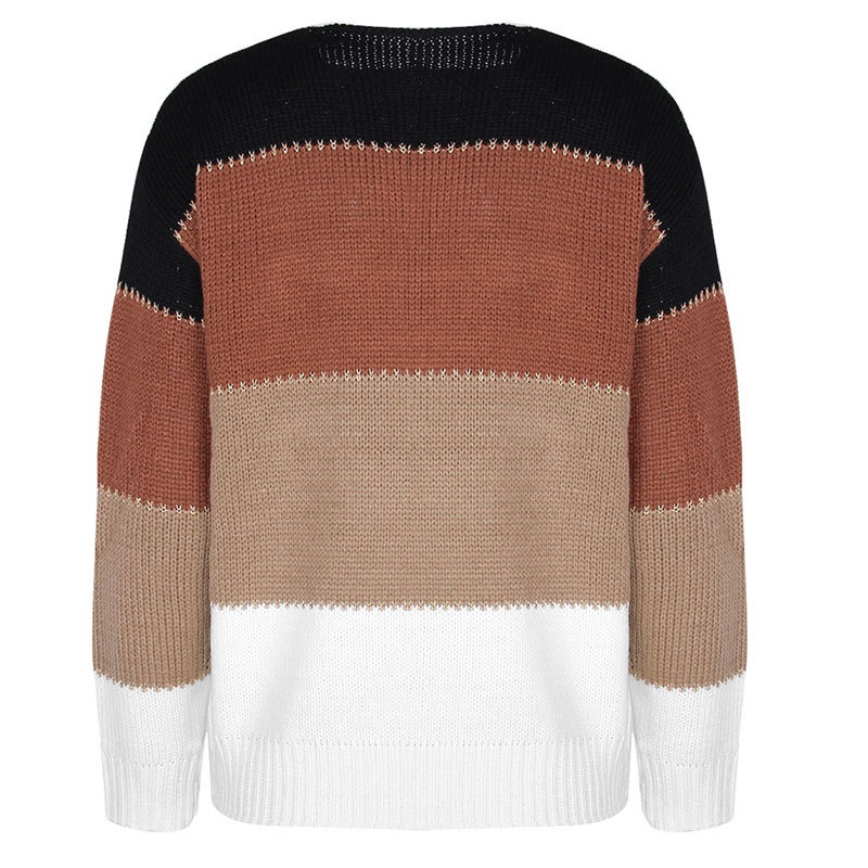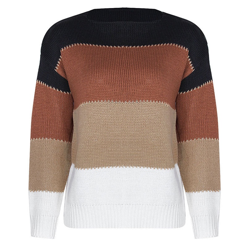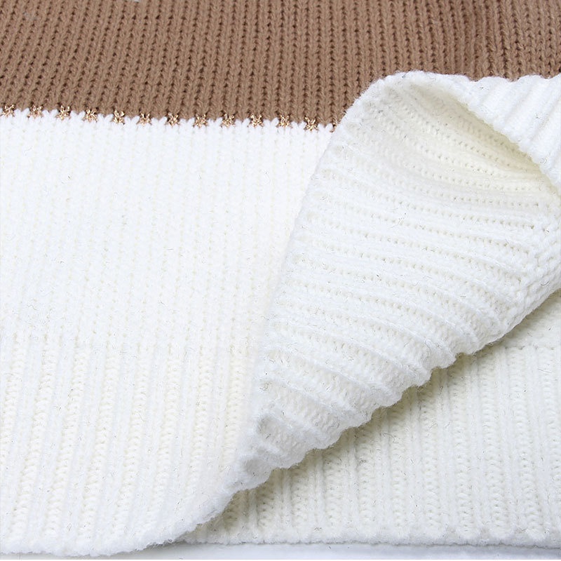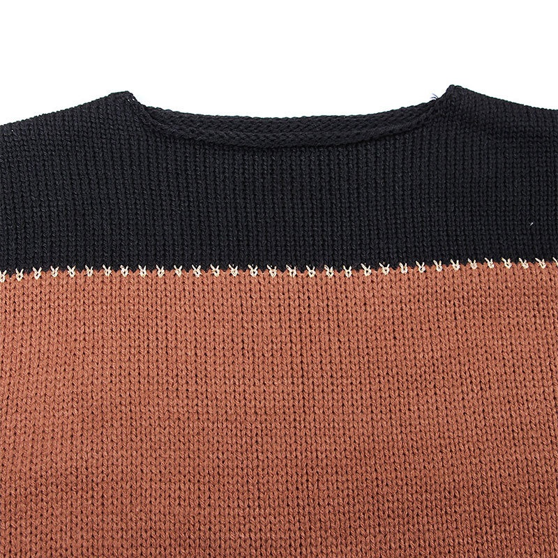 秋冬跨境新款拼接套头打底针织衫上衣休闲撞色圆领毛衣女装