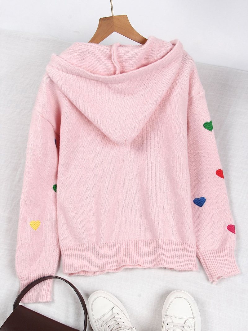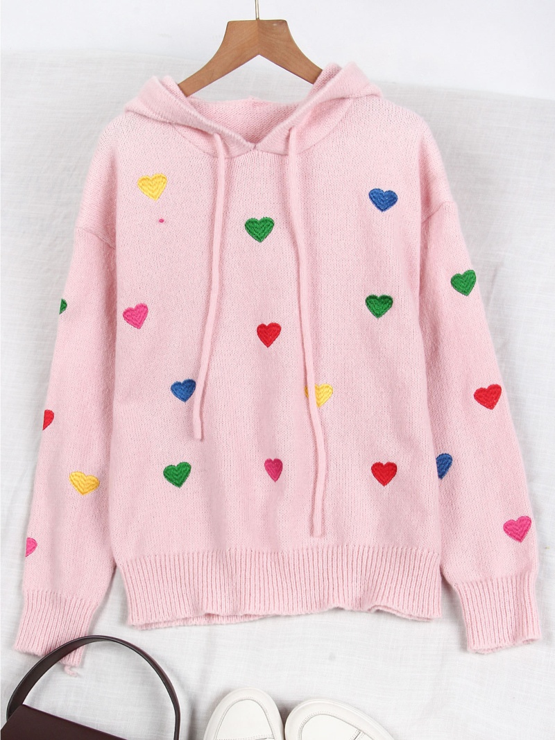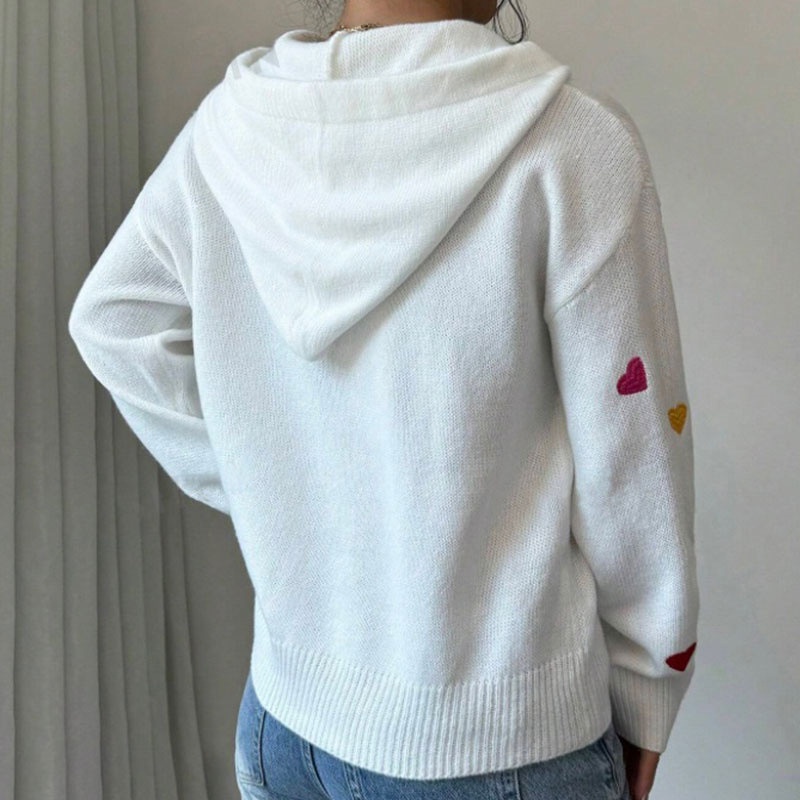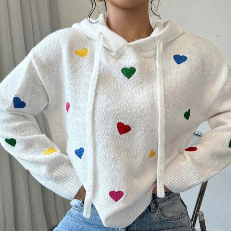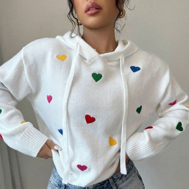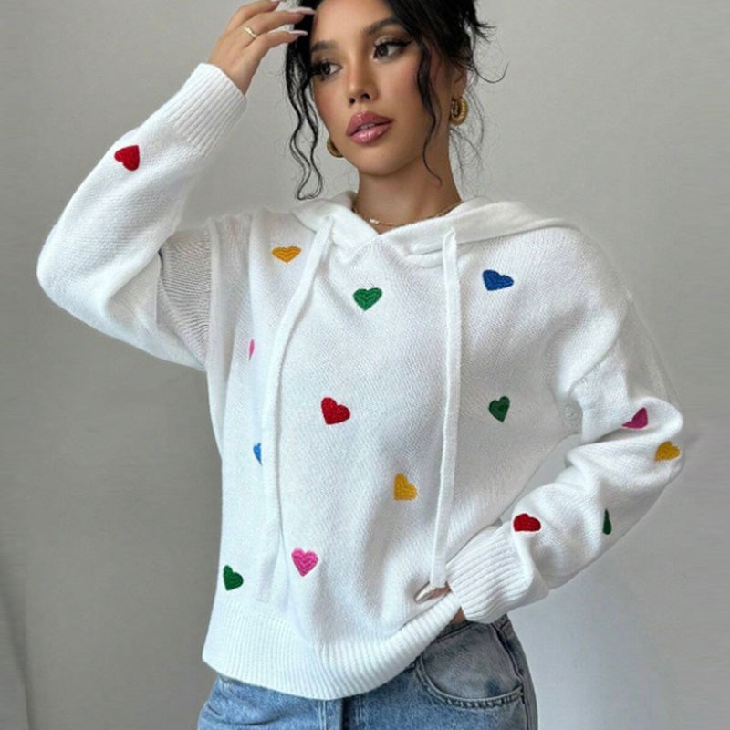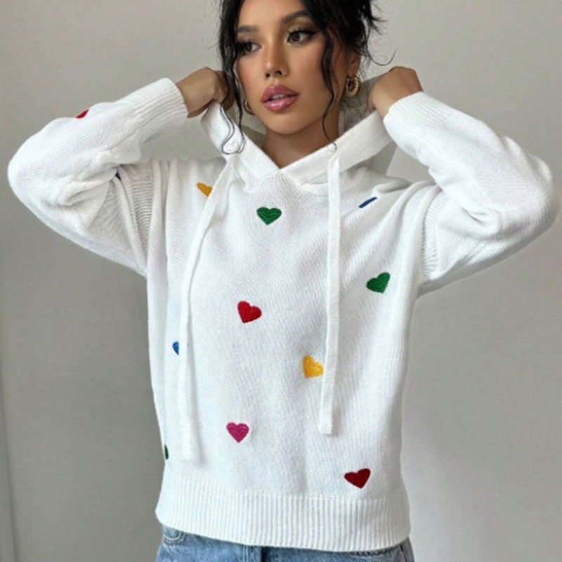 欧美外贸秋冬女款毛衣跨境时尚彩色爱心提花连帽长袖针织衫