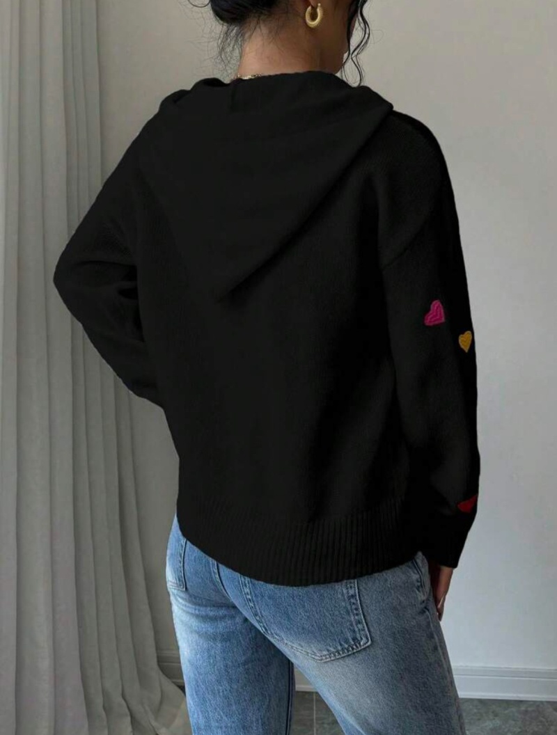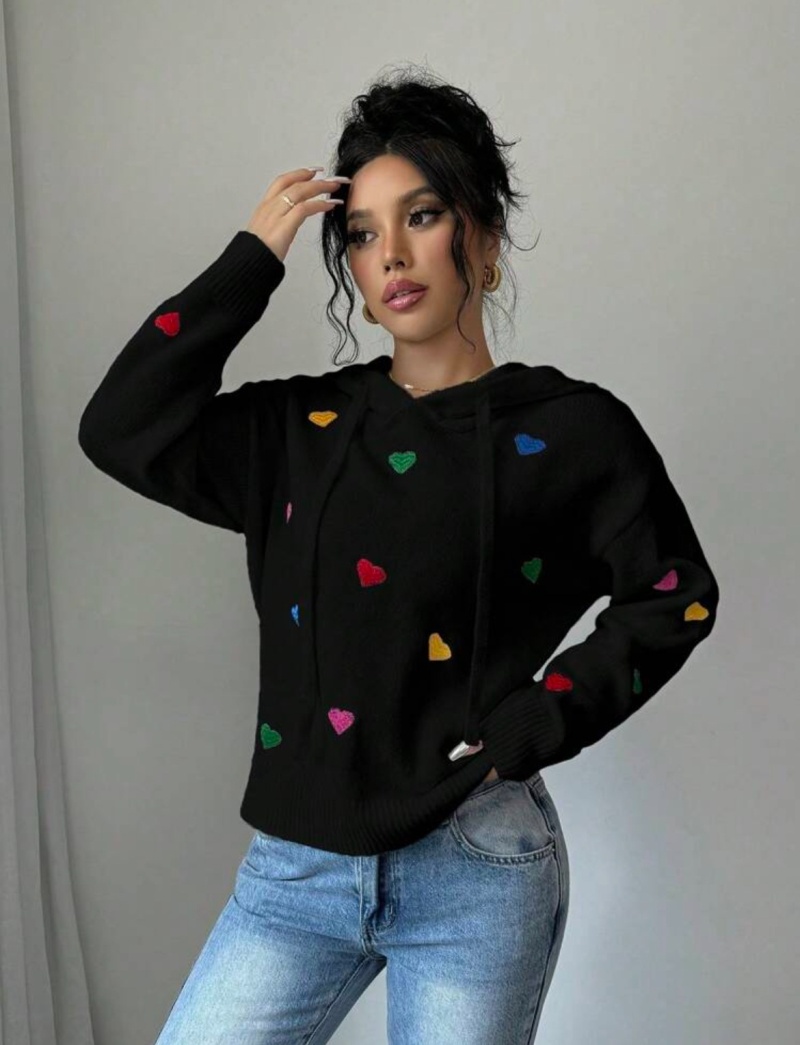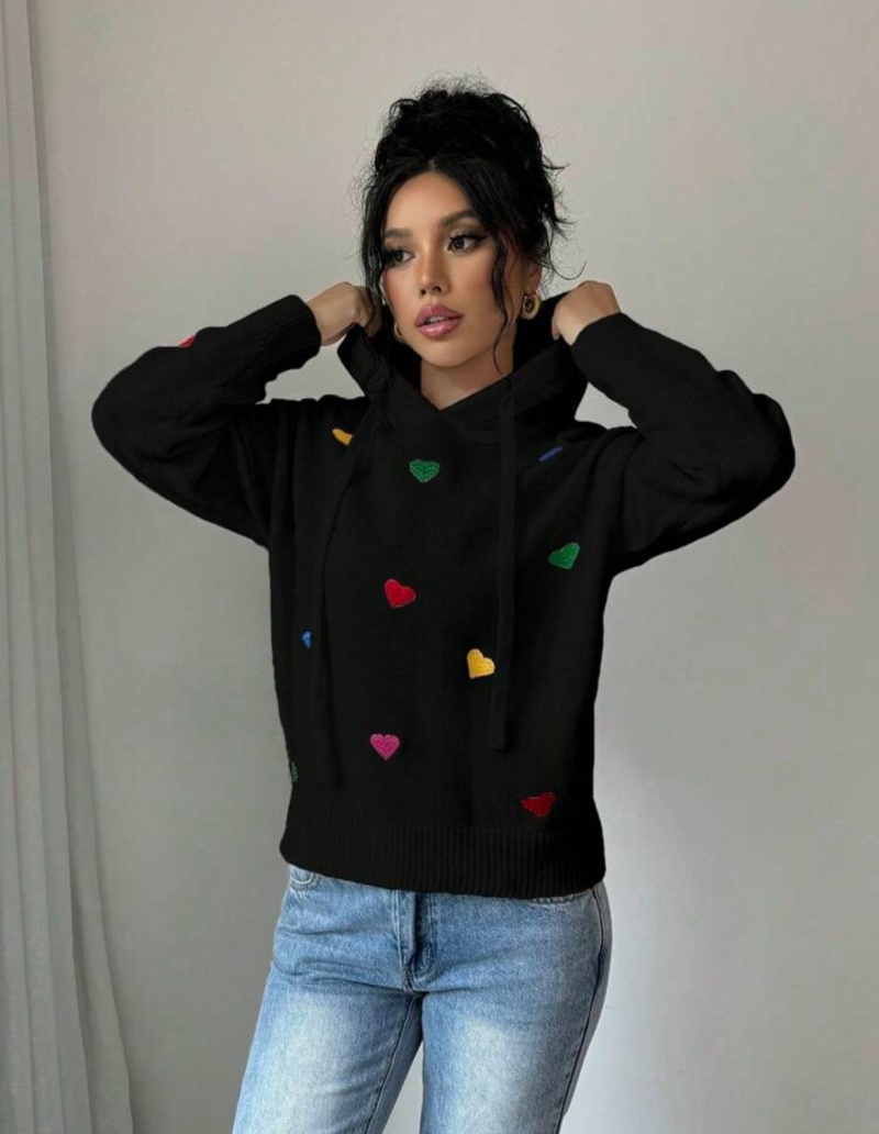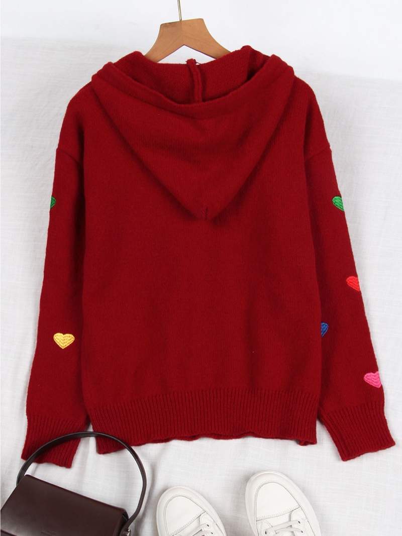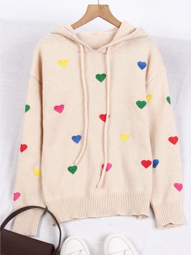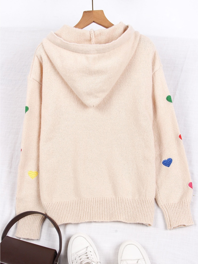 欧美外贸秋冬女款毛衣跨境时尚彩色爱心提花连帽长袖针织衫