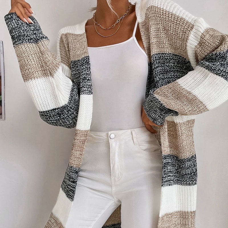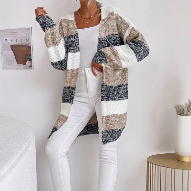 欧美秋季新款宽松毛衣女装跨境条纹撞色开衫针织百搭外套厂