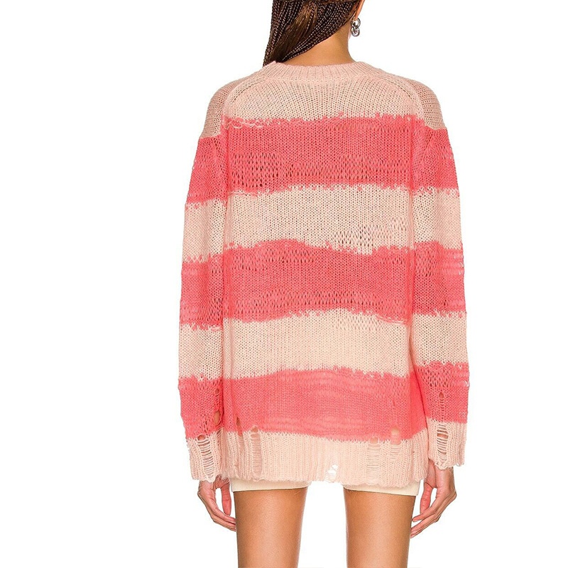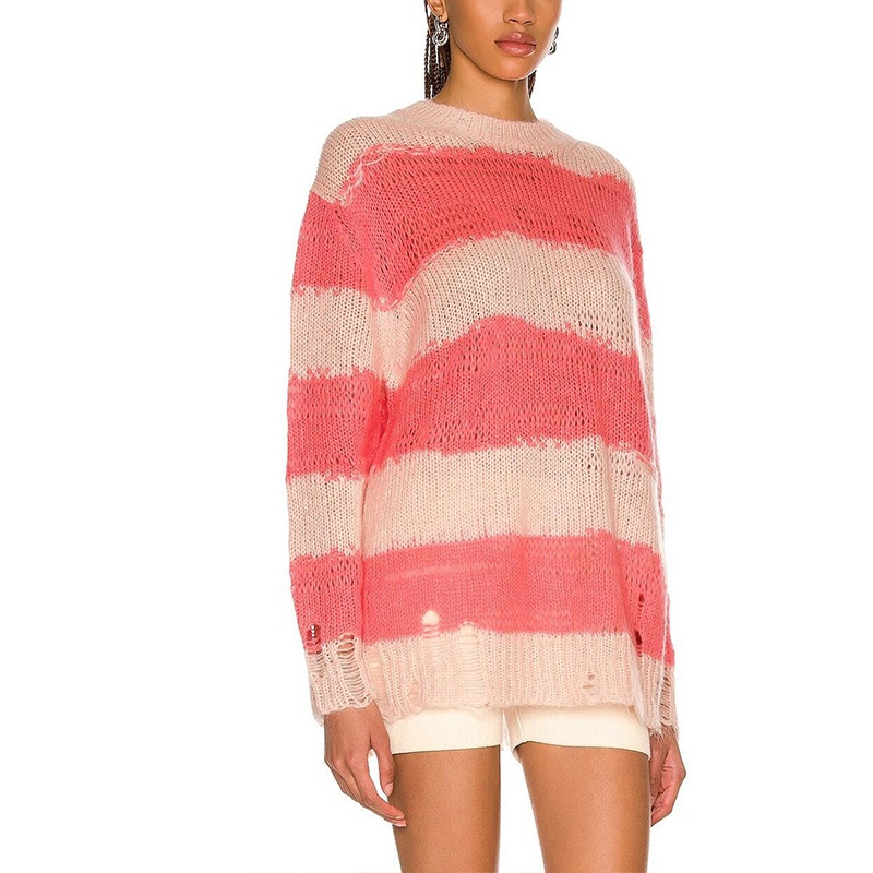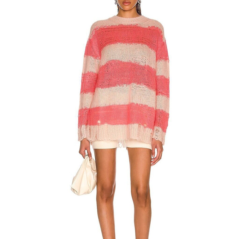 跨境新款欧美早秋毛衣长袖条纹宽松毛衣女慵懒套头圆领针织衫上衣