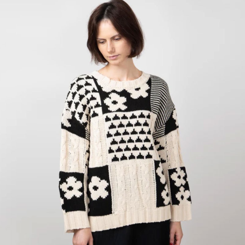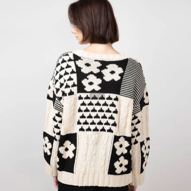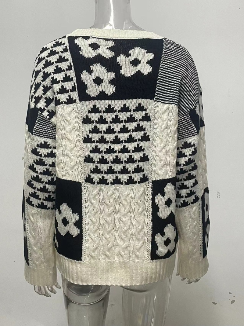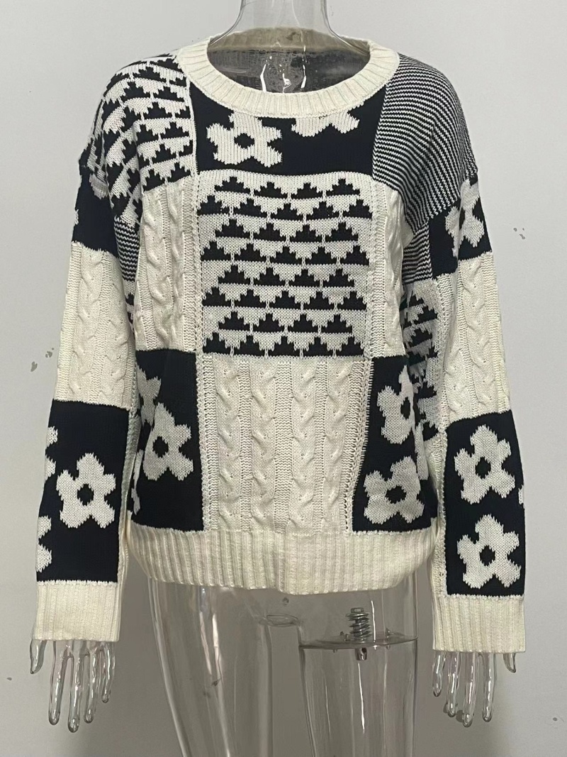 欧美秋冬外贸毛衣女装跨境方块花卉休闲宽松圆领套头针织衫