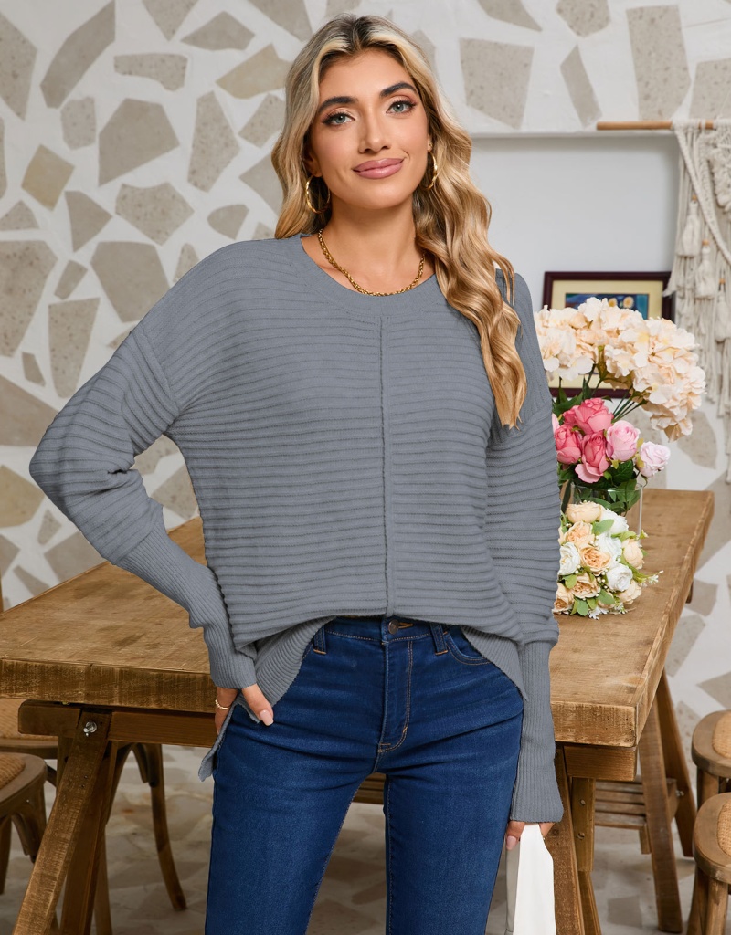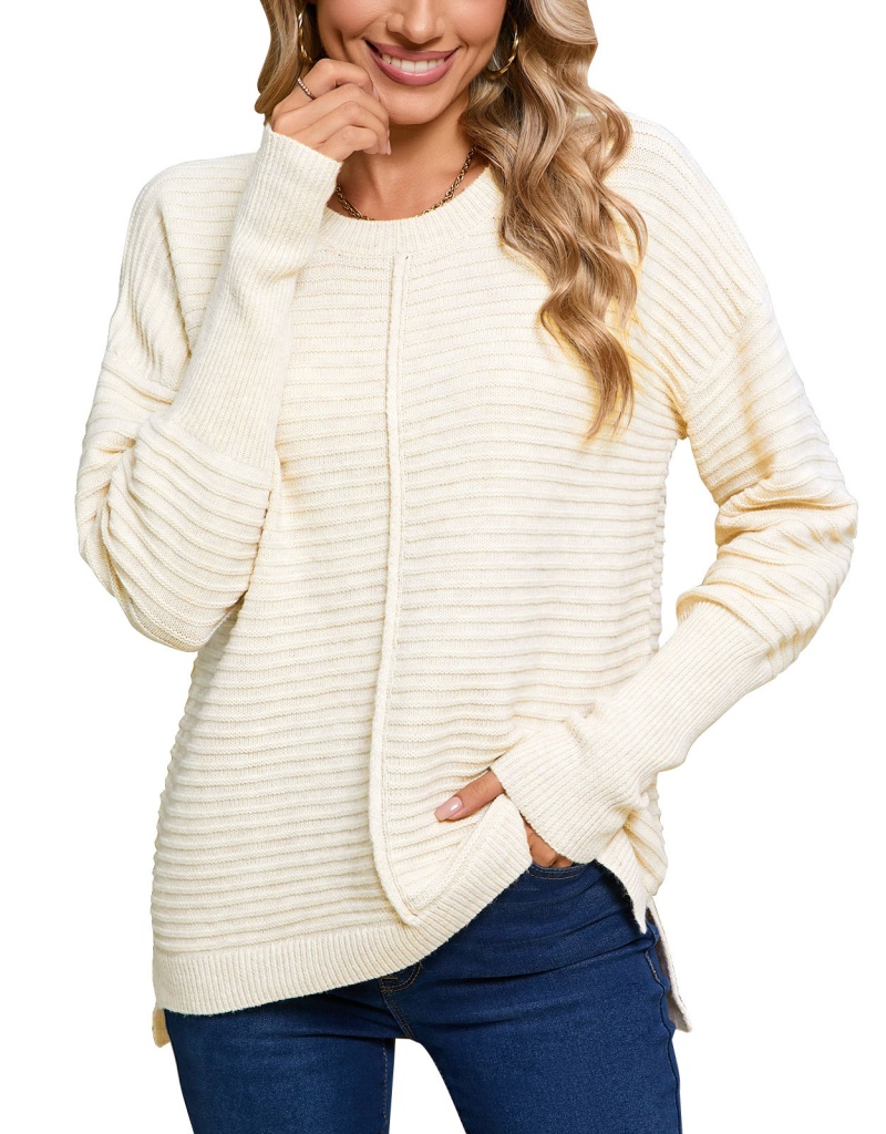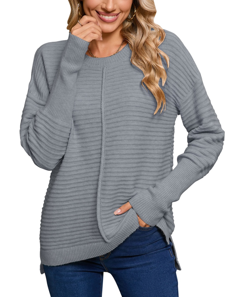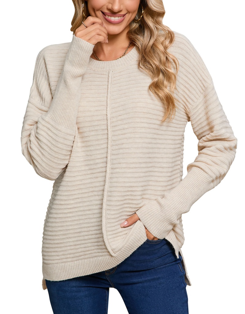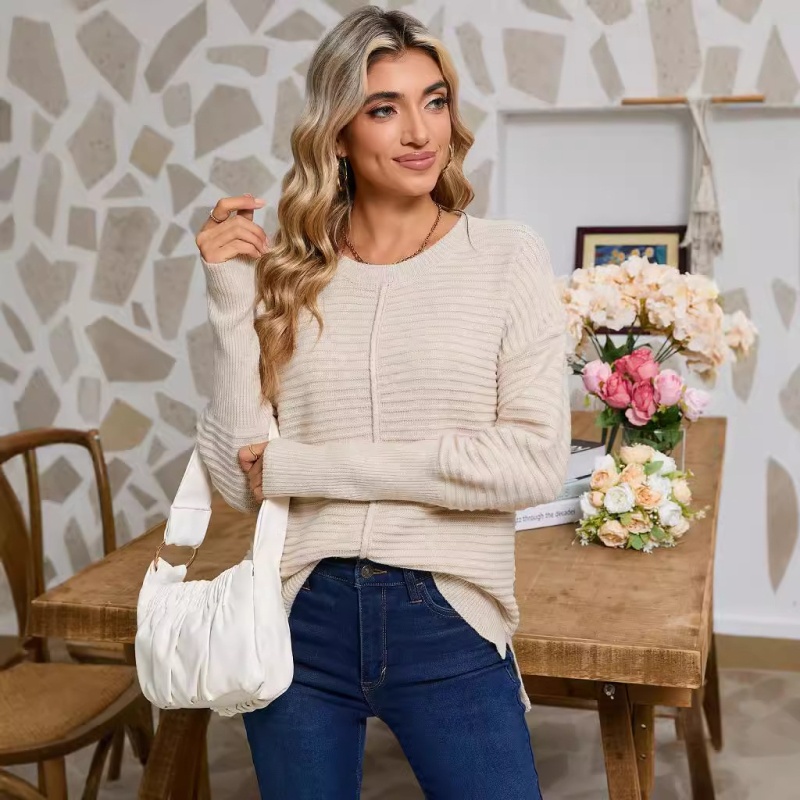 秋季欧美纯色绞纹毛衣女装跨境时尚美式圆领长袖套头针织衫