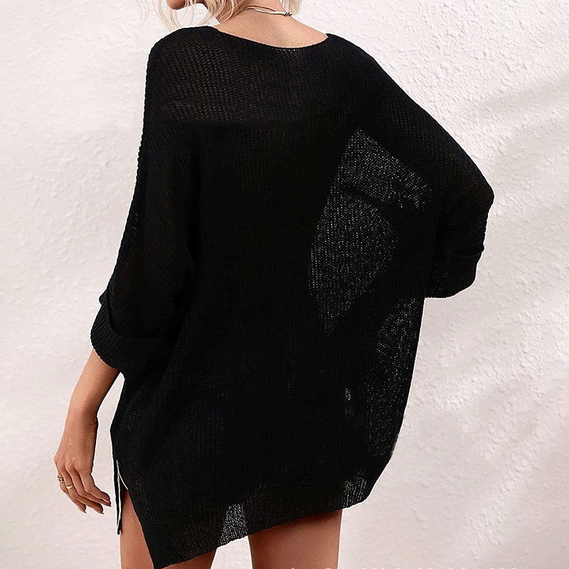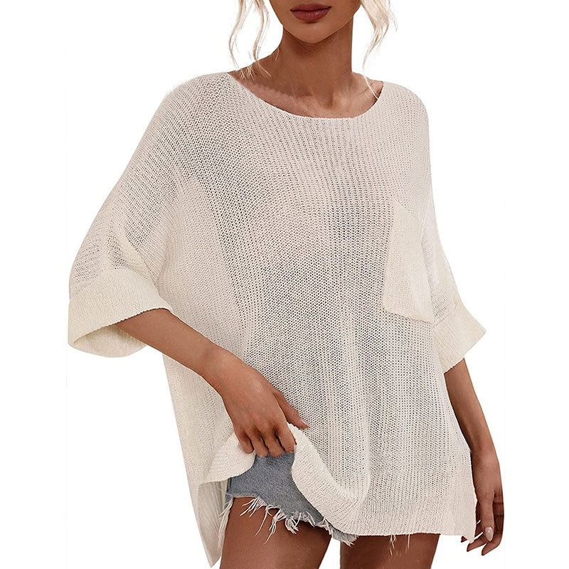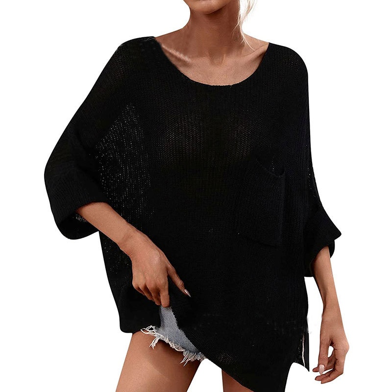 秋季新款欧美宽松套头针织衫个性休闲口袋圆领长袖毛衣女装