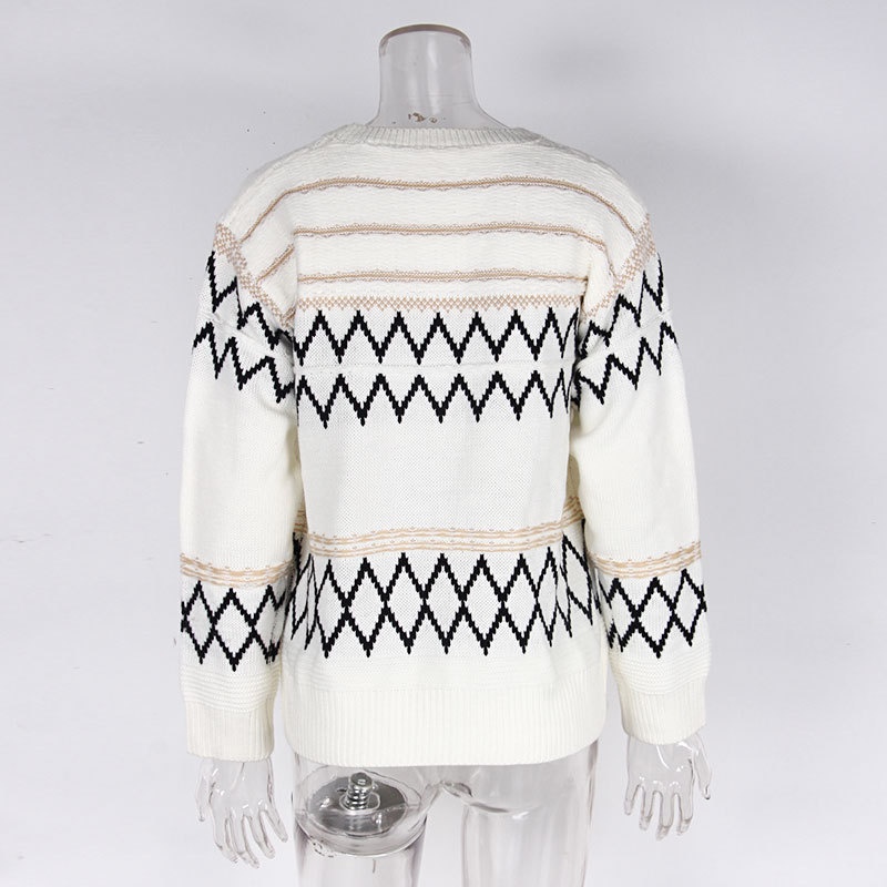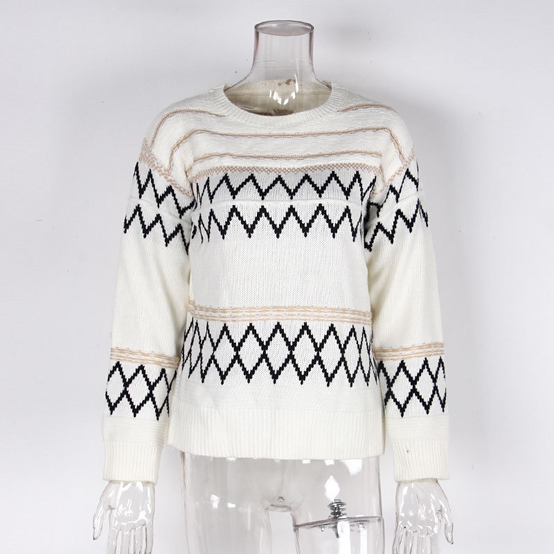 秋冬季新款女装复古菱形图案针织衫时尚大码圆领毛衣女厂家