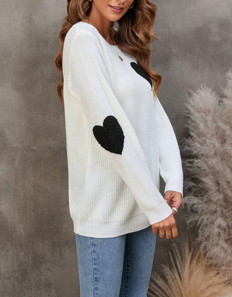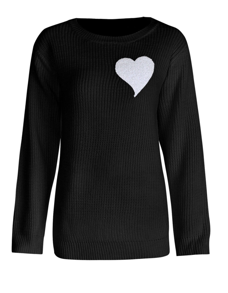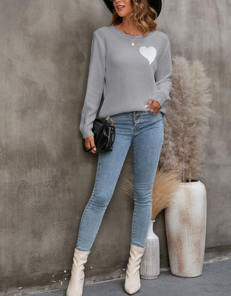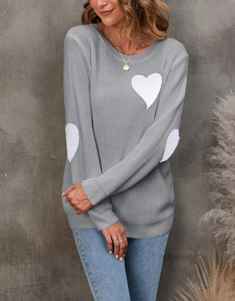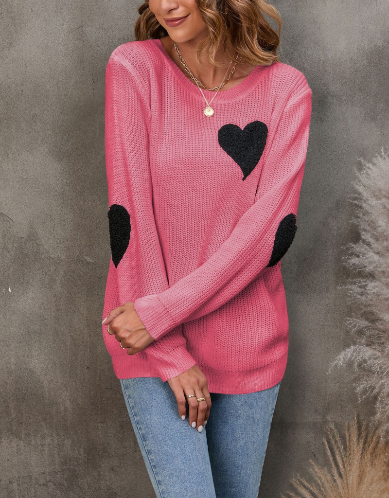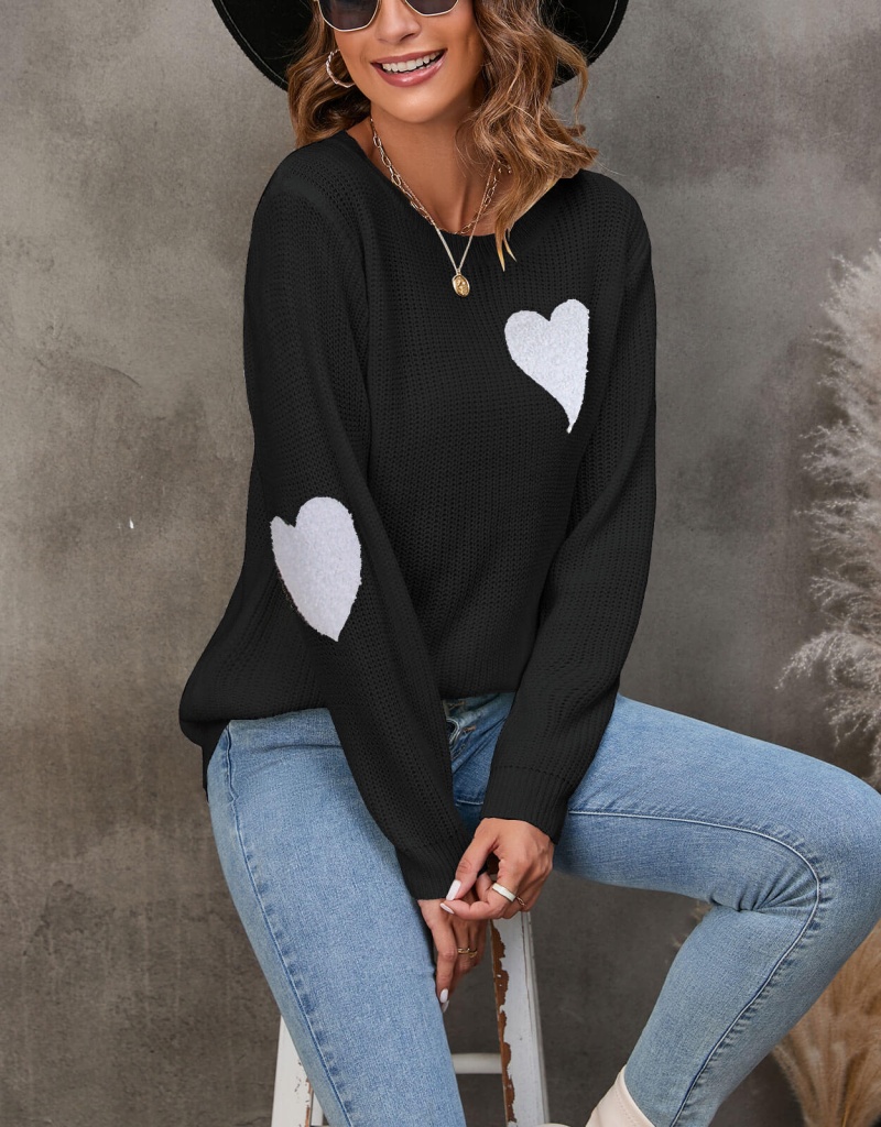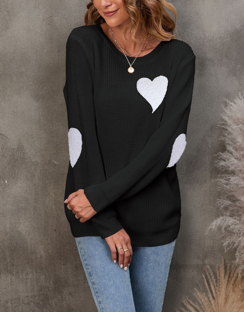 秋冬季新款 跨境圆领纯色小爱心套头宽松毛衣欧美针织衫女