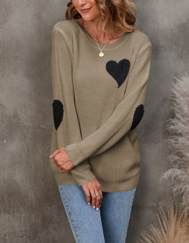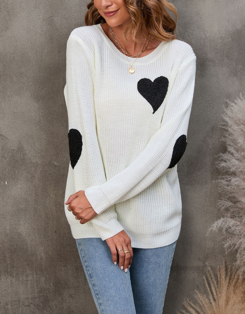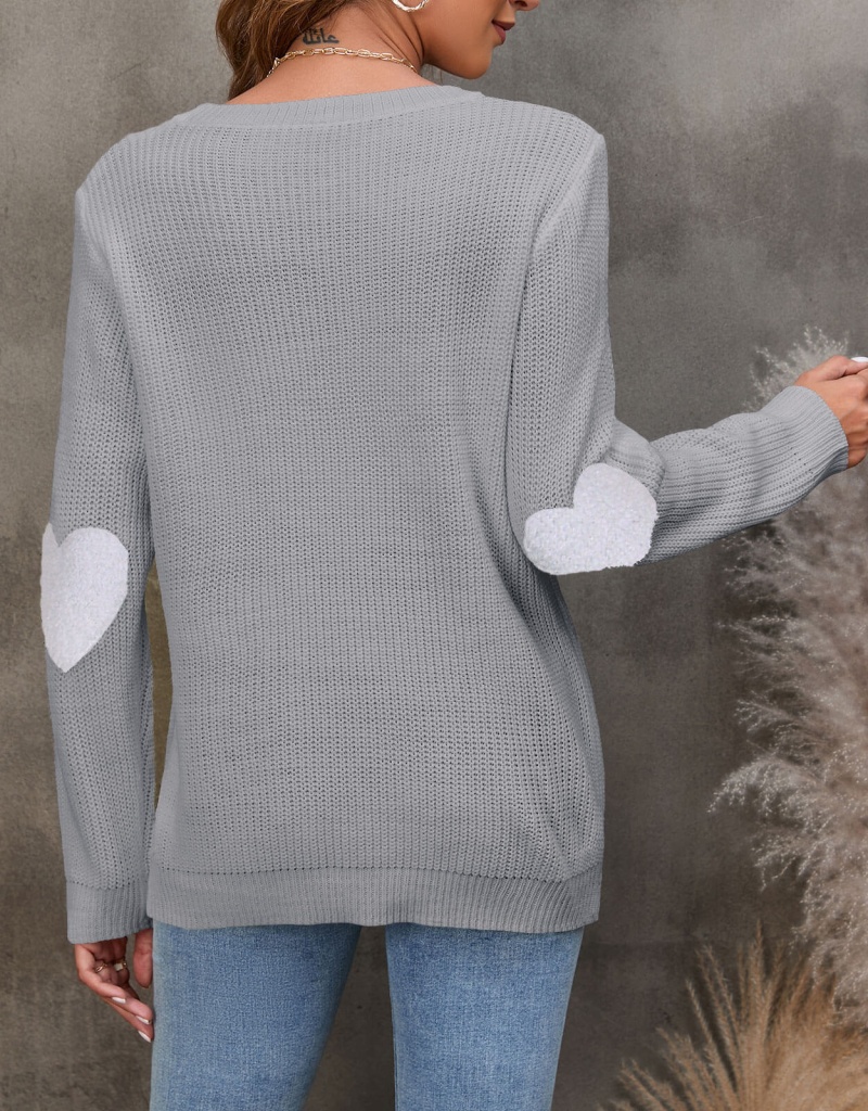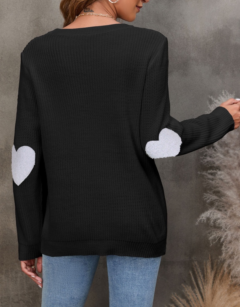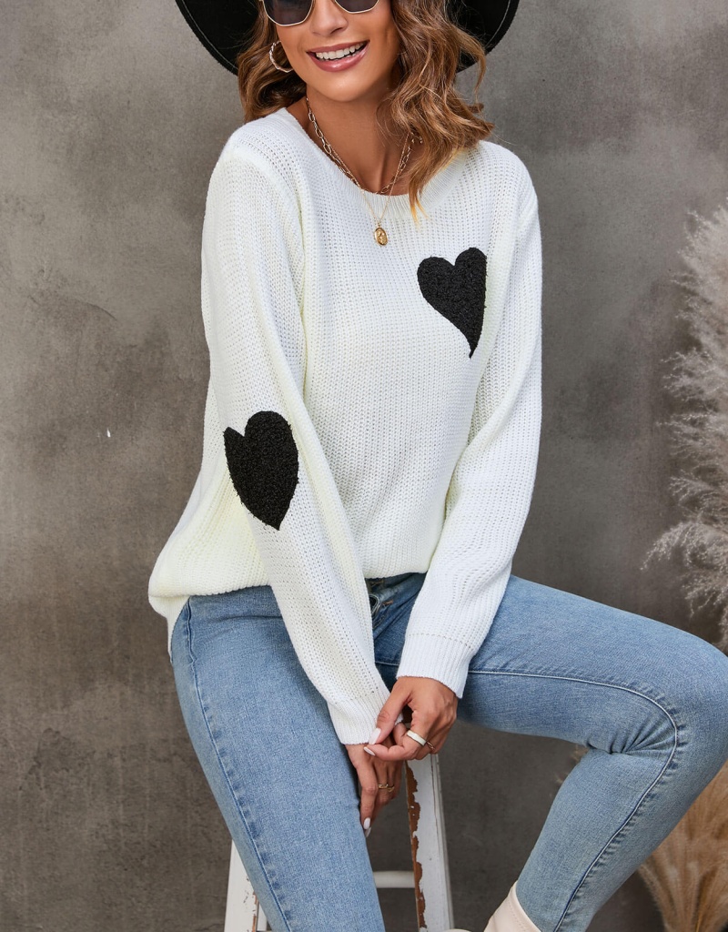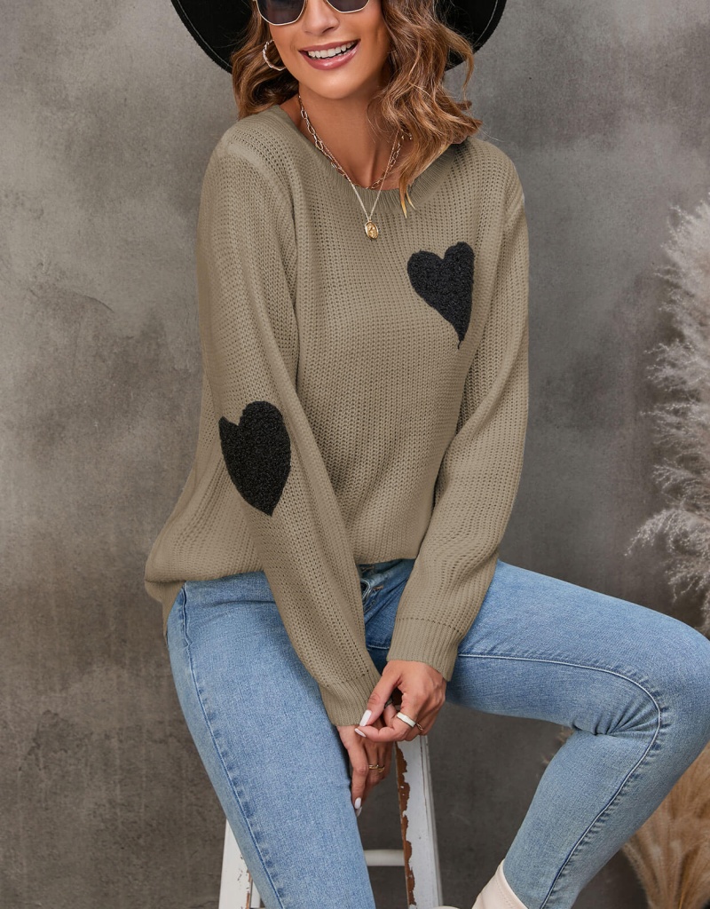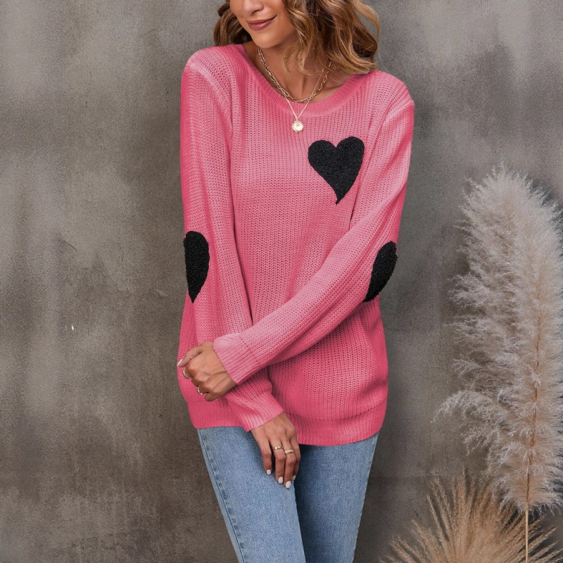 秋冬季新款 跨境圆领纯色小爱心套头宽松毛衣欧美针织衫女